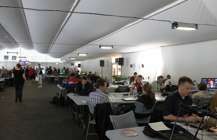„Ja það getur stundum verið svolítið einmanalegt. Ég meina allur íslenski hópurinn er yfirleitt einhversstaðar allt annars staðar heldur en ég," segir Sigmar Guðmundsson, þulur Íslendinga í Eurovisionkeppninni, þegar við hittum hann í fjömiðlaálmunni í Telenor höllinni í Oslo. „Ég bara bið voða vel að heilsa öllum. Segi sko þó að við eigum náttúrulega að styðja okkar íslenska lag þá eigum við samt að halda væntingunum í hófi." Þá má einnig sjá myndir sem við tókum af Sigmari við störf.