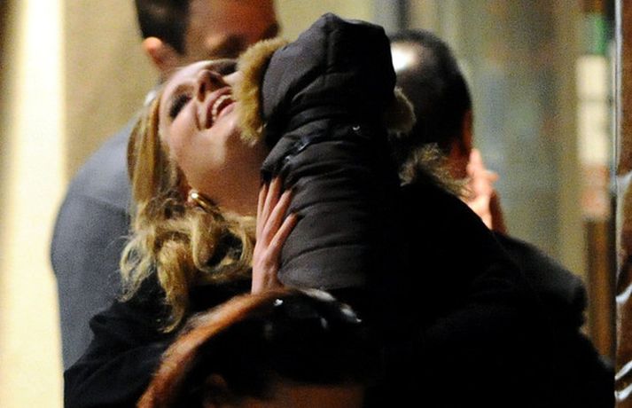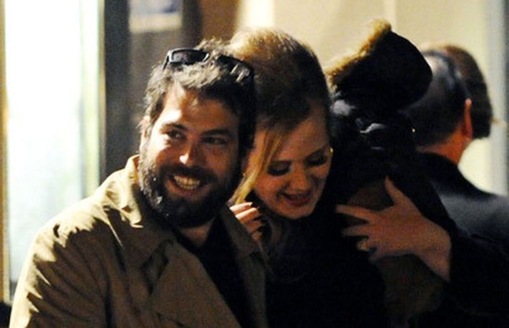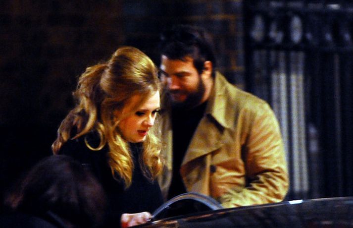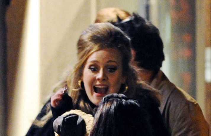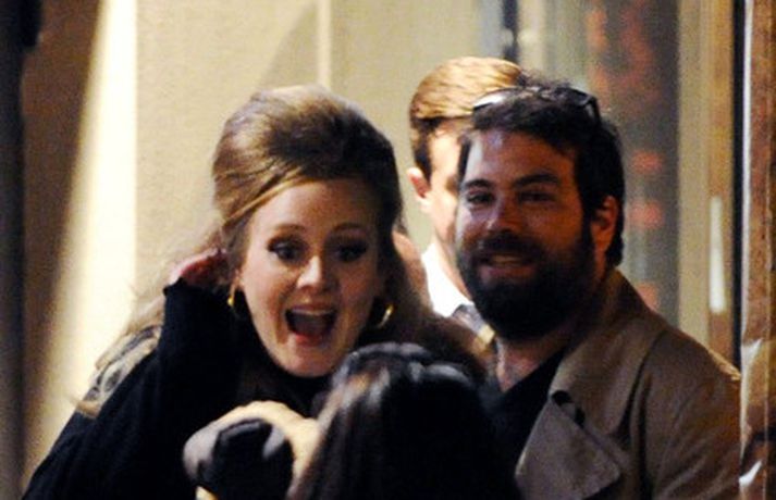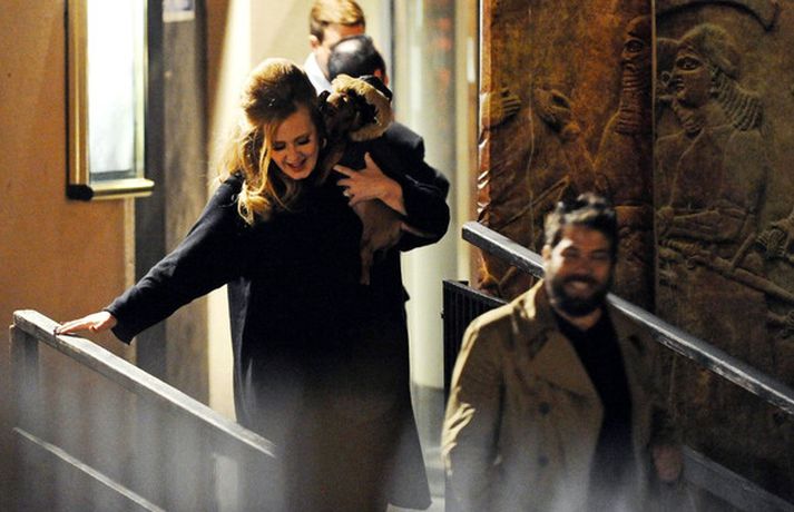 Breska söngkonan Adele, 23 ára og unnusti hennar Simon Konecki, 36 ára, yfirgáfu asískan veitingastað í London á fimmtudaginn var. Eins og sjá má á myndunum knúsar parið krúttlegan hund klæddan í úlpu sem varð á vegi þeirra. Adele er tilnefnd til sex Golden Globe verðlauna í ár og þar á meðal fyrir plötu ársins.