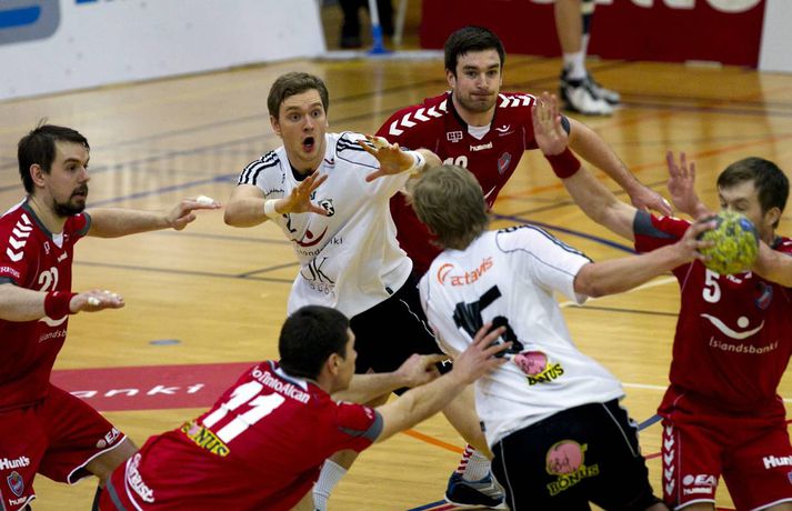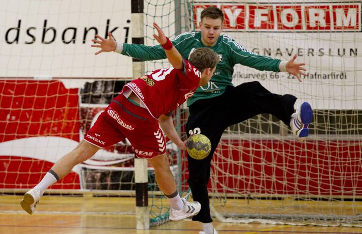 Haukar eru komnir í úrslit Eimskipsbikarsins í handknattleik eftir sigur á erkifjendunum í FH. Lokatölurnar urðu 22-14 eftir að staðan í hálfleik var 10-10. Vörn og markvarsla Arons Rafns Eðvarssonar í síðari hálfleik lögðu grunninn að sigri Hauka. FH-ingar skoruðu aðeins fjögur mörk í síðari hálfleiknum. Það var ljóst frá fyrstu mínútu að það var meira undir í þessum leik en í viðureign liðanna í deildinni fyrr í vikunni. Báðar varnir gengu vasklega fram sem gerði nokkuð taugatrekkum sóknarmönnum beggja liða erfitt fyrir. Þá vantaði ekki lætin í stúkunni og lét stuðningsmenn á báðum hliðum vel í sér heyra. Fyrri hálfleikurinn var nokkuð jafn en um hann miðjan náðu Haukarnir tveggja marka forystu sem þeim hélst nokkuð þægilega á. Mest var forystan þrjú mörk en FH-ingarnir sýndu styrk undir lok hálfleiksins og jöfnuðu loks 10-10. Sú var staðan er gengið var til búningsherbergja. Umdeilt atvik átti sér stað seint í fyrri hálfleik. Þá varði Daníel Freyr víti frá Stefáni Rafni með höfðinu. Boltinn sneiddi höfuð Daníels og skoppaði af því yfir markið. FH-ingar vildu að Stefán fengi rautt spjald fyrir að skjóta í höfuð markvarðar úr vítakasti en dómararnir voru ekki sammála. Óhætt er að segja að leikurinn hafi tekið óvænta stefnu í síðari hálfleik. Aron Rafn kom í mark Haukanna og við tók löng bið FH-inga eftir marki. Fyrsta mark þeirra í hálfleiknum kom eftir 13 mínútna leik og það næsta eftir 23 mínútna leik þegar þeir minnkuðu muninn í 18-12. Þegar upp var staðið í síðari hálfleiknum hafði FH aðeins skorað fjögur mörk sem dugar ekki til að vinna handboltaleik. Haukar lönduðu öruggum sigri 22-14 og eru komnir í bikarúrslit. Það kemur í ljós annað kvöld hvort andstæðingar Hauka í úrslitum verða HK eða Fram. Aron Rafn: Aldrei verið jafnspenntur fyrir leik FH„Á mínum yngri árum var ég pirraður að byrja ekki leikina. Ég held að það hafi bara þroskast af mér. Nú reyni ég að vera á tánum. Þegar þú kemur inn af bekknum þarftu að standa þig því oftast hefur hinn markvörðurinn ekki verið að standa sig," sagði Aron Rafn og hrósaði Birki fyrir hans frammistöðu fram að brottvísuninni. „Birkir er klassa markvörður og var góður í dag eins og á fimmtudaginn. Hann hegðaði sér reyndar ekki eins og reynslumesti maður vallarins þegar hann sagði dómurunum til syndanna undir lok fyrri hálfleiksins," sagði Aron Rafn í gamansömum tón en brottvísun Birkis Ívars varð til þess að Aron kom inn á. FH skoraði aðeins fjögur mörk í öllum seinni hálfleiknum. Ótrúlega lágt markaskor í nútíma handbolta. „Vörnin var fáránlega góð. Freysi, Matti, Svenni, Stebbi og Gylfi, það voru bara allir fáránlega góðir og staðráðnir að vinna þennan leik. Við gáfum okkur alla í leikinn vitandi það að þetta væri úrslitaleikur. Það verður gaman að spila í Laugardalshöllinni," sagði Aron sem var ánægður með að kvitta fyrir tapið gegn FH í deildinni á fimmtudag. „Ég svaf bara í þrjá tíma nóttina eftir tapið á fimmtudaginn, ég var svo svekktur. Ég held ég hafi aldrei verið jafnspenntur fyrir leik gegn FH að geta svarað fyrir þann leik," sagði maður leiksins. Andri Berg: Aron ver hreinlega alltÞjálfarar og leikmenn FH voru fljótir að koma sér inn í klefa í leikslok. Andri Berg Haraldsson gaf sér þó tíma til að ræða við blaðamann. Liðin mættust í deildinni á fimmtudag og var staðan í hálfleik þá 10-10 líkt og nú. Þá tóku FH-ingar völdin í síðari hálfleik en áttu ekkert svar í dag. „Þetta snerist við. Við áttum seinni hálfleikinn síðast en þeir núna. Aron ver hreinlega allt í markinu, reyndar ekki góð skot hjá okkur en þeir ganga bara á lagið," sagði Andri Berg. Leikmenn FH gerðu sig seka um ótal mistök í sóknarleiknum. Þeir töpuðu boltanum á klaufalegan hátt og náðu ekki að skapa sér góð færi. Andri var ekki viss um að hjartslátturinn hefði verið örari í þessum leik vegna þess hvað var í húfi. „Þessir Hafnarfjarðarleikir eru auðvitað svakalegir en við ætluðum bara að vinna þennan leik eins og þann seinasta. Það var kannski meira í húfi en þeir voru bara betri," sagði Andri Berg. „Þetta var stirrt hjá okkur í sókninni og þeir ganga á lagið í vörninni. Svo ver hann auðvitað allt í markinu," sagði Andri sem var beðinn um að finna eitthvað jákvætt við frammistöðu FH-inga. „Markvarslan er alltaf góð hjá okkur og vörnin þokkaleg. En þegar sóknarleikurinn er svona þarf vörnin að vera ennþá betri," sagði Andri sem segir leiðinlegt að komast ekki í bikarúrslit en enn verra að Haukar fari þangað í þeirra stað. „Já, það er ömurlegt. Það verður bara að halda með hinu liðinu sem verður vonandi Fram." Aron Kristjáns: Erfitt að ákveða hver byrjar í markinu„Ég vil fyrst og fremst hrósa liðinu fyrir frábæra baráttu. Við hirðum alla lausa bolta, vörnin er mjög þétt og markverðirnir vörðu mun betur en á fimmtudaginn," sagði kampakátur Aron Kristjánsson, þjálfari Hauka, í leikslok. „Því má ekki gleyma að Daníel varði vel í FH-markinu. Við töluðum samt mikið um að þora að taka færin okkar, halda áfram öguðum leik og ekki láta það á okkur fá þó hann væri að verja. Það var auðvitað mjög ánægjulegt," sem gat þó ekki annað en hrósað Aroni Rafni sérstaklega. Aron Rafn stóð vaktina í marki Hauka í síðari hálfleik og því sem næst lokaði því. Aron þjálfari sagði að sér hefði verið vandi á höndum fyrir leikinn að ákveða hvor markvörðurinn myndi byrja. „Okkur var vandi á höndum fyrir leikinn að ákveða hvor markvörðurinn ætti að byrja. Það liggur við að það þurfti að kasta upp peningi," sag