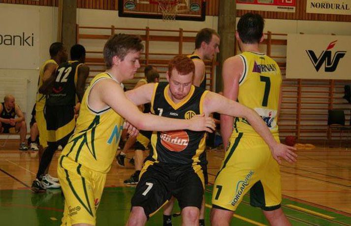 Skallagrímur er kominn með forystu í einvíginu gegn ÍA um laust sæti í efstu deild karla í körfuknattleik. Borgnesingar lögðu Skagamenn 91-82 í fyrsta leik liðanna í Borgarnesi í gærkvöldi. Gríðarlega góð stemmning var í Fjósinu í gærkvöldi. Um 750 manns troðfylltu íþróttahúsið hálftíma fyrir leik og var brugðið á það ráð að flytja yngra fólk að hliðarlínunni að því er fram kemur á heimasíðu Skallagríms. Heimamenn höfðu tíu stiga forystu í hálfleik og létu hana aldrei af hendi. Þeir eru í góðri stöðu fyrir næstu viðureign liðanna á Akranesi á sunnudag. Sigur þar tryggir Borgnesingum sæti í efstu deild.Skallagrímur-ÍA 91-82 (50-40) Tölfræði Skallagríms: Lloyd Harrison 32/6 fráköst/6 stoðsendingar, Danny Rashad Sumner 15/7 fráköst/4 varin skot, Darrell Flake 13/11 fráköst/10 stoðsendingar, Hörður Helgi Hreiðarsson 10/5 fráköst, Egill Egilsson 8, Davíð Guðmundsson 6, Sigmar Egilsson 5/5 fráköst, Elvar Þór Sigurjónsson 2. Tölfræði ÍA: Lorenzo Lee McClelland 35/8 fráköst/6 stoðsendingar, Terrence Watson 15/16 fráköst, Áskell Jónsson 12/4 fráköst, Hörður Kristján Nikulásson 10/6 fráköst, Dagur Þórisson 7, Sigurður Rúnar Sigurðsson 2/4 fráköst, Trausti Freyr Jónsson 1.