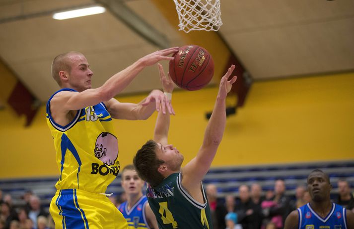 Umfjöllun, viðtöl og myndir: Fjölnir - Skallagrímur 70-91 Óskar Ófeigur Jónsson skrifar 18. október 2012 12:31 Nýliðar Skallagríms fögnuðu sínum þriðja sigri í röð í deild og bikar í kvöld þegar liðið sótti tvö stig í Grafarvoginn og varð fyrsta liðið til þess að vinna Fjölni í Dominos-deildinni í vetur. Skallagrímsliðið yfirspilaði Fjölnismenn í fyrsta leikhlutanum og vann að lokum með 21 stigs mun, 91-70. Fjölnismenn voru búnir að vinna tvo fyrstu deildarleiki sína en tap á Króknum í Lengjubikarnum hafði greinilega slæm áhrif á Grafarvogspilta sem voru bitlausir stærsta hluta leiksins í kvöld. Skallagrímsliðið er hinsvegar komið á sigurbraut og duttu greinilega í lukkupottinn þegar þeir náðu samningum við hinn litríka Haminn Quaintance. Skallagrímsliðið komst í 16-4 og vann fyrsta leikhlutann 33-16. Fjölnismenn náðu aðeins að laga stöðuna en tókst aldrei að koma sér aftur inn í leikinn. Borgnesingar skoruðu lengstum af vild enda vantaði mikið upp á baráttuandann í Fjölnisliðinu og þá sérstaklega varnarlega. Skallagrímsliðið fékk hinsvegar framlag frá mörgum mönnum og sigur liðsins var aldrei í hættu eftir þennan frábæra fyrsta leikhluta. Carlos Medlock og Haminn Quaintance fóru á kostum í liði Skallagríms í kvöld, Medlock skoraði 29 stig og Quaintance var með 20 stig. Hjá Fjölni var Sylverster Spicer atkvæðamestur en annars voru margir leikmenn liðsins langt frá sínu besta.Fjölnir-Skallagrímur 70-91 (16-33, 25-24, 19-16, 10-18)Fjölnir: Sylverster Cheston Spicer 24/10 fráköst, Christopher Matthews 13, Árni Ragnarsson 10/4 fráköst, Tómas Heiðar Tómasson 8, Jón Sverrisson 6/7 fráköst, Björgvin Hafþór Ríkharðsson 4, Leifur Arason 3, Gunnar Ólafsson 1, Arnþór Freyr Guðmundsson 1 .Skallagrímur: Carlos Medlock 29, Haminn Quaintance 20/10 fráköst/5 stoðsendingar/6 stolnir, Páll Axel Vilbergsson 11/4 fráköst, Trausti Eiríksson 10/7 fráköst, Orri Jónsson 6, Davíð Ásgeirsson 5, Birgir Þór Sverrisson 4/4 fráköst, Atli Aðalsteinsson 3, Sigmar Egilsson 3. Trausti: Hann er búinn að koma þessu upp á annað getustig hjá okkurTrausti Eiríksson og félagar í Skallagrími léku vel í kvöld og allir leikmenn liðsins voru að skila sínu í þessum leik. Trausti skoraði 10 stig og tók 7 fráköst á móti sínum gömlu félögum í Fjölni. "Það gekk bara allt upp hjá okkur og þetta var bara okkar dagur. Við ætlum allir að hafa gaman af þessu, gera okkar besta í hverjum einasta leik og hugsa bara um einn leik í einu. Ef það tekst þá kemur þetta allt saman hjá okkur," sagði Trausti. "Við hittum úr öllu í fyrsta leikhlutanum og ég held að við höfum ekki klikkað á mörgum skotum í leikhlutanum enda skoruðum við 33 stig í honum. Við reyndum síðan að byggja ofan á það því við getum spilað fínan varnarleik þegar þetta gengur vel hjá okkur. Það er því erfitt fyrir hin liðin að vinna þetta upp ef við erum komnir með svolítið forskot," sagði Trausti en Skallagrímsliðið er nú búið að vinna þrjá leiki í röð. "Við erum að sýna stöðugleika í undanförnum leikjum. Við vorum frekar slappir í fyrsta leiknum á Ísafirði en við fengum inn stóra kanann okkar eftir það. Hann er búinn að koma þessu upp á annað getustig hjá okkur. Hann er mjög góður liðsmaður, mjög naskur varnarmaður og svo er hann líka kátur í klefanum," sagði Trausti um hinn magnaða Haminn Quaintance. Það var enginn í Skallagrímsliðinu smeykur að láta til sína taka í kvöld og ungu strákarnir stóðu sig vel. "Það er stígandi í þessu þótt við höfum misst þrjá leikmenn í meiðsli. Hinir verða bara að stíga upp á meðan. Það þýðir ekkert að koma inn á völlinn til þess að vera í einhverjum feluleik. Við verðum bara allitr að kýla á þetta og gera okkar besta," sagði Trausti. Jón Sverris: Við erum miklu betri en þetta Fjölnismaðurinn Jón Sverrisson var að vonum svekktur í leikslok enda voru Fjölnismenn ekki líkir sjálfum sér í þessum leik. "Við mætum ekki klárir í leikinn og ég veit ekki í rauninn hvað ég get sagt. Kannski fór þessi góða byrjun alltof vel í okkur því við erum ekki vanir þessu. Við vorum búnir að vinna tvo fyrstu leikina og allt í einu komnir upp á einhvern stjörnuhiminn því okkur var fleykt niður á jörðina í kvöld," sagði Jón Sverrisson. "Við verðum bara að mæta klárir í leikina. Um leið og hausinn er klár og við í góðu skapi þá vinnum við öll þessi lið. Ef við mætum ekki tilbúnir þá bara skíttöpum við fyrir liðinu sem var að koma upp. Það er bara skiljanlegt að okkur sé spáð svona neðarlega ef við getum ekki spilað betur en þetta. Við verðum bara að rífa okkur upp núna," sagði Jón mjög ósáttur. "Það er oft erfitt að koma til baka. Við lentum samt fimmtán stigum undir á móti KR en komum til baka og unnum þann leik. Fyrir mér er það engin afsökun að hafa byrjað leikinn svona illa. Við þurfum bara að vinna í okkar málum og koma miklu sterkari til leiks í næsta leik. Við erum miklu betri en þetta en við erum ekki betri ef við getum ekki sýnt það. Ég lofa því að við munum sýna það," sagði Jón. Pálmi Þór: Það eru allir tilbúnir í sitt hlutverkPálmi Þór Sævarsson, þjálfari Skallagríms, er að stíga sín fyrstu skref sem þjálfari í efstu deild og liðið er að blómstra hjá honum eins og sást í sannfærandi sigri á Fjölni í kvöld. "Ég er hæstánægður með þetta. Við mættum tilbúnir frá fyrstu mínútu og það var sama hver kom inn á því það voru allir klárir í slaginn. Við lögðum okkur hart fram í að spila góða vörn og ef þú spilar góða vörn þá færðu auðveldar körfur í kjölfarið," sagði Pálmi. "Það eru allir í liðinu tilbúnir í þett