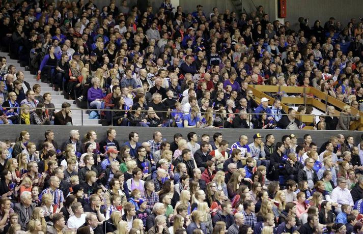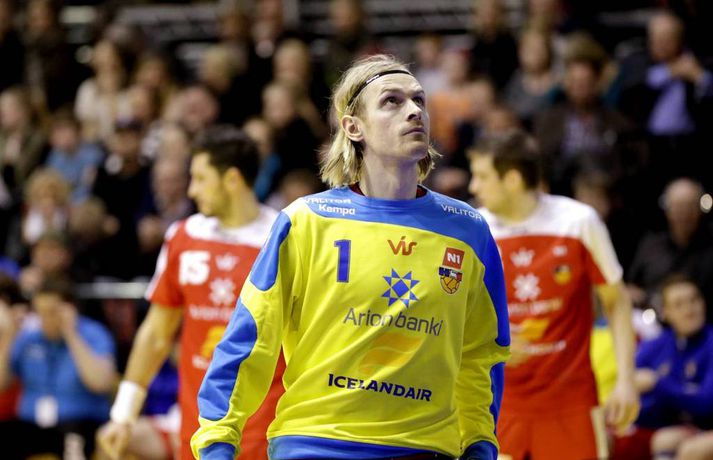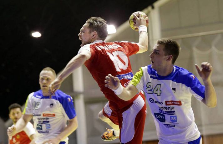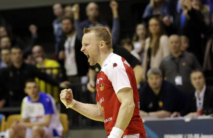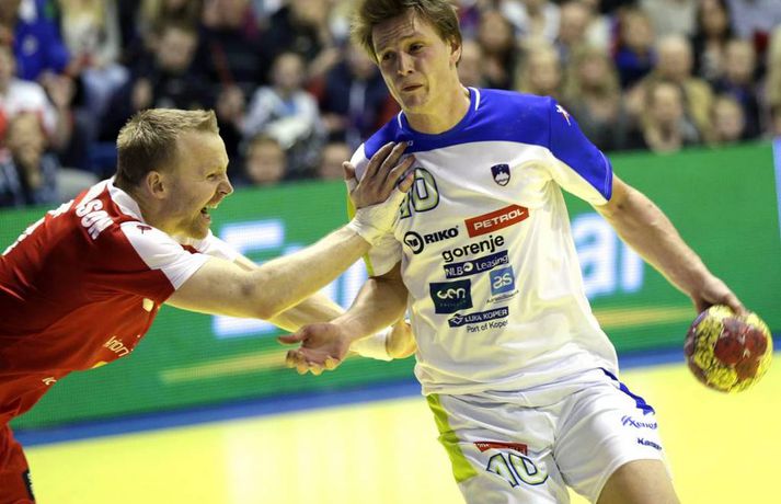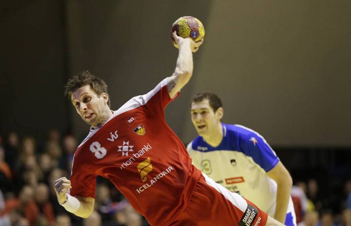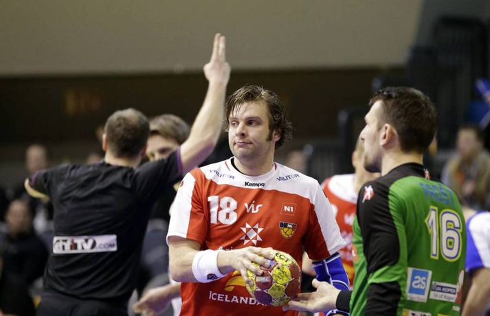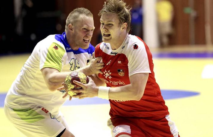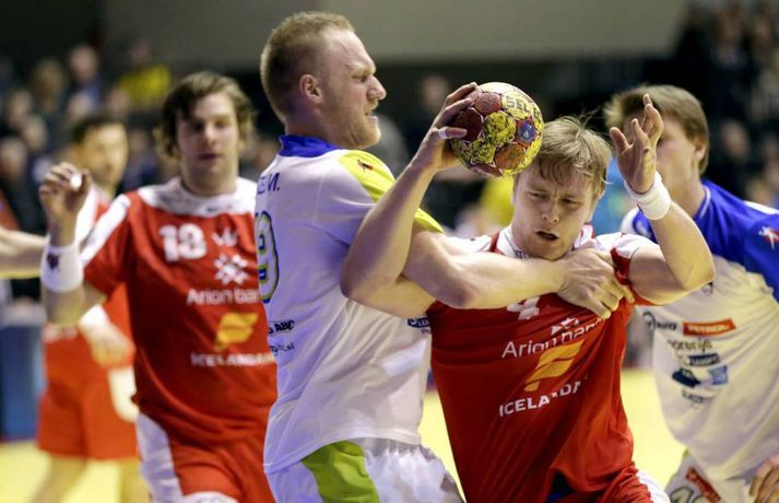 Ísland á EM eftir frábæran sigur Eiríkur Stefán Ásgeirsson í Laugardalshöll skrifar 7. apríl 2013 15:15 Myndir / Vilhelm Gunnarsson Ísland tryggði sér sæti á EM í Danmörku á næsta ári með hreint stórkostlegum sigri á sterku liði Slóvena, 35-34, í Laugardalshöllinni í dag. Það voru gestirnir sem voru með frumkvæðið lengst af en Ísland náði forystu á 50. mínútu og leikurinn var í járnum eftir það. Alexander Petersson tryggði svo Íslandi sigurinn þegar tíu sekúndur voru eftir. Slóvenar tóku leikhlé en fóru illa með þær sekúndur sem þeir áttu eftir þegar leikurinn hófst á ný. Hann fjaraði út og pakkfull Laugardalshöll fagnaði frábærum sigri með strákunum okkar. Guðjón Valur Sigurðsson og Aron Pálmarsson voru magnaðir í dag og Snorri Steinn Guðjónsson skoraði mikilvæg mörk, sem og Alexander Petersson. Slóvenar byrjuðu leikinn af miklum krafti enda mikið í húfi fyrir þá. Uros Zorman, leikstjórnandinn öflugi í liði Slóvena, var ekki með vegna meiðsla. Nenad Bilbija kom inn í hans stað og hann átti stórleik. Hann skoraði níu mörk í leiknum og var markahæstur hjá Slóvenum. Slóvenar voru sérstaklega grimmir þegar þeir fengu boltann, ýmist efitr misheppnaða sókn hjá Íslandi eða mark og skoruðu meirihluta marka sinna á fyrstu 20 mínútunum úr hraðaupphlaupi. Ólafur Gústafsson náði til dæmis að koma Íslandi yfir, 7-6, eftir fjórtán mínútur en Slóvenar skoruðu innan fárra sekúndna og bættu svo tveimur við á næstu mínútum. Forysta Slóvena varð mest fjögur mörk í fyrri hálfleik en staðan að honum loknum var 18-15, gestunum í vil. Strákarnir höfðu þó betri gætur á þessu í síðari hálfleik og voru ekki nema tíu mínútur að jafna metin. Það var svo á 50. mínútu að Ísland komst yfir á nýjan leik og þó svo að Slóvenar hefðu hvergi slegið af reyndust strákarnir okkar með stáltaugar þegar mest á reyndi. Vörn og markvarsla hefur oft verið betri hjá Íslandi í dag og það færðu Slóvenar sér í nyt, sérstaklega í síðari hálfleik. Þá fékk Ísland tvær tveggja mínútna brottvísanir á lokakaflanum sem flæktu málin enn frekar. En strákarnir spiluðu vel úr sínu og nýttu færin sín vel. Niðurstaðan frábær eins marks sigur og Ísland er því enn með fullt hús stiga í riðlinum. Nú getur Aron þjálfari leyft sér að fara afslappaður í síðustu tvo leikina og allt eins líklegt að Ísland verði búið að tryggja sér sigur í riðlinum þegar kemur að síðasta heimaleiknum, gegn Rúmeníu í janúar. Íslenski handboltinn Handbolti Mest lesið Óskar Hrafn fer ekki fet Íslenski boltinn Hákon Rafn hélt hreinu þegar Brentford flaug áfram Enski boltinn Spánn og Þýskaland mætast í úrslitum Fótbolti Anguissa hetja meistaranna Fótbolti Martin öflugur í góðum sigri Körfubolti Verstappen telur sig ekki geta barist um titilinn Formúla 1 Leikið á Þróttaravelli á miðvikudag Fótbolti Jón Dagur gulltryggði sigurinn með sínu fyrsta marki Fótbolti Vonast til að komast í Kórinn: „Menn hafa aldrei séð annað eins“ Fótbolti Birnir frá Akureyri í Garðabæ Íslenski boltinn Fleiri fréttir Teitur inn í landsliðið Gísli bjó til meira en þriðjung markanna Haukur magnaður í sigri Löwen Blær skoraði þrjú og lagði upp jöfnunarmarkið KA/Þór sótti sigur gegn Fram og stigalausar Stjörnukonur Fram kjöldró HK og spenna í Eyjum Meistararnir unnu gegn ÍBV og ÍR hafði betur gegn Selfyssingum Donni og félagar björguðu stigi undir lokin Afturelding komst upp að hlið Hauka Seldu bleika búninginn hennar Herrem fyrir meira en milljón „Leið vel þegar ég fór inn úr færinu“ Uppgjörið FH - Haukar 27-26 | Birgir Már tryggði FH sigur eftir spennutrylli Bernard fór mikinn en Valsmenn sluppu með sigurinn Fyrsti sigur Þórsara síðan í byrjun september Ómar Ingi með fullkomnan leik í Meistaradeildinni Guðjón Valur og lærisveinar hársbreidd frá því að vinna Kiel Hlakka til að sjá Viktor Gísla aftur og senda honum skilaboð Neyddar í sömu stöðu og Ísland og límdu melónur á skóna Hatar hvítu stuttbuxurnar Fjölga stórmótum landsliða í handboltanum Allt jafnt í bikarslag íslensku stelpnanna Orri fagnaði í Íslendingaslag í Meistaradeildinni Hjartavandamál halda Reyni frá keppni Stórar breytingar á Evrópukeppnum í handbolta Framarar töpuðu aftur á heimavelli í Evrópudeildinni Magdeburg komst örugglega áfram í sextán liða úrslitin Íslensku strákarnir áberandi í Evrópudeildinni „Stærri og sterkari en liðin sem við þekkjum hérna heima“ Viktor til liðs við frænda sinn og bróður Uppgjörið: Portúgal - Ísland 26-25 | Annar eltingaleikur íslenska liðsins endar með öðru tapi Sjá meira