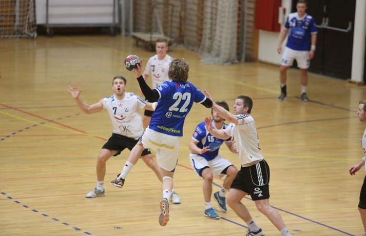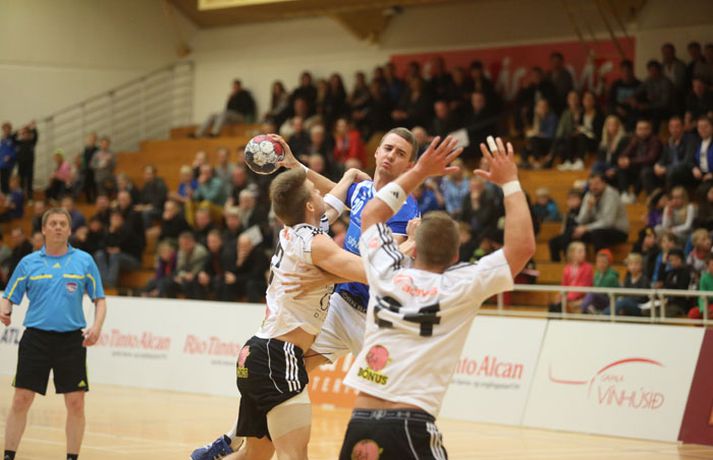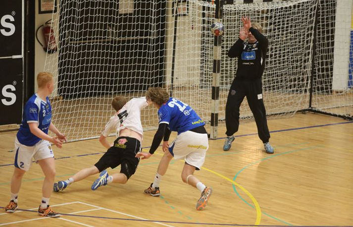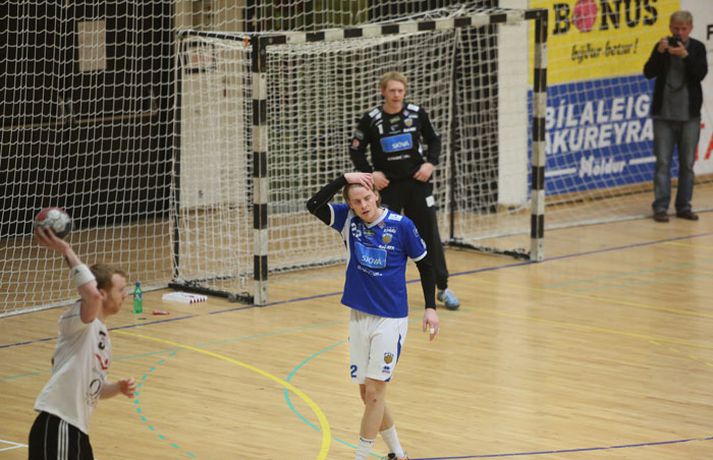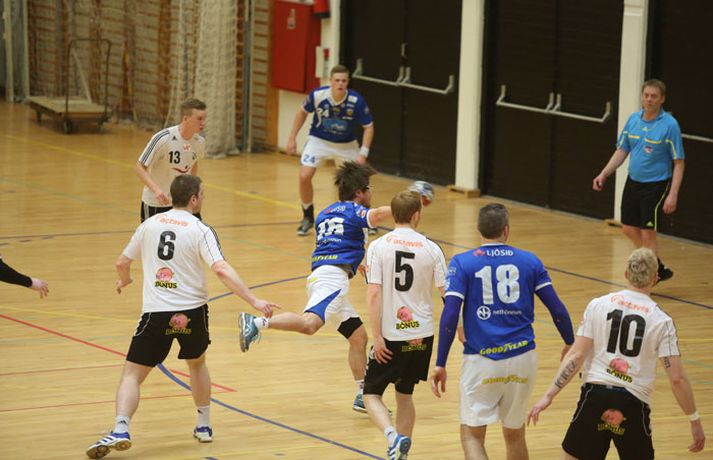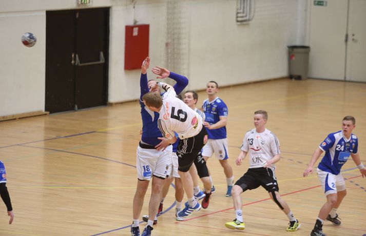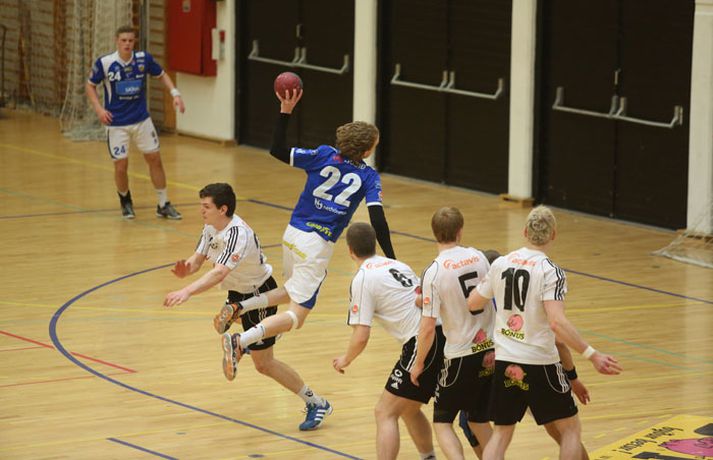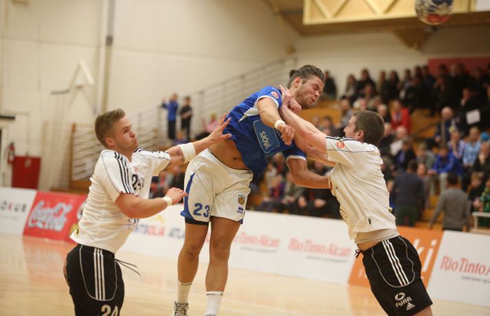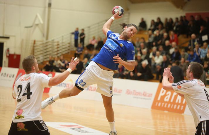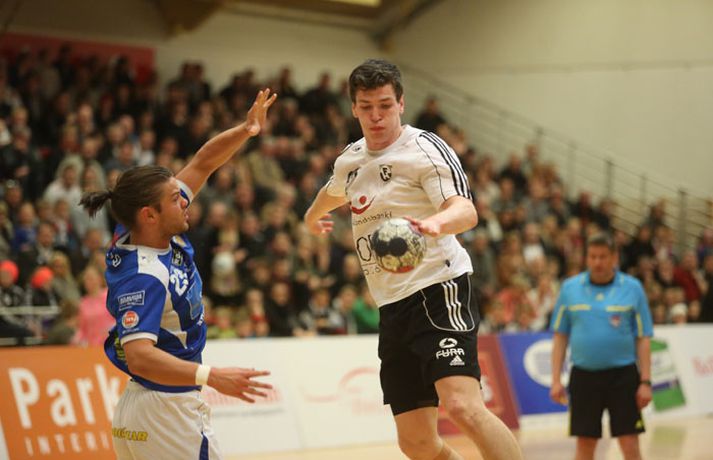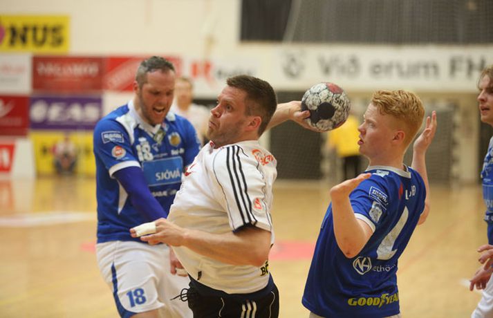 Fram er komið í vænlega stöðu í undanúrslitaeinvígi sínu gegn FH eftir að hafa unnið sterkan útisigur, 23-24, í Kaplakrika í kvöld. Leikur liðanna fer seint í sögubækurnar fyrir fegurð en spennandi var hann. Liðin héldust í hendur nær allan leikinn en taugar Framara voru sterkari undir lokin og lukkan var einnig með þeim. Fyrri hálfleikur var í einu orði sagt hreinasta hörmung. Handboltinn hjá báðum liðum skelfilegur og báðum liðum til háborinnar skammar. Framarar skömminni skárri framan af en FH skoraði ekki fyrr en eftir rúmar 10 mínútur. Sóknarleikur beggja liða skelfilegur og skotvalið oftar en ekki stórfurðulegt. Varnarleikur liðanna var ekkert sérstaklega frábær. Það var fyrst og fremst slakur sóknarleikur sem gerði það að verkum að lítið var skorað og staðan í hálfleik 10-10. Markverðir liðanna yfirburðamenn í hálfleik. Magnús varði 12 skot í marki Fram og var með 57 prósent markvörslu. Daníel FH-ingur með sjö varin skot og 41 prósent markvörslu. Flestir voru dauðfengnir er flautað var til leikhlés og ólíklegt að það væri hægt að bjóða upp á eins slakan handbolta í síðari hálfleik. FH-ingar voru rúmar tíu mínútur að skora í fyrri hálfleik og Framarar tóku sér sjö mínútur til þess að skora í þeim síðari. Engu að síður var munurinn aldrei meira en tvö mörk og lítið skorað. Liðin héldust alveg í hendur þar til rúm mínúta var eftir af leiknum. Þá náði Fram tveggja marka forskoti sem dugði til sigurs. Liðið missti Sigurð Eggertsson af velli er tæpar tvær mínútur voru eftir en það slapp til. Fyrst skoraði Sigfús Páll með glæsilegu gegnumbroti og sigurmarkið skoraði Stefán Darri. Ekkert sérstakt skot en það lak í gegnum hendur Daníels og í netið. Þar lá eiginlega munurinn í kvöld. Bæði lið spiluðu fínasta varnarleik en sóknarleikurinn var lengstum skelfilegur. Einar Rafn átti spretti í FH-liðinu sem og Magnús Óli sem var þó ekki að nýta skotin sín vel. Daníel Freyr þeirra bestur í markinu og Baldvin beit frá sér í vörninni þar til hann fékk rauða spjaldið. Magnús Erlendsson markvörður og Róbert Aron Hostert í sérklassa hjá Fram-liðinu. Magnús varð frábærlega og Róbert bar svo sóknarleikinn á baki sér. Sigfús átti einnig flotta innkomu. Sigurður: Stálum þessu í lokin "Þetta var bara létt í dag," sagði Sigurður Eggertsson Framara og glotti í kampinn eftir leikinn en hvað fannst honum um handboltann í leiknum? "Þetta var glæsilegur varnarleikur. Það hlýtur að vera því þetta eru bestu sóknarliðin og skora ekki meira. Það er samt spenna í mönnum og það hlýtur að hafa haft sitt að segja. Ég veit samt ekki hvað þetta er. Menn voru hálfkraftlausir en ég veit ekki hvað sé málið." Sigurður var í sviðsljósinu undir lokin. Átti misheppnað skot og lét svo reka sig af velli þegar tæpar tvær mínútur voru eftir. "Ég var hræddur um að ég hefði farið með leikinn er ég átti skotið sem var varið. Þá krossaði ég mig. Það var hræðilegt en sem betur fer kom Siffi sterkur inn. Þessi leikur hefði getað farið hvernig sem er en féll með okkur. Við stálum þessu í lokin," sagði Sigurður og glotti við tönn. Einar Andri: Býr meira í FH-liðinu"Þessi leikur fer í brottvísunum hjá okkur á síðasta korterinu. Mér fannst við vera með leikinn í síðari hálfleik en allar þessar brottvísanir vógu of þungt," sagði Einar Andri Einarsson, þjálfari FH, en hann var ekki sáttur með þær allar. "Við vorum klaufalegir á stundum en mér fannst línan í brottvísunum ekki nógu skýr. Ég er svekktur með það og mér fannst dómgæslan ekki góð. Ég á eftir að skoða það samt betur. "Við gerum líka klaufaleg mistök í lokin og ég er svekktur því við áttum að vinna þennan leik. Að fá á okkur aðeins 24 mörk á að duga til sigurs. "Þetta er samt ekki búið og við getum klárlega snúið þessu einvígi við. Það býr miklu meira í FH-liðinu en þetta. Við höfum áður unnið í Safamýrinni í vetur og ég sé ekkert því til fyrirstöðu að við endurtökum þann leik." Einar: Heppnin með okkur"Siffi og Stefán Darri kláruðu þetta fyrir okkur. Auðvitað smá lukka hjá Stefáni Darra en ef maður ætlar að vinna svona leik þá verður maður að hafa heppnina með sér. Ég held við höfum líka unnið fyrir heppninni," sagði Einar Jónsson, þjálfari Fram, eftir leik. "Það er eitthvað óeðlilegt ef það kemur ekki leikur sem er sá fallegasti. Þetta var samt jafn leikur og örugglega fín skemmtun fyrir áhorfendur. "Mörkin undir lokin voru skrautleg á báða bóga og erfitt að segja hvað hafi gert útslagið þannig séð. Bæði lið höfðu átt sína slöku leiki í fyrstu leikjunum og ég átti því von á mjög jöfnum leik núna. "Næsti leikur verður svakalegur og ég á von á því að það verði sama spennan í gangi þá. Við þurfum að mæta virkilega klárir í þann leik til þess að vinna."