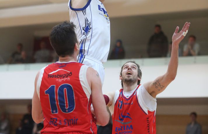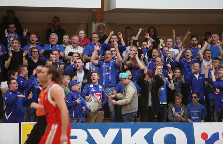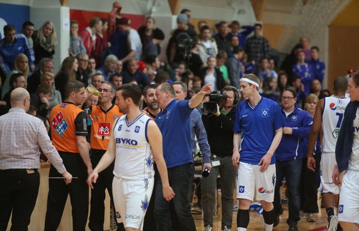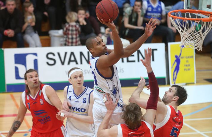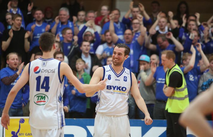 Stjarnan komst í kvöld í úrslit í Dominos-deild karla í körfubolta er liðið bar sigur úr býtum, 97-84, gegn Snæfell í fjórða leik liðanna í undanúrslitum. Stjarnan vann einvígið 3-1 eftir að hafa tapað fyrsta leiknum í einvíginu. Stjarnan mætir Grindavík í úrslitunum um Íslandsmeistaratitilinn. Leikurinn fór vel af stað fyrir gestina og gerðu þeir fyrstu átta stigin í leiknum og staðan orðin 8-0 á einu augabragði. Það gekk allt upp sóknarlega hjá Snæfelli og liðið sýndi frábæra sóknartilburði. Stjörnumenn fóru aftur á móti ekkert á taugum og komust hægt og rólega inn í leikinn. Jovan Zdravevski, leikmaður Stjörnunnar, var maðurinn sem kom liðinu í gírinn og var staðan 20-16 fyrir heimamenn eftir fyrsta leikhlutann. Zdravevski setti niður mikilvægar körfur og kveikti í heimamönnum. Í öðrum leikhluta var mikið jafnræði á með liðunum og aðeins nokkur stig skildu þau að. Stjörnumenn voru einu skrefi á undan stóran hluta af öðrum leikhluta en Hafþór Ingi Gunnarsson, leikmaður Snæfells, kom sterkur inn undir lok hálfleiksins og setti niður tvo þrista á stuttum tíma, annar þeirra um leið og hálfleiknum lauk. Staðan var því jöfn 38-38 í hálfleik. Það mátti búast við spennandi síðari hálfleik. Snæfell byrjaði síðari hálfleikinn mun betur og komust fljótlega í 47-42 en það gekk allt upp sóknarlega á fyrstu mínútunum. Stjörnumenn komu eins og fyrr í leiknum til baka og náðu tökum á leiknum. Jarrid Frye var magnaður í liði Stjörnunnar og hafði gert 24 stig eftir þrjá leikhluta. Staðan var 66-59 fyrir lokaleikhlutann og gestirnir ennþá með í leiknum. Stjörnumenn voru mikið mun betri í fjórða leikhlutanum og komust hægt og rólega í þægilega stöðu sem þeir héldu út leikinn. Leiknum lauk með öruggum sigri Stjörnunnar 97-84. Jarrid Frye var atkvæðamestur í liðið Stjörnunnar með 27 stig en Jón Ólafur Jónsson var frábær í liði Snæfells með 30 stig. Stjarnan mætir Grindavík í úrslitaeinvíginu um Íslandsmeistaratitilinn. Hér að ofan má sjá fögnuð Stjörnumanna þegar það var orðið ljóst að liðið væri komið í úrslit.Stjarnan-Snæfell 97-84 (20-16, 18-22, 28-21, 31-25) Stjarnan: Jarrid Frye 27/9 fráköst, Justin Shouse 24/4 fráköst/9 stoðsendingar, Jovan Zdravevski 21, Brian Mills 10/4 fráköst, Dagur Kár Jónsson 10, Marvin Valdimarsson 4/5 fráköst, Fannar Freyr Helgason 1.Snæfell: Jón Ólafur Jónsson 30/4 fráköst, Ryan Amaroso 20/14 fráköst, Sigurður Á. Þorvaldsson 9/7 fráköst, Hafþór Ingi Gunnarsson 8, Sveinn Arnar Davíðsson 7, Pálmi Freyr Sigurgeirsson 4/6 stoðsendingar, Jay Threatt 3, Ólafur Torfason 3/7 fráköst. Teitur: Ánægður með þá pressu sem komin er á liðið„Þetta er bara frábært og mikill léttir,“ sagði Teitur Örlygsson, þjálfari Stjörnunnar, eftir sigurinn í kvöld. „Við fórum í gegnum tvö frábær körfuboltalið á leið okkar í úrslitin sem sýnir hversu sterkir við erum.“ „Nú býður okkur Grindavík í næstu viku en í kvöld verða leikmenn sennilega að jafna sig á ákveðnu spennufalli.“ „Það er mikil reynsla í þessu liði og við eigum að geta nýtt okkur þá reynslu. Það hefur verið lenskan undanfarinn þrjú ár að liðið sem vinnur okkur verður Íslandsmeistari. Nú er það í okkar höndum að svo gerist ekki.“ „Það er verið að spá okkur mikið titlinum í fjölmiðlum og annarsstaðar og ég tel að sú pressa sér bara af hinu góða og við eigum bara að njóta þess að vera í úrslitum.“Hægt er að sjá myndband af viðtalinu við Teit með því að ýta hér. Nonni Mæju: Of stór biti að missa leikstjórnandann okkar í leik tvö„Manni líður bara ömurlega eins og alltaf þegar maður dettur úr leik,“ sagði Jón Ólafur Jónsson, leikmaður Snæfells, eftir tapið í kvöld. „Við vorum að elta rosalega lengi í leiknum og það tók sinn toll. Varnarleikur okkar var bara ekki nægilega góður í síðari hálfleiknum eins og sást en þeir gerðu 60 stig í síðari hálfleiknum. Það er ekki hægt að vinna Stjörnuna ef þú spilar ekki góða vörn.“ „Við vorum fínir í fyrri hálfleiknum en menn komu eitthvað værukærir út í þann síðari. Það er auðvitað virkilega stór biti að missa Jay Threatt úr leik en hann hefur stjórnað okkar leik í allan vetur og hefur verið með einhverjar tuttugu stoðsendingar í hverjum leik.“ „Ég hafði það á tilfinningunni að liðið sem færi í gegnum þessa seríu myndi fara alla leið og ég tel að Stjarnan eigi eftir að verða Íslandsmeistarar.“Hægt er að sjá myndbandið með því að ýta hér. Textalýsing frá Ágarði í kvöld:Leik lokið: Stjarnan er komið í úrslit Dominos-deildar karla eftir sigur á Snæfell 97-84 í fjórða leik liðanna í undanúrslitum keppninnar. Stjarnan vann því einvígið 3-1.40. mín: Stjarnan er níu stigum yfir og 45 sekúndur eftir. Þetta er í raun búið.39. mín: Justin Shouse fer á línuna fyrir Stjörnuna í stöðunni 89-81 og setur þau bæði niður. Staðan er því 91-81 og 1:30 eftir af leiknum.38. mín: Þetta verður rosalega erfitt fyrir gestina úr þessu en það munar enn tíu stigum á liðunum. 89-79 þegar Tvær mínútur eru eftir en þetta er samt hægt, það er á hreinu.37. mín: Nonni Mæju með þrjá þrista í röð fyrir Snæfell. Það munar samt tíu stigum á liðunum 86-76.36. mín: Nú munar tíu stigum á liðunum og gestirnir verða að fara hressilega í gang. Staðan er 80-70.35.mín: Justin Shouse með frábæra sendingu á Dag Kar Jónsson sem setti boltann í körfuna í loftinu. Frábær tilþrif hjá þeim litlu.34. mín: Marvin Valdimarsson að koma Stjörnunni 13 stigum yfir 78-65.33. mín: Stjörnumenn að ná tökum á leiknum. Snæfell verður að koma með fínt áhlaup núna fljótlega ef þeir 