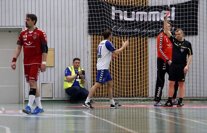 Haukar eru komnir í úrslit um Íslandsmeistaratitilinn í N1 deild karla eftir 20-21 sigur gegn ÍR í fjórða leik liðanna í Austurvbergi í dag. ÍR-ingar voru betri í fyrri hálfleik en Haukar voru mun betri í seinni hálfleik og uppskáru góðan sigur. Haukar byrjuðu leikinn í Austurbergi betur og náðu snemma þriggja marka forystu í stöðunni 1-4. Umdeilt atvik átti sér stað á 9. mínútu þegar Sturla Ásgeirsson fékk beint rautt spjald fyrir að skjóta beint í andlitið á Aroni Rafni Eðvarssyni, markverði Hauka úr vítakasti. Dómarar leiksins voru vissir í sinni sök og gáfu Sturlu beint rautt spjald. Stuðningsmenn ÍR voru æfir yfir dómnum en skot Sturlu var laust og ætlaði Sturla sér líklega að lauma boltanum yfir Aron. Þrátt fyrir mótlætið þá efldust ÍR-ingar og tóku þeir hreinlega öll völd á vellinum. ÍR-ingar skoruðu sjö mörk í röð úr stöðunni 3-5 og komust fimm mörkum yfir, 10-5. Magnaður kafli hjá heimamönnum. Haukar misstu einnig tvo leikmenn af velli með brottvísanir með stuttu millibili og var útlitið ekki bjart. Þrátt fyrir að vera tveimur færri þá náðu Haukar að komast aftur inn í leikinn og staðan í hálfleik, 10-7 fyrir heimamenn. Haukar byrjuðu seinni háfleikinn af gríðarlegum krafti og komust fljótlega yfir í leiknum. Haukar spiluðu frábæra vörn og áttu ÍR-ingar í miklum erfiðleikum með að brjóta á bak aftur 5+1 vörn Hauka. Haukar komust mest fjórum mörkum í stöðunni 16-20 þegar fjórar mínútur voru eftir. Þá fékk Gylfi Gylfason að líta beint rautt spjald fyrir ljótt brot á Ingimundi Ingimundarsyni. Olnboginn fór þar í andlitið á Ingimundi sem var langt frá því að vera sáttur. ÍR barðist við að knýja fram framlenginu. Haukar voru tveimur mörkum yfir þegar um 20 sekúndur voru eftir og náði Björvin Hólmgeirsson að minnka muninn í eitt mark þegar nokkrar sekúndur voru eftir. Lengra komust ÍR-ingar ekki. Lokatölur 20-21 fyrir Hauka sem þar með eru komnir í úrslit. Adam Haukur Baumruk var markahæstur hjá Haukum með fimm mörk. Hann átti góða innkomu í lið Hauka í dag. Gylfi Gylfason og Tjörvi Þorgeirsson komu næstir með fjögur mörk. Björgvin Hólmgeirsson skoraði átta mörk hjá ÍR. Aron Rafn Eðvarðsson átti góðan leik hjá Haukum og varði 21 skot. Kristófer Fannar Guðmundsson varði 14 skot í marki ÍR. Bjarki: Kappið bar menn ofurliðiMynd/Stefán„Þetta var hörkuleikur. Við vorum með yfirhöndina lengi vel en gáfum eftir í restina. Haukar hertu tökin í 5+1 vörninni í seinni hálfleik og við vorum ekki að gera rétta hluti í sókninni. Í hita leiksins virðast menn gleyma sér og kappið bar menn ofurliði,“ segir Bjarki Sigurðsson, þjálfari ÍR eftir tap liðsins gegn Haukum í Austurbergi í dag. „Það er helst þriðji leikurinn á Ásvöllum sem fór með þetta hjá okkur í þessu einvígi. Þar vorum við með unninn leik í höndunum en fórum að reyna að verja forskotið. Það gengur ekki á móti reyndu liði Hauka og okkur var refsað.“ Umdeild atvik áttu sér stað í leiknum í dag en tvö bein rauð spjöld fóru á loft. Bjarki segir að báðir dómar hafi verið réttir. „Ég sá ekki nógu vel hvað gerðist í atvikinu hjá Sturlu. Ef markvörðurinn stendur kjurr og leikmaður skýtur í andlitið á honum þá er það rautt spjald. Þannig eru reglurnar. Þetta var klárlega rautt spjald á Gylfa. Þetta var fólskuleg árás og á ekki sjást í handbolta.“ ÍR-ingar stóðu sig frábærlega í vetur og urðu einnig bikarmeistarar. Bjarki segir sína menn geta verið stoltir af árangrinum í vetur. „Við getum gengið stoltir frá þessu tímabili. Við urðum Reykjavíkurmeistarar og Bikarmeistarar. Svo mætum við Haukum í fjögurra liða úrslitum þar sem betra lið með meiri breidd vinnur. Ég get ekki kvartað yfir árangrinum í vetur,“ segir Bjarki. Hann stefnir að því að styrkja liðið fyrir næstu leiktíð. „Við erum byrjaðir að vinna í leikmannamálum fyrir næstu leiktíð og ætlum að strykja okkur enn frekar. Stefnan er sett á að fara lengra á næsta tímabili. Aron: Spiluðum öfluga vörn í seinni hálfleik„Ég er mjög ánægður með að vinna þennan leik þó þetta hafi kannski verið óþarflega naumt undir lokin,“ sagði Aron Kristjánsson, þjálfari Hauka eftir sigur sinna manna gegn ÍR í dag. „ÍR-ingar eru með frábært lið og þetta hafa verið erfiðir leikir. Við komum mjög sterkir inn í leikinn og vorum að spila af miklum krafti. Þegar Sturla fær rauða spjaldið þá virðist handbremsan hafa dottið í gang hjá okkur og vorum að æsa okkur yfir smáatriðum. Við náðum að róa okkur í hálfleik og lékum mjög öfluga 5+1 vörn í seinni hálfleik og sóknarleikurinn var vel stýrður hjá Tjörva. Við spiluðum mjög vel sóknarlega í seinni hálfleik.“ Haukar skoruðu aðeins sjö mörk í fyrri hálfleik en 14 í þeim seinni. Aron segir að sínir menn hafi verið full æstir í byrjun leiks. „Við alltof æstir og ég var á fullu að reyna að róa leikmenn. Við sýndum virklega góðan leik í seinni hálfleik og ég er mjög sáttur að hafa klárað þetta í dag. Við höfum verið að spila mjög vel í síðustu þremur leikjum og vonandi höldum við þannig áfram gegn Fram.“
