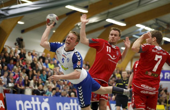 Umfjöllun, viðtöl og myndir: ÍR - Haukar 20-21 | Haukar mæta Fram í úrslitum Jón Júlíus Karlsson í Austurbergi skrifar 21. apríl 2013 00:01 Mynd/Stefán Haukar eru komnir í úrslit um Íslandsmeistaratitilinn í N1 deild karla eftir 20-21 sigur gegn ÍR í fjórða leik liðanna í Austurvbergi í dag. ÍR-ingar voru betri í fyrri hálfleik en Haukar voru mun betri í seinni hálfleik og uppskáru góðan sigur. Haukar byrjuðu leikinn í Austurbergi betur og náðu snemma þriggja marka forystu í stöðunni 1-4. Umdeilt atvik átti sér stað á 9. mínútu þegar Sturla Ásgeirsson fékk beint rautt spjald fyrir að skjóta beint í andlitið á Aroni Rafni Eðvarssyni, markverði Hauka úr vítakasti. Dómarar leiksins voru vissir í sinni sök og gáfu Sturlu beint rautt spjald. Stuðningsmenn ÍR voru æfir yfir dómnum en skot Sturlu var laust og ætlaði Sturla sér líklega að lauma boltanum yfir Aron. Þrátt fyrir mótlætið þá efldust ÍR-ingar og tóku þeir hreinlega öll völd á vellinum. ÍR-ingar skoruðu sjö mörk í röð úr stöðunni 3-5 og komust fimm mörkum yfir, 10-5. Magnaður kafli hjá heimamönnum. Haukar misstu einnig tvo leikmenn af velli með brottvísanir með stuttu millibili og var útlitið ekki bjart. Þrátt fyrir að vera tveimur færri þá náðu Haukar að komast aftur inn í leikinn og staðan í hálfleik, 10-7 fyrir heimamenn. Haukar byrjuðu seinni háfleikinn af gríðarlegum krafti og komust fljótlega yfir í leiknum. Haukar spiluðu frábæra vörn og áttu ÍR-ingar í miklum erfiðleikum með að brjóta á bak aftur 5+1 vörn Hauka. Haukar komust mest fjórum mörkum í stöðunni 16-20 þegar fjórar mínútur voru eftir. Þá fékk Gylfi Gylfason að líta beint rautt spjald fyrir ljótt brot á Ingimundi Ingimundarsyni. Olnboginn fór þar í andlitið á Ingimundi sem var langt frá því að vera sáttur. ÍR barðist við að knýja fram framlenginu. Haukar voru tveimur mörkum yfir þegar um 20 sekúndur voru eftir og náði Björvin Hólmgeirsson að minnka muninn í eitt mark þegar nokkrar sekúndur voru eftir. Lengra komust ÍR-ingar ekki. Lokatölur 20-21 fyrir Hauka sem þar með eru komnir í úrslit. Adam Haukur Baumruk var markahæstur hjá Haukum með fimm mörk. Hann átti góða innkomu í lið Hauka í dag. Gylfi Gylfason og Tjörvi Þorgeirsson komu næstir með fjögur mörk. Björgvin Hólmgeirsson skoraði átta mörk hjá ÍR. Aron Rafn Eðvarðsson átti góðan leik hjá Haukum og varði 21 skot. Kristófer Fannar Guðmundsson varði 14 skot í marki ÍR. Bjarki: Kappið bar menn ofurliðiMynd/Stefán„Þetta var hörkuleikur. Við vorum með yfirhöndina lengi vel en gáfum eftir í restina. Haukar hertu tökin í 5+1 vörninni í seinni hálfleik og við vorum ekki að gera rétta hluti í sókninni. Í hita leiksins virðast menn gleyma sér og kappið bar menn ofurliði,“ segir Bjarki Sigurðsson, þjálfari ÍR eftir tap liðsins gegn Haukum í Austurbergi í dag. „Það er helst þriðji leikurinn á Ásvöllum sem fór með þetta hjá okkur í þessu einvígi. Þar vorum við með unninn leik í höndunum en fórum að reyna að verja forskotið. Það gengur ekki á móti reyndu liði Hauka og okkur var refsað.“ Umdeild atvik áttu sér stað í leiknum í dag en tvö bein rauð spjöld fóru á loft. Bjarki segir að báðir dómar hafi verið réttir. „Ég sá ekki nógu vel hvað gerðist í atvikinu hjá Sturlu. Ef markvörðurinn stendur kjurr og leikmaður skýtur í andlitið á honum þá er það rautt spjald. Þannig eru reglurnar. Þetta var klárlega rautt spjald á Gylfa. Þetta var fólskuleg árás og á ekki sjást í handbolta.“ ÍR-ingar stóðu sig frábærlega í vetur og urðu einnig bikarmeistarar. Bjarki segir sína menn geta verið stoltir af árangrinum í vetur. „Við getum gengið stoltir frá þessu tímabili. Við urðum Reykjavíkurmeistarar og Bikarmeistarar. Svo mætum við Haukum í fjögurra liða úrslitum þar sem betra lið með meiri breidd vinnur. Ég get ekki kvartað yfir árangrinum í vetur,“ segir Bjarki. Hann stefnir að því að styrkja liðið fyrir næstu leiktíð. „Við erum byrjaðir að vinna í leikmannamálum fyrir næstu leiktíð og ætlum að strykja okkur enn frekar. Stefnan er sett á að fara lengra á næsta tímabili. Aron: Spiluðum öfluga vörn í seinni hálfleik„Ég er mjög ánægður með að vinna þennan leik þó þetta hafi kannski verið óþarflega naumt undir lokin,“ sagði Aron Kristjánsson, þjálfari Hauka eftir sigur sinna manna gegn ÍR í dag. „ÍR-ingar eru með frábært lið og þetta hafa verið erfiðir leikir. Við komum mjög sterkir inn í leikinn og vorum að spila af miklum krafti. Þegar Sturla fær rauða spjaldið þá virðist handbremsan hafa dottið í gang hjá okkur og vorum að æsa okkur yfir smáatriðum. Við náðum að róa okkur í hálfleik og lékum mjög öfluga 5+1 vörn í seinni hálfleik og sóknarleikurinn var vel stýrður hjá Tjörva. Við spiluðum mjög vel sóknarlega í seinni hálfleik.“ Haukar skoruðu aðeins sjö mörk í fyrri hálfleik en 14 í þeim seinni. Aron segir að sínir menn hafi verið full æstir í byrjun leiks. „Við alltof æstir og ég var á fullu að reyna að róa leikmenn. Við sýndum virklega góðan leik í seinni hálfleik og ég er mjög sáttur að hafa klárað þetta í dag. Við höfum verið að spila mjög vel í síðustu þremur leikjum og vonandi höldum við þannig áfram gegn Fram.“ Íslenski handboltinn Tengdar fréttir Umfjöllun og viðtöl: Haukar - ÍR 23-24 | ÍR leiðir einvígið 1-0 ÍR-ingar unnu Hauka, 24-23, í fyrsta leik liðanna í undanúrslitum N1-deildar karla í handknattleik en leikurinn fór fram að Ásvöllum í dag. Leikurinn var æsispennandi allan tímann og gátu Haukar jafnaði metin í síðustu sókn leiksins. 13. apríl 2013 16:30 Umfjöllun og viðtöl: H