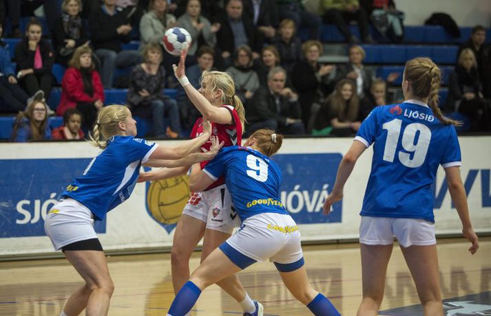 Umfjöllun og viðtöl: Fram - Valur 19-24 | Valur á toppinn Eiríkur Stefán Ásgeirsson skrifar 31. október 2013 09:37 Mynd/Daníel Valur komst á topp Olísdeild kvenna með góðum sigri á Íslandsmeisturum Fram í kvöld. Valskonur eru enn taplausar á tímabilinu. Eftir jafnan fyrri hálfleik dró í sundur með liðunum, þar sem þaulreyndir leikmenn Vals reyndust númeri of stórir á lokasprettinum. Eftir vandræðagang í upphafi leiks hjá Fram náðu þær bláklæddu að koma sér almennilega af stað eftir að hafa lent 6-2 undir. Góður kafli þar sem Fram skoraði sex mörk í röð hafði mikið að segja og var jafnræði með liðunum það sem eftir lifði af fyrri hálfleik. Innkoma Hildar Sverrisdóttur í mark Fram hafði mikið að segja en hin sextán ára Ragnheiður Júlíusdóttir fór mikinn í sókninni og þessi stórefnilega skytta skoraði hvert markið á fætur öðru. Valsmenn fóru vel yfir sín mál í hálfleik og sigu fram úr í síðari hálfleik, hægt og rólega. Ragnheiður og Sigurbjörg Jóhannsdóttir sáu nánast einar um sóknarleik Fram og eftir því sem leið á hálfleikinn fór þreytan að segja meira til sín. Ekki skrýtið enda tók Ragnheiður 25 skot í leiknum. Kristín, Anna Úrsúla og Hrafnhildur búa yfir mikilli reynslu og reyndust öflugar fyrir Valsliðið í kvöld. Óvæntari var innkoma Sigríðar Ólafsdóttur í mark Vals en eftir að hún kom inn á varði hún 58 prósent þeirra skota sem hún fékk á sig og átti sannkallaðan stórleik. Fram saknaði þeirra Ástu Birnu Gunnarsdóttur og Steinunnar Björnsdóttur en báðar eiga við meiðsli að stríða. Ungar og efnilegar stúlkur leystu þær af hólmi en í kvöld reyndist lið Vals einfaldlega númeri of stórt fyrir þær.Mynd/VilhelmStefán: Við getum betur Stefán Arnarson, þjálfari Vals, lofaði ungt lið Fram eftir sigur sinna manna í Safamýrinni. „Þetta var ekki nægilega góður leikur af okkar hálfu. Lið Fram, sem er ungt og efnilegt, spilaði mjög vel en við eigum að geta betur. Í stöðunni 8-4 hefðum við átt að vera mun agaðri og við hefðum átt að klára þennan leik mun fyrr en við gerðum,“ sagði Stefán. „Í seinni hálfleik fórum við svo að spila mun betri vörn og mættum þeirra skyttum. Þá varð þetta mun erfiðara fyrir þær, sérstaklega þegar við fengum nokkur hraðaupphlaup.“ „En heilt yfir getum við betur. Ég vil þó ekki taka neitt af Fram, sem er mjög ungt og efnilegt lið. Þær hafa ekki sömu breidd og við og maður sá að þær voru orðnar þreyttar.“Mynd/DaníelHalldór Jóhann: 15 mínútna kafli fór með leikinn „Við getum verið ánægð með baráttuna en við vissum auðvitað fyrirfram að til að vinna Val þarf að leggja sig 100 prósent fram í 60 mínútur. En það kom 15 mínútna kafli í okkar leik sem ég var ósáttur við og það var í raun það sem fór með leikinn hjá okkur,“ sagði Halldór Jóhann Sigfússon, þjálfari Fram, eftir fimm marka tap gegn Val í kvöld. „Það tala allir um að við erum með ungt og efnilegt lið. En við ætlumst til mikils af okkur og við vilju meira. Við sættum okkur ekki við að tapa fyrir bestu liðunum með bara nokkrum mörkum því við teljum okkur vera eitt af bestu liðunum.“ Halldór Jóhann neitar því ekki að meiðsli lykilmanna hafa sett strik í reikninginn. Það sást best á því að fáir leikmenn skoruðu fyrir Fram í kvöld og hin unga Ragnheiður Júlíusdóttir tók alls 25 skot í leiknum. „Hún er sextán ára gömul og mikið efni. En það þarf að leiðbeina henni í réttan farveg og það tekur tíma. En það er frábært að vera með svona efni í höndunum og geta unnið með það. En ég hefði viljað sjá meira koma frá ákveðnum leikmönnum á ákveðnum köflum.“Mynd/DaníelHrafnhildur: Öruggt í seinni hálfleik Hrafnhildur Ósk Skúladóttir segir að leikurinn hefði þróast á þann hátt sem hún bjóst við fyrirfram. „Þær eru sprækar og fljótar. Við vissum að við fengjum engin auðveld mörk hér í kvöld,“ segir hún. „Þær náðu að koma sér inn í leikinn eftir góða byrjun hjá okkur en svo var þetta frekar öruggt í seinni hálfleik. Meiðslin hjá þeim hafa sitt að segja og við erum með góða breidd. Það hafði áhrif.“ Hún segir að liðið hafi hætt að spila sem lið á slæma kaflanum í fyrri hálfleik. „Við vorum að spila sem einstaklingar þá og vorum óskynsamar. Þá fer þetta yfirleitt svona hjá okkur.“ Íslenski handboltinn Mest lesið Vonast til að komast í Kórinn: „Menn hafa aldrei séð annað eins“ Fótbolti Landsleiknum aflýst og framhaldið óljóst Fótbolti Fær þrjár milljónir á dag næstu sex árin fyrir að gera ekkert Sport Stöðufundur í Laugardal klukkan 10:30 Fótbolti Enska úrvalsdeildin í jólaköttinn Enski boltinn Elsta konan til klára Járnkarlinn Sport Landsliðskonur aðstoðuðu ökumenn í vanda Fótbolti Markvörður Inter banaði háöldruðum manni í hjólastól Sport Birnir frá Akureyri í Garðabæ Íslenski boltinn Segir að Slot verði að taka tvo leikmenn út úr Liverpool-liðinu Enski boltinn Fleiri fréttir Teitur inn í landsliðið Gísli bjó til meira en þriðjung markanna Haukur magnaður í sigri Löwen Blær skoraði þrjú og lagði upp jöfnunarmarkið KA/Þór sótti sigur gegn Fram og stigalausar Stjörnukonur Fram kjöldró HK og spenna í Eyjum Meistararnir unnu gegn ÍBV og ÍR hafði betur gegn Selfyssingum Donni og félagar björguðu stigi undir lokin Afturelding komst upp að hlið Hauka Seldu bleika búninginn hennar Herrem fyrir meira en milljón „Leið vel þegar ég fór inn úr færinu“ Uppgjörið FH - Haukar 27-26 | Birgir Már tryggði FH sigur eftir spennutrylli Bernard fór mikinn en Valsmenn sluppu með sigurinn Fyrsti sigur Þórsara síðan í byrjun september Ómar Ingi með fullkomnan leik 