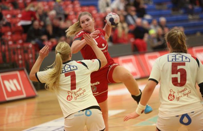Haukar unnu tveggja marka sigur á Selfyssingum og FH vann þægilegan sigur á Aftureldingu í 16-liða úrslitum Coca Cola bikarsins í handknattleik kvenna í kvöld. Haukakonur mættu mun ákveðnari til leiks gegn Selfossi í kvöld. Með Gunnhildi Pétursdóttur í broddi fylkingar náðu þær rauðklæddu góðu forskoti og leiddu með átta mörkum í hálfleik, 18-10. Gestirnir af Selfossi réttu sinn hlut í síðari hálfleik og vel það. Carmen Palamariu skoraði níu mörk fyrir gestina sem önduðu ofan í hálsmálið á heimakonum en þurftu að lokum að játa sig sigraðar. Lokatölurnar 30-28 fyrir Hauka. Gunnhildur Pétursdóttir skoraði tíu mörk fyrir Hauka, Viktoría Valdimarsdóttir sex og Karen Helga Sigurjónsdóttir fimm. Hjá gestunum var Carmen Palamriu atkvæðamest sem fyrr segir en Hrafnhildur Hanna Þrastardóttir skoraði sex mörk. Í Kaplakrika unnu FH-ingar nokkuð þægilegan sigur á Aftureldingu. Lokatölurnar urðu 26-18 eftir að FH hafði leitt í hálfleik 12-9. Steinunn Snorradóttir skoraði sex mörk fyrir heimakonur en annars dreifðist markaskorun FH-inga nokkuð jafnt. Níu leikmenn komust á blað en Hulda Bryndís Tryggvadóttir og Ingibjörg Pálmadóttir skoruðu fjögur mörk hvor. Sara Kristjánsdóttir skoraði sjö mörk fyrir gestina úr Mosfellsbæ og Telma Frímannsdóttir sex. Athygli vakti að markahæsti leikmaður Olísdeildarinnar, Hekla Daðadóttir, skoraði aðeins eitt mark í leiknum. FH og Haukar eru því komnin í átta liða úrslit bikarsins en Mosfellingar og Selfyssingar eru úr leik.