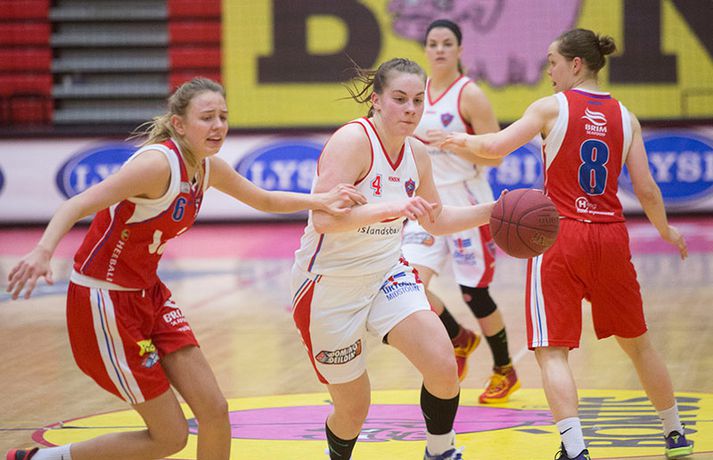 Umfjöllun og viðtöl: Valur - Snæfell 82-56 | Valur knúði fram oddaleik Anton Ingi Leifsson í Vodafone-höllinni skrifar 21. mars 2014 16:18 Úr leiknum í kvöld. Vísir/Daníel Valur knúði fram oddaleik í rimmu þeirra gegn Snæfell í Dominos-deild kvenna. Staðan í þessu undanúrslitaeinvígi er því 2-2. Fyrsti leikhluti fór nokkuð fjörlega af stað, en bæði lið virtust vel gíruð í leikinn. Smá stress var þó í báðum liðum. Skiljanlega, enda mikið undir. Valur tók forystuna í fyrsta leikhluta og Kristrún Sigurjónsdóttir fór mikinn, en hún byrjaði leikinn virkilega vel. Aldrei skildi þó mikið á milli liðanna og munurinn var ekki mikill. Valur leiddi svo eftir fyrsta leikhluta, 17-12. Ágeng vörn heimastúlkna var að virka vel. Snæfell átti oftar en ekki í miklum vandræðum með að koma sér yfir miðjuna. Þær héldu pressunni áfram í öðrum leikhluta og náðu að auka muninn jafnt og þétt. Valsstúlkur voru með 50% þriggja stiga hittni í fyrri hálfleik á meðan gestirnir voru einungis með 12,5%. Munurinn varð svo mestur þegar flautað var til hálfleiks, en þá var hann orðinn 16 stig; 41-25. Átta leikmenn voru komnir á blað fyrir Val í hálfleik, en einungis sex hjá Snæfell. Þriðji leikhluti var svo svipaður og sá annar, en Snæfell virtist vera minnka muninn um þriðja leikhluta. Þá gáfu heimastúlkur aftur í og var munurinn 23 stig þegar þriðja leikhluta af fjórum var lokið. Það var svo formsatriði fyrir Val að klára leikinn og lokatölur 82-56. Bersýnilega mátti sjá þreytu hjá báum liðum. Þetta er fjórði leikur liðanna á sjö dögum og bæði lið voru byrjuð að sýna þreytumerki undir lokin - þá sérstaklega gestirnir úr Stykkishólmi. Liðsheildin skilaði þessum sigri hjá Val sem og öflug vörn. Átta leikmenn hjá Val skoruðu sjö stig eða meira, en einungis fjórir hjá Snæfell. Chynna Brown átti greinilega við meiðsli að stríða en hún skoraði ekki nema fimm stig fyrir gestina. Pressuvörn Vals var virkilega öflug og fengu nokkrar auðveldar sóknir ef svo mætti kalla. Hröð upphlaup sem skiluðu oftar en ekki góðum tveggja stiga körfum. Snæfell átti í vandræðum með að byrja sóknarleik sinn og gerðu klaufamistök. Hjá Val voru þær Kristrún Sigurjónsdóttir og Anna Martin öflugastar. Kristrún skoraði 16 stig og Anna 14, en Anna spilaði liðsfélaga sína vel uppi. Hildur Sigurðardóttir var stigahæst með 12 stig hjá gestunum og Guðrún Gróa setti niður ellefu stig. Alla tölfræði má sjá hér að neðan.Ágúst: Nokkrir leikmenn ekki verið sýnilegir „Ég er bara mjög ánægður með liðið. Þetta var liðssigur og við spiluðum frábæra vörn," sagði Ágúst hæstánægður við Vísi eftir leik. „Við spilum mjög góða vörn í fyrri hálfleik og upphafi seinni hálfleiks. Það kemur kafli um miðjan þriðja leikhluta sem einbeitingin dettur niður í vörninni en annars var vörnin mjög góð mest allan leikinn." „Sóknarlega erum við að spila vel saman. Það hefur kannski vantað aðeins upp á í hinum þremur leikjunum, meira að segja leiknum sem við unnum. Það hefur vantað betra samspil og að finna réttu færin." Hann sagði að leikurinn hafi langt því frá að hafa verið auðveldur: „Við þurftum virkilega að hafa fyrir þessu þrátt fyrir að hafa verið þessi munur hérna í endann. Snæfell er með frábært lið og frábæra leikmenn." Margir leikmenn lögðu lóð sín á vogarskálirnar og Ágúst var ánægður með liðsheildina: „Við erum búnir að vera tönnlast á því að við séum með góða breidd. Við þurfum þá að sýna það. Það hafa nokkrir leikmenn ekki verið sýnilegir í þessu einvígi þangað til í kvöld. Ef hungrið er til staðar fyrir síðasta leikinn og við fáum framlag frá fleirum en tveimur til þremur sóknarlega þá erum við mjög öflugar." „Ég er bjartsýnn fyrir oddaleikinn. Sá leikur byrjar bara 0-0. Það skiptir engu máli hvort þessi leikur hafi unnist með einu stigi eða 50. Það er bara 0-0 í Hólminum og við þurfum að mæta aftur bara vel gíraðar og vel einbeittar," sagði Ágúst við Vísi að lokum.Hildur: Orðið pínu eins og Survivor keppni „Ég myndi segja að þreyta í leikmönnum hafi gert gæfumuninn hér í kvöld. Leikmenn eru bara að detta hérna niður í meiðsli og annað undan álagi í úrslitakeppninni," sagði Hildur ekki ánægð, skiljanlega, í leikslok. „Ég held að mótanefnd þurfi að skoða sín mál áður en þeir raða niður leikjum. Ég held að enginn þeirra gæti spilað svona ört. Þetta er pínu mikil vitleysa, myndi ég segja,“ sagði Hildur eftir leikinn í kvöld. „Bæði lið finna fyrir þessu en við erum búnar að missa nokkra leikmenn í meiðsli. Aðrar hafa hrunið niður í klakapokana og annað slíkt. Þetta er orðin eins og einhver Survivor-keppni.“ Snæfell réð ekki nægilega vel við pressuvörn Vals í kvöld og sagði Hildur að æsingur hafi þar spilað inn í: „Það er kannski eitthver æsingur. Við þurfum að vera rólegri og gefa boltann léttar á milli til að komast í gegnum þetta. Við leystum þetta fínt í Hólminum en þegar það er komin þreyta í mannskapinn fórum við að taka rangar ákvarðanir." Hún sagði að engin leikmaður ætti að vera þreyttur í eins stórum leik og á þriðjudag, þegar oddaleikurinn fer fram í Stykkishólmi: „Það verður risaleikur á þriðjudag. Það mæta allir ferskir þá, enda langt frí. Það mætir enginn þreyttur þá," sagði Hildur og brosti að lokum.Tölfræði leiksins: Valur-Snæfell 82-56 (17-12, 24-13, 24-17, 17-14) Valur: Kristrún Sigurjónsdóttir 16, Anna Alys Martin 14/5 fráköst/5 stoðsendingar, Unnur Lára Ásgeirsdóttir 9/5 stoðsendingar/5 stolnir, Rut Herner Konráðsdóttir 8/4 fráköst, Þórunn Bjarnadóttir 8/5 fráköst, Ragnh