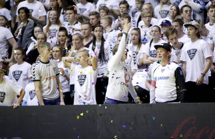 Umfjöllun, viðtöl og myndir: ÍBV - Haukar 23-21 | Ótrúlegur lokakafli Eyjamanna Ingvi Þór Sæmundsson í Laugardalshöll skrifar 27. febrúar 2015 12:28 Theodór Sigurbjörnsson fagnar í kvöld. vísir/andri ÍBV vann Hauka, 23-21, í seinni undanúrslitaleiknum í Coca-Cola bikar karla í handbolta í kvöld. Eyjamenn mæta FH-ingum í úrslitaleiknum á morgun en þetta er aðeins í annað sinn í sögu félagsins sem ÍBV kemst í bikarúrslitaleikinn. Í síðustu ferð sinni þangað, fyrir 24 árum, unnu þeir Víkinga, 26-22, og ef Eyjamenn ná upp sömu spilamennsku og á lokakafla leiksins í kvöld eiga þeir góða möguleika á að bæta öðrum bikar í safnið. Haukarnir voru sterkari aðilinn í fyrri hálfleik þar sem Janus Daði Smárason og Giedrius Morkunas fóru fyrir liði Hafnfirðinga. Janus skoraði fimm mörk í fyrri hálfleik og átti auk þess nokkrar fallegar línusendingar sem skiluðu marki. Á hinum helmingi vallarins var Giedrius öflugur en Litháinn varði alls 11 skot í fyrri hálfleik, eða 52% þeirra skota sem hann fékk á sig. Eyjamenn voru fyrri til að skora í upphafi leiks en smám saman náðu Haukarnir undirtökunum. Þeir stoppuðu í götin í vörninni og voru duglegir að keyra fram völlinn við hvert tækifæri. Í stöðunni 6-7 varð umdeilt atvik þegar Grétari Þór Eyþórssyni, vinstri hornamanni Eyjamanna, var vikið af velli fyrir að skjóta boltanum í höfuð Giedriusar úr vítakasti. Ungur strákur, Hákon Daði Styrmisson, kom inn í hornið í stað Grétars og stóð heldur betur fyrir sínu. Hákon misnotaði fyrstu tvö skotin sín en sýndi styrk og skoraði fjögur mörk úr næstu fimm skotum sínum. Hann stal boltanum auk þess í þrígang. Haukarnir komust þremur mörkum yfir, 7-10, þegar Heimir Óli Heimisson skoraði sitt fyrsta og eina mark í leiknum. Eyjamenn svöruðu með tveimur mörkum en Hafnfirðingar áttu góðan endasprett í fyrri hálfleik. Þeir skoruðu fjögur mörk gegn einu Eyjamanna á síðustu fimm mínútum fyrri hálfleiks og fóru með fjögurra marka forystu, 10-14, til búningsherbergja. Liðin fóru rólega af stað í seinni hálfleik þar sem varnarleikurinn var í fyrirrúmi. Það hentaði Haukum betur, verandi með forystuna. Sóknarleikur ÍBV var hugmyndasnauður og Giedrius reyndist Eyjamönnum áfram erfiður. Haukar náðu mest sex marka forystu, 12-18, en þá loksins komu Eyjamenn með áhlaup, skoruðu níu mörk í röð - þar af fimm eftir hraðaupphlaup - og komust þremur mörkum yfir, 21-18. Sóknarleikur Hauka var steingeldur á þessum kafla en Hafnfirðingar skoruðu ekki í 13 mínútur. Lykilmenn á borð við Tjörva Þorgeirsson og Árna Stein Steinþórsson náðu sér engan veginn á strik og þá gekk Haukum illa að finna sína sterku línumenn. Haukarnir áttu engin svör við frábærum leik Eyjamanna sem spiluðu stórkostlega í seinni hálfleik; vörnin var sterk, Kolbeinn Aron Arnarson varði nokkur skot og sóknin gekk glimrandi vel. Eyjamenn spiluðu af yfirvegun á lokakaflanum og sigldu tveggja marka sigri heim, 23-21. Agnar Smári Jónsson var markahæstur í liði ÍBV með sex mörk en Theodór Sigurbjörnsson og Hákon komu næstir með fjögur mörk hvor. Janus Daði skoraði átta mörk fyrir Hauka sem féllu einfaldlega saman á lokakafla leiksins. Giedrius gerði það sem hann gat og varði 20 skot í Haukamarkinu.Theodór: Alltaf dreymt um að spila hér Theodór Sigurbjörnsson, hornamaður ÍBV, var í sigurvímu þegar Vísir hitti hann að máli eftir sigurinn ótrúlega á Haukum í undanúrslitum Coca-Cola bikarsins. "Það gerist ekki sætara en þetta. Við erum loksins komnir í Höllina og það er ekki leiðinlegt að fá annan leik á morgun. "Ég hafði bara verið hér sem áhorfandi og alltaf dreymt um að koma hingað og spila. "Þetta er ótrúlega skemmtilegt og frábært að spila fyrir framan þessa áhorfendur," sagði Theodór en hvað gerðist eiginlega á síðustu 17 mínútum leiksins þegar Eyjamenn breyttu stöðunni úr 12-18 í 23-21? "Það er þannig með okkur Eyjamenn að við gefumst aldrei upp, sama hvernig staðan er. Við gefumst aldrei, höfum aldrei gert og munum aldrei gera það. "Vörnin small á þessum kafla og við fengum hraðaupphlaup, það var lykilinn að sigrinum," sagði Theodór en hvað fannst honum um rauða spjaldið sem samherji hans, Grétar Þór Eyþórsson, fékk í fyrri hálfleik fyrir að skjóta boltanum í höfuð Giedriusar Morkunas, markvarðar Hauka? "Ég veit það ekki, mér fannst þetta ekki vera rautt. Mér fannst hann hreyfa hausinn með skothöndinni. En dómararnir mátu það sem svo að þetta væri rautt," sagði Theodór og bætti því við að rauða spjaldið hefði sett Eyjamenn aðeins út af laginu. ÍBV mætir FH í úrslitaleiknum á morgun en Hafnfirðingar fóru áfram eftir tvíframlengdann undanúrslitaleik fyrr í dag. "Þeir verða kannski þreyttir en fá reyndar auka klukkutíma til að undirbúa sig, þannig að þetta kemur út á eitt," sagði Theodór að lokum.Hákon Daði: Bjóst kannski við að fá nokkrar mínútur í lokin Hákon Daði Styrmisson var ein af hetjum ÍBV þegar liðið tryggði sér sæti í úrslitaleik Coca-Cola bikarsins með ótrúlegum sigri á Haukum í kvöld. Hákon kom inn á í vinstra hornið um miðjan fyrri hálfleik eftir að Grétar Þór Eyþórsson fékk að líta rauða spjaldið. Hann segist ekki hafa átt von á því að spila svona mikið í kvöld. "Nei, alls ekki. Ég bjóst kannski við að fá nokkrar mínútur í lokin ef þetta hefði verið öruggt," sagði Hákon en hvernig var að koma inn í þennan leik? "Það er ekki erfitt að koma inn í svona lið. Það standa allir saman, ef þú klikkar færðu klapp á bakið og svona. "Ég klikkaði á fyrstu tveimur færunum en síðan kom þetta. Það var enginn að pæla í því, það er bara næsta færi," sagði H