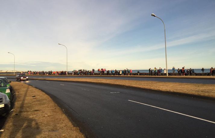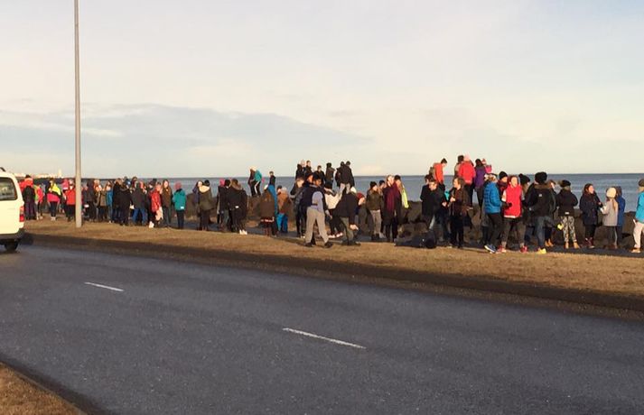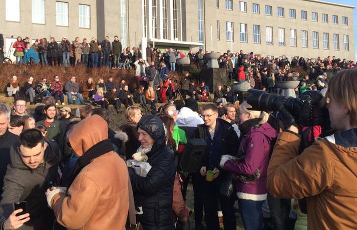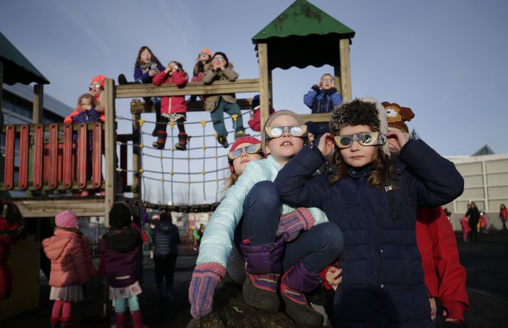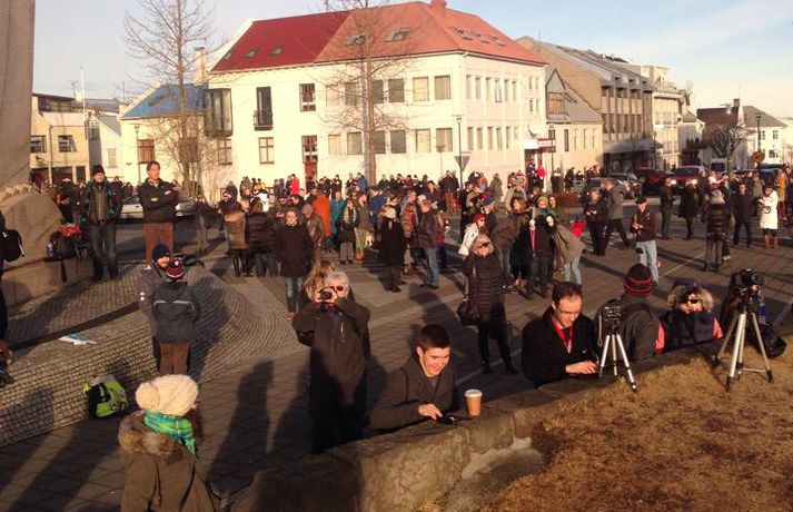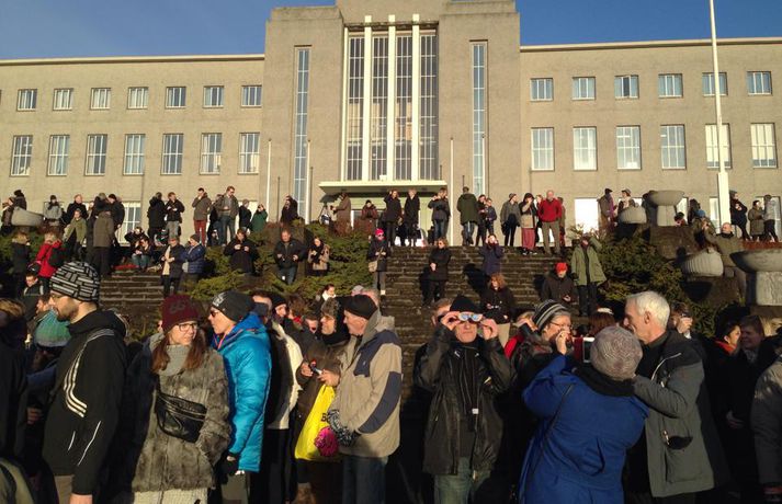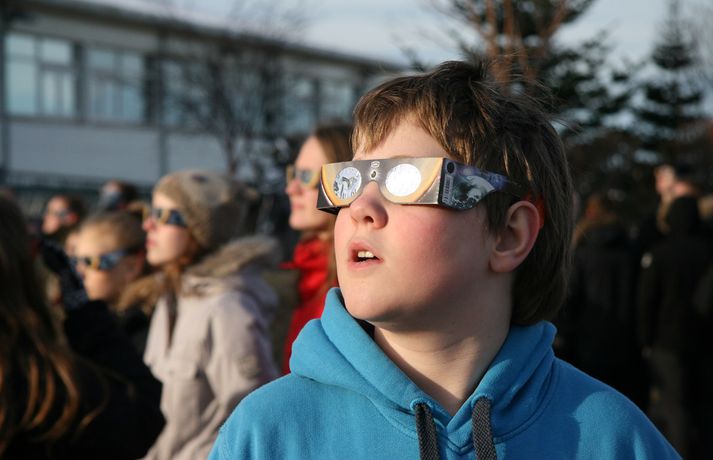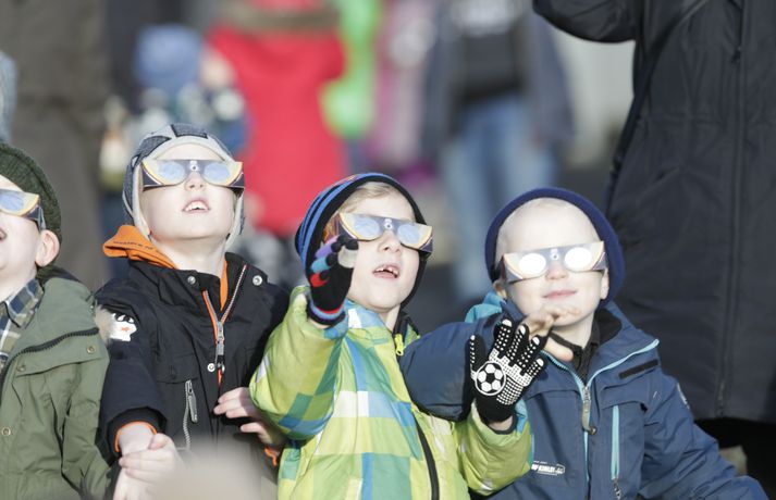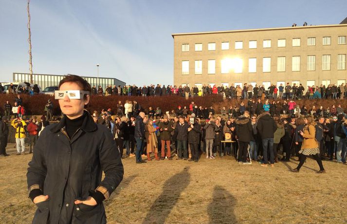 Fólk hópaðist saman til að fylgjast með sólmyrkvanum Atli Ísleifsson og Sunna Kristín Hilmarsdóttir skrifa 20. mars 2015 09:25 Fólk kom saman við Perluna til að fylgjast með sólmyrkvanum Vísir/Pjetur Fólk hópaðist saman út um allt til fylgjast með sólmyrkvanum. Mikill fjöldi kom saman, meðal annars við Háskóla Íslands, Hörpu, Hallgrímskirkju, Perluna og þar sem hof ásatrúarmanna rís í Öskjuhlíð. Sólmyrkvi verður þegar tunglið gengur milli sólar og jarðar og myrkvar þannig sólina að hluta eða í heild séð frá Jörðinni. Sólmyrkvinn stóð yfir í um tvo klukkutíma. Hann hófst í Reykjavík klukkan 8:38 og náði hámarki sínu klukkan 9:37. Annars staðar á landinu munaði einni til tveimur mínútum til eða frá. Sólmyrkvinn er almyrkvi og stóð lengst í 2 mínútur og 47 sekúndur. Almyrkvi sést í Færeyjum og á Svalbarða en ferill hans liggur um 70 kílómetra austur af suðausturhluta Íslands.Lesendur Vísis hafa sent inn fjölda mynda frá sólmyrkvanum og má sjá þær í myndaalbúminu hér að ofan. Við tökum að sjálfsögðu við fleiri myndum í gegnum netfangið ritstjorn@visir.is og á Facebook-síðunni Vísis.Frá Skólavörðuholti.Vísir/Fólk hefur safnast saman, meðal annars á þaki aðalbyggingar Háskóla Íslands.Mynd/Ilmur DöggLæknarnir á Landspítalanum fundu sniðuga lausn til að fylgjast með. Röntgenfundur! X-ray meeting! #Sólmyrkvi #eclipse2015 pic.twitter.com/fBAmUIYQ0j— Eiríkur Guðmundsson (@eirikurorrig) March 20, 2015 Starfsfólk utanríkisráðuneytisins fylgdist með á svölunum á Rauðarárstíg. Post by Utanríkisráðuneytið. Garðar Gunnnlaugsson leyfði dóttur sinni að fylgjast með myrkvanum. Victoria vann sólgleraugnakeppnina í dag #solmyrkvi A photo posted by Garðar Gunnlaugsson (@gaddigull) on Mar 20, 2015 at 2:06am PDT #Harpa, the happening place today! #evefanfest #eclipse2015 #Sólmyrkvinn pic.twitter.com/nb2cOIe0Fy— Greipur Gíslason (@GreipurGisla) March 20, 2015 Wouldn't surprise me if these were CCP staff on the Harpa #evefanfest #evefanfest2015 pic.twitter.com/cEyUSF1SXK— Roc Wieler (@RocWieler) March 20, 2015 Photo: Ready for #solareclipse Thank you @pinkiceland #ReykjavikLife (at Reykjavík, Iceland) http://t.co/10NLIfuag2— KvosinDowntownHotel (@KvosinHotel) March 20, 2015 Veður Mest lesið Grunaður um að nauðga konu þrisvar sömu nóttina Innlent Segir Bandaríkin ekki geta ráðist inn Erlent „Gætir verið pirrandi við matarborðið en það er þess virði“ Innlent „Aldrei fyrirgefanlegt þegar það er farið svona með opinbert fé“ Innlent Vilja rýmri reglur um veiðar fjögurra fuglategunda Innlent Mamdani mælist með gott forskot degi fyrir kosningar Erlent Þúsundir hafi orðið af milljónum Innlent Annar hinna handteknu látinn laus: „Drepið mig, drepið mig, drepið mig“ Erlent Tvö pör handtekin og afskipti höfð af tvímenningum Innlent Bandarískir erindrekir hótuðu evrópskum kollegum sínum Erlent Fleiri fréttir Foreldrar langveikra barna einangruð og endi jafnvel sem öryrkjar Vilja rýmri reglur um veiðar fjögurra fuglategunda Tvö pör handtekin og afskipti höfð af tvímenningum Grunaður um að nauðga konu þrisvar sömu nóttina „Aldrei fyrirgefanlegt þegar það er farið svona með opinbert fé“ Hjóluðu 1300 kílómetra meðfram Dóná með börnum sínum „Gætir verið pirrandi við matarborðið en það er þess virði“ Kynlífsverkafólk í Norræna húsinu og tölvuspilandi eldri borgarar Moskítóflugan lifði kuldakastið af „Þorsti í auglýsingafé er talsverður hjá Ríkisútvarpinu“ Hætta á að ákveðnir staðir þrífist ekki Velunnarar hefja söfnun fyrir ekkju Hjörleifs Þúsundir hafi orðið af milljónum Hundrað þúsund færri kindur í dag en fyrir tíu árum Dökk mynd í byggingariðnaði, umsvif RÚV og fækkun fjár Losun gróðurhúsalofttegunda jókst í Reykjavík Húsnæðismálin og staða Ríkisútvarpsins Ölvaður undir stýri með börn í bílnum Kosningahugur í eigendum frístundahúsa Keypti stól í Góða hirðinum sem reyndist fágætur gripur Getur gervigreindarsmjaður leitt til gervigreindargeðrofs? Söguleg óvissa á fasteignamarkaði og meðvirk gervigreind Óttast að námsbraut verði undir verði af frumvarpinu Kostnaður við stjórnsýslu borgarinnar mun hærri en landsmeðaltalið Tveir fá heilablóðfall á hverjum degi á Íslandi Breytingar sem litlu breyta og mokstursmenn þakka veðurguðunum Líta eigi á eignir landsbyggðafólks í Reykjavík sem sumarbústaði Sendi síðasta bréfið degi áður en fellibylurinn gekk yfir Borgin tekur út framkvæmdir við Vesturbæjarlaug Nokkrar milljónir horfnar á örfáum vikum Sjá meira