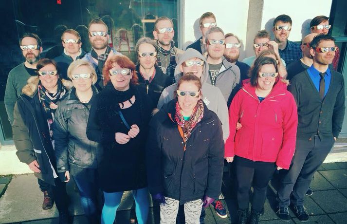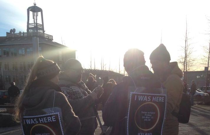 Fólk hópaðist saman út um allt til fylgjast með sólmyrkvanum. Mikill fjöldi kom saman, meðal annars við Háskóla Íslands, Hörpu, Hallgrímskirkju, Perluna og þar sem hof ásatrúarmanna rís í Öskjuhlíð. Sólmyrkvi verður þegar tunglið gengur milli sólar og jarðar og myrkvar þannig sólina að hluta eða í heild séð frá Jörðinni. Sólmyrkvinn stóð yfir í um tvo klukkutíma. Hann hófst í Reykjavík klukkan 8:38 og náði hámarki sínu klukkan 9:37. Annars staðar á landinu munaði einni til tveimur mínútum til eða frá. Sólmyrkvinn er almyrkvi og stóð lengst í 2 mínútur og 47 sekúndur. Almyrkvi sést í Færeyjum og á Svalbarða en ferill hans liggur um 70 kílómetra austur af suðausturhluta Íslands.Lesendur Vísis hafa sent inn fjölda mynda frá sólmyrkvanum og má sjá þær í myndaalbúminu hér að ofan. Við tökum að sjálfsögðu við fleiri myndum í gegnum netfangið ritstjorn@visir.is og á Facebook-síðunni Vísis.Frá Skólavörðuholti.Vísir/Fólk hefur safnast saman, meðal annars á þaki aðalbyggingar Háskóla Íslands.Mynd/Ilmur DöggLæknarnir á Landspítalanum fundu sniðuga lausn til að fylgjast með. Röntgenfundur! X-ray meeting! #Sólmyrkvi #eclipse2015 pic.twitter.com/fBAmUIYQ0j— Eiríkur Guðmundsson (@eirikurorrig) March 20, 2015 Starfsfólk utanríkisráðuneytisins fylgdist með á svölunum á Rauðarárstíg. Post by Utanríkisráðuneytið. Garðar Gunnnlaugsson leyfði dóttur sinni að fylgjast með myrkvanum. Victoria vann sólgleraugnakeppnina í dag #solmyrkvi A photo posted by Garðar Gunnlaugsson (@gaddigull) on Mar 20, 2015 at 2:06am PDT #Harpa, the happening place today! #evefanfest #eclipse2015 #Sólmyrkvinn pic.twitter.com/nb2cOIe0Fy— Greipur Gíslason (@GreipurGisla) March 20, 2015 Wouldn't surprise me if these were CCP staff on the Harpa #evefanfest #evefanfest2015 pic.twitter.com/cEyUSF1SXK— Roc Wieler (@RocWieler) March 20, 2015 Photo: Ready for #solareclipse Thank you @pinkiceland #ReykjavikLife (at Reykjavík, Iceland) http://t.co/10NLIfuag2— KvosinDowntownHotel (@KvosinHotel) March 20, 2015