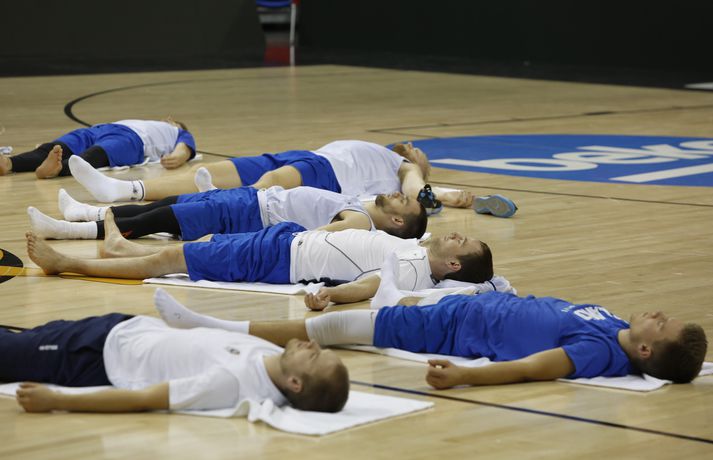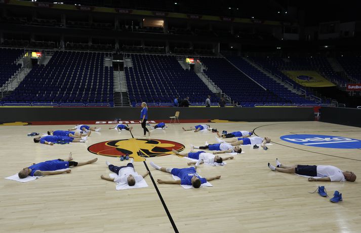 Íslenska körfuboltalandsliðið fékk tækifæri til að slaka vel á þegar liðið var á æfingu í Mercedens Benz höllinni í Berlín. Í dag var hvíldardagur hjá íslenska liðinu á Evrópumótinu og það var hugað vel að andlega þættinum á einu æfingu dagsins. Ástæðan fyrir afslöppuninni var að Körfuknattleikssambandið fékk Ásdísi Þorgilsdóttur til að fara með allt liðið í jóga. „Hún er búin að taka liðið nokkrum sinnum í jóga í sumar og það var tilvalið að fá hana til að hjálpa okkur með þetta þar sem að hún var á svæðinu," segir Finnur Freyr Stefánsson, aðstoðarþjálfari íslenska liðsins. Ásdís Þorgilsdóttir, sem á sínum tíma lék knattspyrnu með Keflavík og KR, er íþróttakennari og eiginkona Gunnars Einarssonar, styrktarþjálfara íslenska liðsins. Ásdís stýrði jóga og afslöppun strákanna út á miðju gólfi í hinni glæsilegu Mercedens Benz höll. Það var mjög sérstök sjón fyrir íslensku blaðamennina þegar þeir fengu að fara inn í höllina í dag og þar blasti við allt íslenska liðið liggjandi út á miðju gólfi. Ásdís þekkir vel til þessa hluta enda starfar hún sem bæði einkaþjálfari og jógakennari. „Það er lítið sem við getum gert á frídeginum. Strákarnir sem hafa verið að spila minna tóku þátt í hörkuæfingu, aðrir eru að hvíla og sumir eru með þau skilaboð að þeir eigi ekkert að hreyfa sig,“ sagði Finnur. Íslenska landsliðið mætir Serbíu á morgun en það er þriðji leikur liðsins á Evrópumótinu. Leikurinn hefst klukkan 14.30 að staðartíma eða klukkan 12.30 að íslenskum tíma.