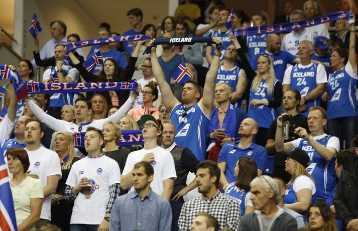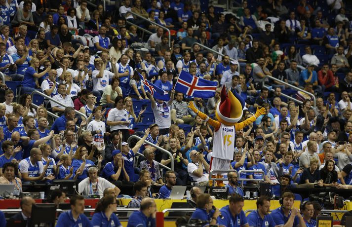 Íslenska körfuboltalandsliðið er kannski stigalaust eftir fyrstu tvo leiki sína á Evrópumótinu í körfubolta en frammistaða íslensku strákanna hefur verið margra stiga virði. Íslenska liðið þurfti að sætta sig við sjö stiga tap á móti Ítölum í kvöld, 71-64, daginn eftir að liðið tapaði með sex stigum fyrir Þjóðverjum. Stórkostleg frammistaða íslenska körfuboltalandsliðsins á móti Ítalíu í kvöld dugði ekki til sigurs en íslenska liðið og íslensku áhorfendurnir unnu hug og hjarta allra sem á horfðu nema kannski dómaraþríeykisins sem var með NBA-stjörnur í augum í þessum leik. Ítalirnir voru með Jón Arnór Stefánsson í mjög strangri gæslu en þá losnaði um aðra sem nýttu sér það vel. Haukur Helgi Pálsson (17 stig) og Hlynur Bæringsson (14 stig) fóru þar fremstir en eins og áður voru allir leikmenn liðsins að skila öllu sínu í baráttuna og varnarleikinn. Íslenska liðið var inn í leiknum allan tímann ólíkt fyrsta leiknum á móti Þjóðverjum og komst yfir í öllum leikhlutunum. Liðið náði samt ekki að vinna neinn af leikhlutunum og slæmur kafli í lok fyrri hálfleiks, þar sem Ítalir skoruðu 10 stig í röð, var dýrkeyptur á lokamínútunum. Íslensku skytturnar voru heitar í upphafi og fimm leikmenn íslenska liðsins skoruðu þriggja stiga körfur á fyrstu fimm mínútum leiksins. Íslenska vörnin var hinsvegar ekki eins öflug í byrjun leiks og á móti Þjóðverjum í gær. Það tók Ítala sem dæmi aðeins fimm sekúndur að skora, fiska víti að auki og komast í 3-0. Ítalir nýttu sér að íslenska vörnin var ekki eins vakandi og voru komnir í 22-15 eftir aðeins sjö mínútna leik. Þá fóru hlutirnir að gerast, Hlynur Bæringsson skoraði tvær fyrstu körfur sínar á mótinu inn í teig og Haukur Helgi Pálsson minnkaði muninn í eitt stig, 22-21, úr hraðaupphlaupi. Logi Gunnarsson byrjaði síðan annan leikhlutann með flotta körfu og kom Íslandi yfir í 23-22. Átta íslensk stig í röð og allt annað að sjá vörnina sem var nú búin að skipta í EM-gírinn. Íslenska liðið hélt áfram að loka flestum leiðum fyrir ítalska liðið og Haukur Helgi Pálsson setti síðan niður þrista í tveimur sóknum í röð og kom Íslandi yfir í 35-31 en Haukur var þá kominn með ellefu stig í leiknum. Pavel Ermolinskij fór í framhaldinu á vítalínuna og skoaði sín fyrstu stig á EM. Þarna var íslenska liðið búið að skora átta stig í röð og komið sex stigum yfir, 37-31. Íslenska liðið skoraði hinsvegar ekki stig síðustu þrjár mínútur leiksins og Ítalir enduðu hálfleikinn á 10-0 spretti þar sem Alessandro Gentile fór mikinn. Ítalir voru því fjórum stigum yfir, 41-37, þegar liðin gengu til leikhlés. Danilo Gallinari skoraði ekki og spilaði bara 4 mínútur í fyrri hálfleiknum vegna villuvandræða. Hann skoraði hinsvegar fyrstu stig seinni hálfleiks. Skömmu síðar skoruðu ítalir eftir sóknarfrákast og voru því komnir átta stigum yfir, 45-37. Jón Arnór Stefánsson skoraði tvær góðar körfur í röð og kom muninum aftur niður í fjögur stig, 45-41. Jón Arnór ætlaði ekki að gefa þetta frá sér. Þristur frá Hlyni Bæringssyni minnkaði muninn síðan niður í eitt stig, 45-44 með að setja niður enn einn þristinn sinn á mótinu. Íslenska vörnin hélt nokkuð vel út þriðja leikhlutann en skotin voru ekki að rata rétta leið. Ítalir voru af þeim sökum fjórum stigum yfir fyrir lokaleikhlutann, 52-48. Ísland skoraði fjögur fyrstu stig fjórða leikhlutans og jafnaði metin í 52-52. Daniel Hackett svaraði með tveimur körfum í röð og kom ítalska liðinu yfir í 57-52. Með baráttuna að vopni héldu íslensku strákarnir áfram, þristur frá Hauki kom muninum niður í tvö stig og víti frá Hlyni þýddi að Ítalir voru bara einu stigi yfir þegar fjórar og hálf mínúta var eftir. Hörður Axel Vilhjálmsson kom Íslandi síðan yfir, 60-59 og Ítalir urðu að taka leikhlé þegar 3:22 mínútur voru eftir af leiknum. Hlynur setti niður tvö víti og Ísland var nú þremur stigum yfir, 62-59, þegar þrjár mínútur voru eftir. Marco Belinelli fékk þá þrjú ódýr víti, setti þau öll niður og jafnaði metin. Pietro Aradori skoraði og fékk víti að auki sem hann nýtti og Ítalir voru komir í 65-62. Ítalnir voru að fá víti dæmd í gríð og erg á þessum tíma. Pietro Aradori setti niður tvö og munurinn var orðinn fimm stig, 67-62, þegar 1:50 var eftir. Alessandro Gentile var erfiður í kvöld og hann kom Ítalíu í 69-62 þegar rétt rúm mínúta var eftir. Kappinn var þá kominn með 19 stig og tók heldur betur upp hanskann fyrir Danilo Gallinari sem var í miklum villuvandræðum. Ísland tók leikhlé og skipulagði síðasta áhlaupið. Sjö stiga munur og 63 sekúndur eftir af leiknum. Hlynur fékk strax tvö víti en nýtti bara annað þeirra. Íslenska liðið barðist hinsvegar áfram en Ítalirnir náðu að landa sjö stiga sigri, 71-64. Dómararnir leiksins sendu þá hvað eftir annað á vítalínuna í lokin og það vóg þungt. Íslenska liðið var meðhöndlað eins og pínulitla liðið af dómaraþríeykinu og það er miður.Atkvæðamestir í íslenska liðinu á móti Ítalíu: Haukur Helgi Pálsson 17 stig og 5 fráköst Hlynur Bæringsson 14 stig og 7 fráköst Jón Arnór Stefánsson 11 stig og 6 stoðsendingar Jakob Örn Sigurðarson 7 stig Hörður Axel Vilhjálmsson 5 stig, 3 fráköst og 3 stoðsendingar Martin Hermannsson 4 stig Logi Gunnarsson 4 stig Pavel Ermolinskij 2 stig, 4 fráköst og 3 stoðsendingarVísir/ValliHlynur Bæringsson: Stórkostleg tilfinning að fá að upplifa þetta „Þetta er gríðarlegt svekkelsi og vonbrigði," voru fyrstu viðbrögð Hlyns Bæringssonar, leikmann íslenska landsliðsins í körfubolta, eftir grátlegt tap gegn Ítalíu á EM. „Við erum þre