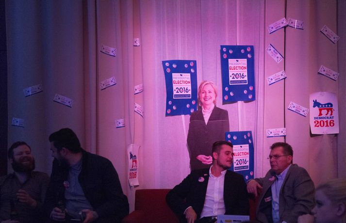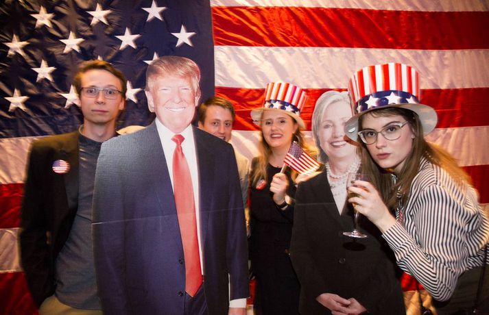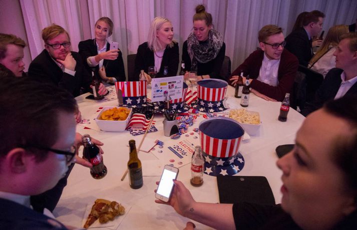 Það var múgur og margmenni á kosningavöku bandaríska sendiráðsins á Hilton Hotel Nordica þegar Eyþór Árnason ljósmyndari Vísis og Fréttablaðsins leit þar við fyrr í kvöld. Haldnar voru forsetakosningar í salnum þar sem viðstaddir gátu kosið á milli þeirra Hillary Clinton og Donald Trump. Kom þá í ljós að mikill meirihluti þeirra sem voru í salnum kusu Hillary, eða um 85 prósent. Það er því eðlilega mikið fagnað á vökunni þegar Clinton gengur vel en samkvæmt blaðamanni Vísis sem er á vökunni er mikið stuð á vökunni þar sem fólk fylgist grannt með nýjustu tölum. Þá er nóg af kræsingum á boðstólnum; Krispy Kreme, KFC, Taco Bell og pizzur frá Pizza Hut. I myndaalbúminu hér að ofan má skoða myndir frá vökunni frá því fyrr í kvöld.