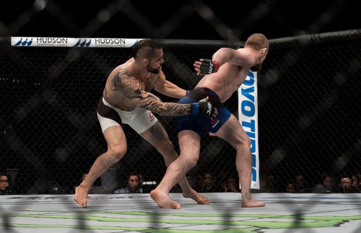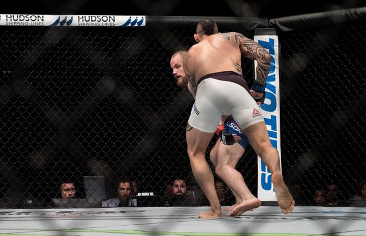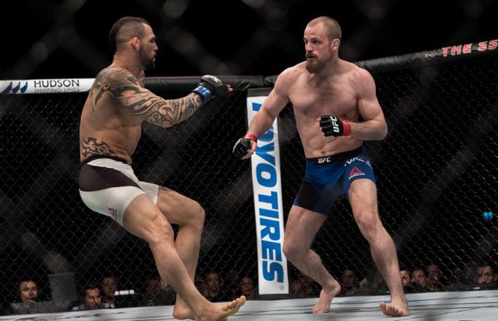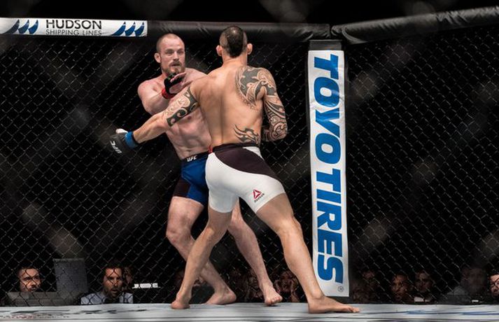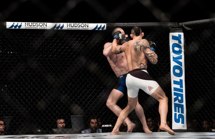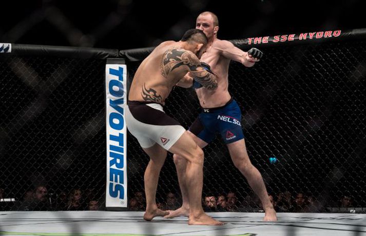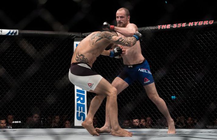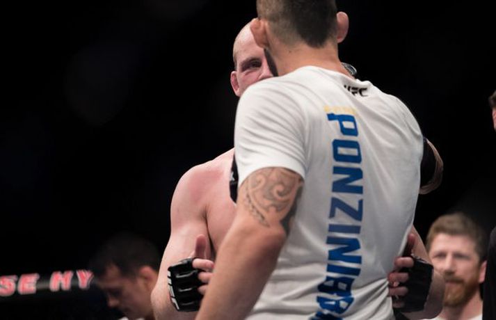 Gunnar Nelson beið lægri hlut fyrir Santiago Ponzinibbio í Glasgow í gærkvöldi. Eftir bardagann kvartaði Gunnar yfir því að Argentínumaðurinn hefði potað í augað á sér. „Ég sló hann alveg í byrjun og þá tróð hann puttanum upp í augað á mér á sama tíma. Eftir það sá ég tvöfaldan Ponzinibbio það sem eftir var. Ég er mjög fúll út í sjálfan mig að hafa ekki stoppað þarna. Ég varð gráðugur því mér fannst ég vera með hann,“ sagði Gunnar í samtali við Vísi eftir bardagann. Á myndinni hér fyrir neðan má sjá að Gunnar hefur ýmislegt til síns máls en ekki verður betur séð en Ponzinibbio poti í bæði augun á Gunnari.Ponzinibbio potar í augað á Gunnari.Mynd/Sóllilja BaltasarsMYND/MJOLNIR.IS/SÓLLILJA BALTASARSDÓTTIR