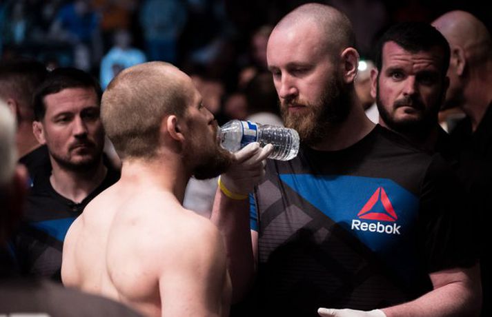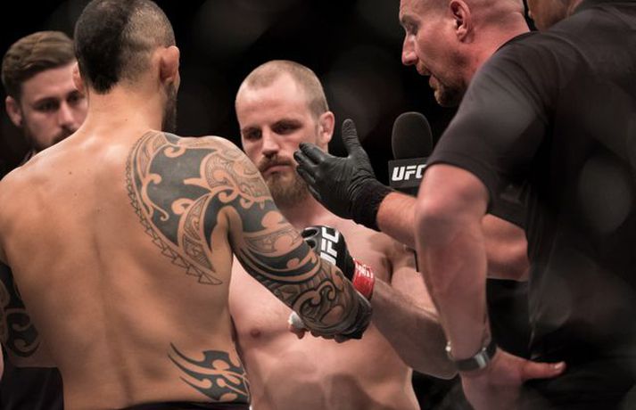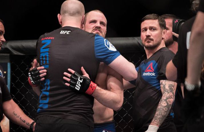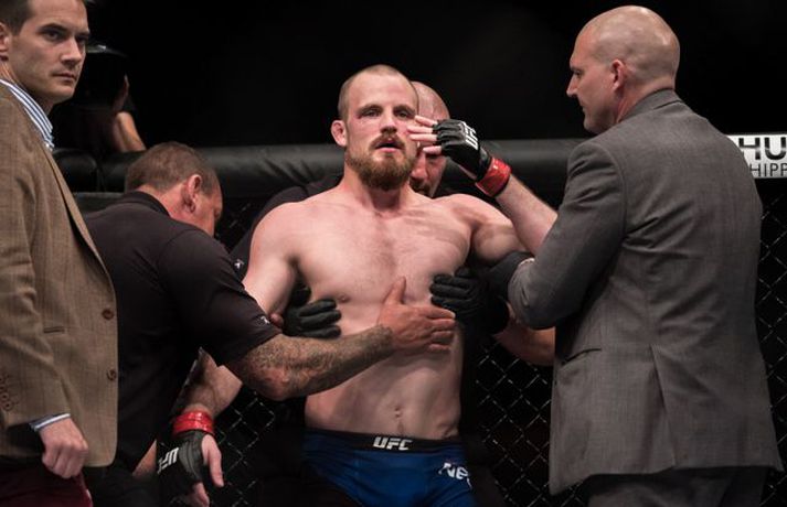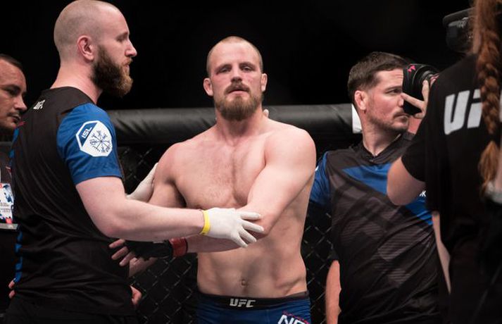 Ponzinibbio potaði í augað á Gunnari | Mynd Ingvi Þór Sæmundsson skrifar 17. júlí 2017 10:30 Gunnar Nelson beið lægri hlut fyrir Santiago Ponzinibbio í Glasgow í gærkvöldi. Eftir bardagann kvartaði Gunnar yfir því að Argentínumaðurinn hefði potað í augað á sér. „Ég sló hann alveg í byrjun og þá tróð hann puttanum upp í augað á mér á sama tíma. Eftir það sá ég tvöfaldan Ponzinibbio það sem eftir var. Ég er mjög fúll út í sjálfan mig að hafa ekki stoppað þarna. Ég varð gráðugur því mér fannst ég vera með hann,“ sagði Gunnar í samtali við Vísi eftir bardagann. Á myndinni hér fyrir neðan má sjá að Gunnar hefur ýmislegt til síns máls en ekki verður betur séð en Ponzinibbio poti í bæði augun á Gunnari.Ponzinibbio potar í augað á Gunnari.Mynd/Sóllilja BaltasarsMYND/MJOLNIR.IS/SÓLLILJA BALTASARSDÓTTIR MMA Tengdar fréttir Ponzinibbio sigraði Gunnar | Myndasyrpa Gunnar Nelson beið ósigur fyrir Santiago Ponzinibbio í Glasgow í gærkvöldi. Þetta var þriðja tap Gunnars í síðustu sex bardögum. 17. júlí 2017 09:30 Gunnar: Ég varð gráðugur Gunnar Nelson var svekktur út í sjálfan sig er Vísir hitti hann eftir bardagann gegn Santiago Ponzinibbio í Glasgow. 16. júlí 2017 23:34 Ponzinibbio: Ég er besti bardagamaður heims Argentínumaðurinn Santiago Ponzinibbio mætir Gunnari Nelson í Glasgow í kvöld. Hann var hvers manns hugljúfi á fjölmiðladeginum. Talaði ágæta ensku en einhverra hluta vegna gekk honum illa að skilja aðra sem töluðu tungumálið. En honum líður vel og er þakklátur fyrir þetta stóra tækifæri. 16. júlí 2017 19:00 Twitter-samfélagið í losti: Fyrst var þögn, síðan kom þruman Santiago Ponzinibbio sigraði Gunnar Nelson í Glasgow í kvöld. 16. júlí 2017 22:20 Svona var bardagavikan hjá Gunnari | Kíkt á bak við tjöldin Mjölnir var að gefa frá sér frábært myndband þar sem fylgst er með Gunnari Nelson frá því hann fór að heiman frá sér í Reykjavík og nánast þar til hann stígur í búrið í Glasgow. 16. júlí 2017 16:54 Sjáðu svipmyndir úr bardaga Gunnars | Myndband Gunnar Nelson var rotaður af argentínska Santiago Ponzinibbio eftir aðeins 82 sekúndur á UFC 214 bardagakvöldinu í Glasgow í kvöld en þetta var þriðja tap Gunnars á UFC-ferlinum. 16. júlí 2017 22:15 Ponzinibbio rotaði Gunnar Frábærlega heppnuðu bardagakvöldi í Glasgow er lokið þar sem Gunnar Nelson varð að sætta sig við mjög svekkjandi tap gegn Santiago Ponzinibbio. 16. júlí 2017 21:45 „Gunnar Nelson er harður gaur“ Argentínumaðurinn Santiago Ponzinibbio kom, sá og sigraði í kvöld. 16. júlí 2017 22:04 Mest lesið Óskar Hrafn fer ekki fet Íslenski boltinn Hákon Rafn hélt hreinu þegar Brentford flaug áfram Enski boltinn Spánn og Þýskaland mætast í úrslitum Fótbolti Anguissa hetja meistaranna Fótbolti Martin öflugur í góðum sigri Körfubolti Verstappen telur sig ekki geta barist um titilinn Formúla 1 Leikið á Þróttaravelli á miðvikudag Fótbolti Jón Dagur gulltryggði sigurinn með sínu fyrsta marki Fótbolti Fær þrjár milljónir á dag næstu sex árin fyrir að gera ekkert Sport Vonast til að komast í Kórinn: „Menn hafa aldrei séð annað eins“ Fótbolti Fleiri fréttir Óskar Hrafn fer ekki fet Spánn og Þýskaland mætast í úrslitum Anguissa hetja meistaranna Hákon Rafn hélt hreinu þegar Brentford flaug áfram Martin öflugur í góðum sigri Verstappen telur sig ekki geta barist um titilinn Jón Dagur gulltryggði sigurinn með sínu fyrsta marki Leikið á Þróttaravelli á miðvikudag Vinícius Júnior íhugar að yfirgefa Real Madríd Kaupir sér tveggja milljarða króna hús Alexander Máni með fimm mörk í tveimur leikjum og Ísland áfram Birnir frá Akureyri í Garðabæ Klobbaði íslensku strákana og fór á flug á netmiðlum Teitur inn í landsliðið Hættir með Fram Landsliðskonur aðstoðuðu ökumenn í vanda Öllum leikjum Bónus-deildar kvenna í kvöld frestað Arnar skilur ekkert í Tottenham Landsleiknum aflýst og framhaldið óljóst Bardagakapparnir vilja ólmir fá að keppa í Hvíta húsinu Segir að Slot verði að taka tvo leikmenn út úr Liverpool-liðinu Vonast til að komast í Kórinn: „Menn hafa aldrei séð annað eins“ Markvörður Inter banaði háöldruðum manni í hjólastól „Alltaf gaman að fá nýjar raddir inn“ Gleðifréttir fyrir Argentínumenn: Messi vill spila á HM „Sagan hefur sýnt það að ég er góður að þjálfa unga og efnilega leikmenn“ Stöðufundur í Laugardal klukkan 10:30 Enska úrvalsdeildin í jólaköttinn Nýi íþróttastjóri Kjartans stal mörgæs og endaði í fangelsi í Singapúr Tyrkneska sambandið segir dómara hafa veðjað á þúsundir leikja Sjá meira