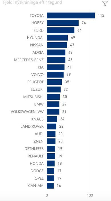 Fjöldi nýskráninga eftir tegund í maí 2020 Húsbíla og hjólhýsaframleiðandinn Hobby var næst mest nýskráða tegund ökutækja hér á landi í maí. Toyota vermdi topp sætið með 112 ökutæki nýskráð en Hobby var í öðru sæti með 74 eintök á meðan Ford nældi í þriðja sæti með 64 eintök. Ferðumst innanlands Ferðavagnar og húsbílar skapa stóran sess í listanum yfir nýskráð ökutæki, greinilegt að margir ætla að ferðast innanlands í sumar. Adria er annar framleiðandi ferðavagna sem nær á topp 10 lista yfir flest nýskráð ökutæki, í sjötta sæti með 43 eintök skráð í maí, að því er fram kemur á vef Samgöngustofu. Þessi aukna sala í ferðavögnum sést vel í nýskráningum eftir orkugjöfum. Flestar nýskráningar eru á vélarlausum ökutækjum eða 319. Þar á eftir kemur dísel með 310 og svo bensín með 284. Tesla sem kom inn í toppsætið með látum í mars þegar 403 nýjar Teslur voru nýskráðar, nýskráði í maí 10 bíla. Ifor Williams kerrur voru einnig nýskráðar 10 sem og Citroen bílar. Fjöldi nýskráninga eftir ökutækjaflokki í maí 2020. Flokkar ökutækja Fólksbifreiðar voru þó algengasti flokkur ökutækja sem ver nýskráður í maí, 607 eintök. Hjólhýsi voru næst stærsti flokkurinn með 208 og sendibifreiðar í flokki (N1) voru 130 í þriðja sæti. Jarðefnaeldsneyti eða vistvænni kostur? Samtals voru nýskráðir 594 ökutæki sem ganga fyrir bensín eða dísel. Rafbílar voru 136 og tvinnbílar samtals 246, það er bæði tengiltvinn og hefðbundnir tvinnbílar. Vistvænni kostirnir lúta því í lægra haldi fyrir jarðefnaeldsneytinu þennan mánuðinn með 383 bíla, það seldist einn metanbíll á móti 594 eins og áður sagði.