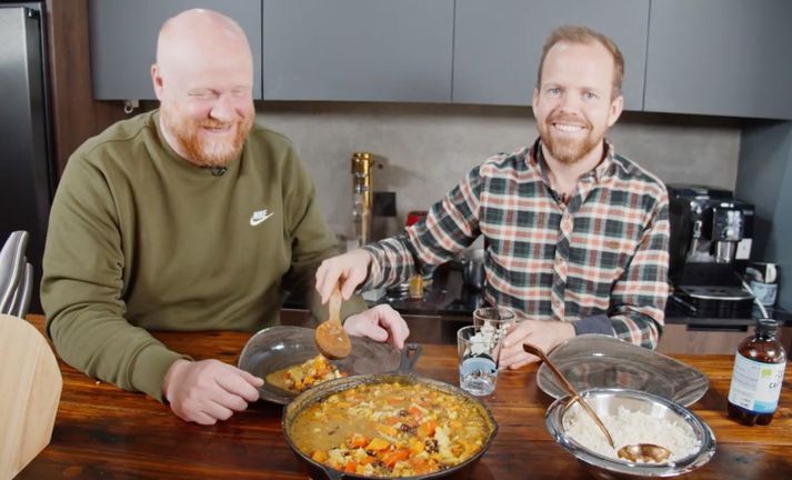 Möndlusmjörspottréttur að hætti Helga Jean Nettó 6. júní 2022 09:03 Helgi Jean fær skemmtilega gesti til sín í þáttinn Get ég eldað? Fyrsti gestur er grínistinn Hjálmar Örn og hjálpast þeir að við að elda girnilegan pottrétt. Hjálmar Örn er fyrsti gestur hlaðvarpsstjörnunnar Helga Jean í glænýjum matreiðsluþætti sem ber heitið Get ég eldað? en nafnið má rekja til þess að aðeins er ár síðan Helgi byrjaði að elda. Fram að því hafði hann enga trú á eldamennsku en segir hana hafa bætt líf hans til muna og nú gerir hann stanslausar tilraunir í eldhúsinu. Markmið þáttarins er að elda einfaldan og góðan mat án fyrirhafnar og mun Helgi fá til sín góða gesti í hvern þátt. Í þessum fyrsta þætti elda þeir Hjálmar og Helgi möndlusmjörspottrétt. Allt hráefnið í réttinn fæst í Nettó Klippa: Möndlusmjörspottréttur að hætti Helga Jean Uppskrift fyrir 3-4 1 dós kókosmjólk 1 400gr dós aduki baunir* 1 bolli villt hrísgrjón 400gr sætar kartöflur 200gr blómkál 1 lítil rauð paprika 200gr / 1 bolli ferskir tómatar 1/2 laukur 1/2 bolli vatn 2 msk möndlusmjör 1/2 bolli döðlur 1 tsk curry 1/2 tsk oregano 1/2 tsk thyme 1/2 tsk chili S&P Byrjið á því að setja vatn í pott ásamt hrísgrjónum, sjóðið samkvæmt leiðbeiningum. Fínskerið laukinn og steikið á vægum hita þar til mjúkur og ilmandi. Skerið sætar kartöflur í litla bita ásamt tómötum, blómkáli og papriku. Bætið kryddum og tómötum við laukinn og blandið vel. Þegar tómatarnir eru orðnir mjúkir, bætið restinni af grænmetinu út í ásamt kókosmjólk og vatni. Fáið upp væga suðu og lokið fyrir. Látið sjóða í u.þ.b. 20 mínútur eða þar til grænmetið er orðið mjúkt og hrærið reglulega. Bætið aduki baunum út í og lækkið hitann. Látið malla í 10 mínútur í viðbót. Þegar pottrétturinn hefur aðeins kólnað og allt grænmetið er orðið mjúkt ætti blandan að vera orðin aðeins þykkari. Berið fram með villtu hrísgrjónunum. (Uppskrift unnin frá Fræ.com) Matur Uppskriftir Mest lesið Brúðkaup ársins 2025 Lífið Cooper bað móðurina um hönd Hadid Lífið Heitt í hamsi hjá gestum á „helvíti á jörðu“ í Breiðholti Lífið „Mér finnst gaman að láta sjokkera mig“ Lífið Helvíti á jörðu: Emmsjé Gauti minnti á líkamsræktarþjálfara í maníu Gagnrýni Hefur misst vini og kunningja vegna skoðana sinna Lífið Veikindi eyðilögðu líka stóru stund Manúelu Lífið Einhverfir kaþólikkar um allan heim heita Þorlákur Lífið Leitin á Svínafellsjökli sem hefur enn ekki skilað árangri Lífið Stjörnulífið: Óskar tíkunum gleðilegra jóla Lífið Fleiri fréttir Mikils virði að gefa fólki frelsi til að velja Fjölbreyttir jólasmáréttir frá Kjarnafæði Snéru upp á klassískt jólalag Jólaundirbúningurinn byrjar í KiDS Coolshop Augnablikin sem urðu að minni þjóðar Setningar sem eiga skilið innrömmun Konráð kveður á mildan hátt Helvítis jólapizzan slær í gegn á Eldofninum Íslensk nauta- og sælkeratólg slær í gegn Sú besta hingað til Sjórinn er enn á sínum stað Þroskuð húð fær aukinn ljóma Mzungu þýðir ekki annað en trúgjörn bráð Amor svífur yfir Norðurlandi Aftenging í sítengdum heimi Spennandi nýjungar í íslensku konfekti Metsölulisti og enn betra bókaverð í Nettó Hröð og skemmtileg rússíbanareið EKOhúsið sér um umhverfisvænu jólagjafirnar Ekkert betra en sú þerapía að rifja sitt eigið líf upp Næturserum fyrir hárið – bylting í hárumhirðu Glóandi hættulestur Árni Már og Unnar Ari opna vinnustofuna á laugardaginn Fólk hafði af því miklar áhyggjur að ég ætlaði að „pipra“ Fallegu jólagjafirnar fást í Maí Alvöru ítalskur veitingastaður í hjarta borgarinnar Pöbbkviss 5 söluhæsta spil landsins Gefðu töfrandi skemmtun í jólagjöf Epli með nýja stórglæsilega verslun Konfektleikur í tilefni 90 ára afmælis Nóa Síríus Sjá meira