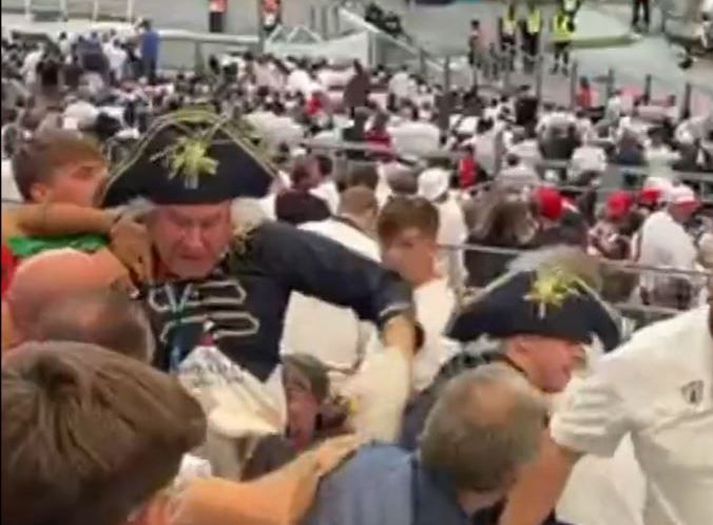 Slógust í Napóleon-búningum Ingvi Þór Sæmundsson skrifar 16. október 2023 14:31 Slagsmál í stúkunni settu svip sinn á leik Englands og Fídjí á HM í rúbbí. Ólæti brutust út í stúkunni fyrir leik Englands og Fídjí á HM í rúbbí meðal manna í grímubúningum. England vann leikinn, 30-24, og tryggði sér með því sæti í undanúrslitum HM sem fer fram í Frakklandi. Óeirðir í stúkunni á Stade Velodrome í Marseille settu þó svartan blett á sigur Englands. Það vakti talsverða athygli að sumir ólátabelgjanna voru klæddir eins Napóleon Frakklandskeisari eins og sjá má á myndbandinu hér fyrir neðan. Unsavoury scenes at Stade Velodrome as several England fans are removed for fighting.#RWC2023 #ENGvFIJ pic.twitter.com/ouuLhq7Ps0— The Good, The Bad & The Rugby (@GoodBadRugby) October 15, 2023 Nokkrir enskir stuðningsmanna voru fjærlægðir úr stúkunni og verða væntanlega hvergi sjáanlegir þegar England mætir Suður-Afríku í undanúrslitum HM á laugardaginn. Þessi lið mættust í úrslitaleik HM fyrir fjórum árum. Þar höfðu Suður-Afríkumenn betur, 32-12. Rugby Mest lesið Þessi tíu eru tilnefnd sem Íþróttamaður ársins 2025: 23 ára aldursmunur Sport Sakaður um niðurlægingu: „Við viljum ekki hafa hann sem þjálfara“ Handbolti Erfitt að vera í burtu þegar mamma greindist Fótbolti Sagan ekki sönn: „Veit ekki hvaðan þetta á að hafa komið“ Íslenski boltinn Slot mun sakna Isak í tvo mánuði eftir „glórulausa tæklingu“ Enski boltinn Einn leikmaður með samning og völlurinn ólöglegur Fótbolti Áfallið staðreynd og Isak búinn í aðgerð Enski boltinn Kansas frá Kansas til Kansas Sport Vildi tapa legg: „Mesti hávaði sem ég hef heyrt“ Sport Missti alveg stjórn á skapinu en það skilaði sigri Körfubolti Fleiri fréttir Glódís framlengir samninginn við Bayern Chelsea setur sig í samband við Semenyo Sagan ekki sönn: „Veit ekki hvaðan þetta á að hafa komið“ Hætt við að spila í Ástralíu en óvíst hvar leikurinn verður Neymar kominn á lappir og lofar að skora í úrslitaleik HM Tryggðu þrjú lið í úrslitakeppnina Jiménez jafnaði bestu vítaskyttu sögunnar Kansas frá Kansas til Kansas Slot mun sakna Isak í tvo mánuði eftir „glórulausa tæklingu“ Sjáðu „auma“ vítið sem skilaði Fulham sigri Hápunktur ársins að jafna pabba á heimavelli Missti alveg stjórn á skapinu en það skilaði sigri Erfitt að vera í burtu þegar mamma greindist „Svona lítur frábær ákvörðun út“ Sakaður um niðurlægingu: „Við viljum ekki hafa hann sem þjálfara“ Þessi tíu eru tilnefnd sem Íþróttamaður ársins 2025: 23 ára aldursmunur Dagskráin í dag: Kæst yfir NFL, pílu og enska boltanum Einn leikmaður með samning og völlurinn ólöglegur Vildi tapa legg: „Mesti hávaði sem ég hef heyrt“ Salah færði Egyptum draumabyrjun Fulham skildi Forest eftir við fallsvæðið Áfallið staðreynd og Isak búinn í aðgerð Neres hetja Napoli í Sádi-Arabíu Aron Einar lagði upp dýrmætt sigurmark Sagði látna systur sína hafa tryggt sigurinn ótrúlega Steraleikarnir segi ungu fólki að það sé aldrei nógu fullkomið Afkáralegt fagn hjá hetju Sambíu Glódís Perla veik í jólafríið en enn taplaus Hættur aðeins þrítugur Glódís og Hákon best í fótboltanum á árinu Sjá meira