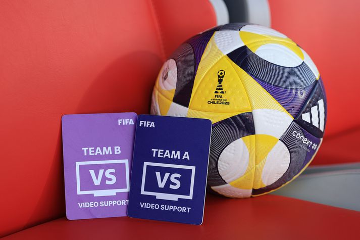 Á heimsmeistaramóti tuttugu ára og yngri, sem stendur nú yfir, er nýstárleg tilraun í gangi. Þjálfarar liðanna fá þá afhent sérstök áfrýjunarspjöld. Þjálfarnir hafa síðan tækifæri til að kæra tvo dóma í sínum leik, það er senda þá í frekari skoðun hjá myndbandsdómurum og svo væntanlega mun dómarinn fara á skjáinn í beinu framhaldi. Spjöldin eru hluti af nýju kerfi sem kallast Football Video Support (FVS) og er verið að prófa á HM U-20 ára landsliða og í öðrum minni deildum og mótum. Nýju VAR-spjöldin fyrir þjálfarana eru blá og fjólublá.Getty/Buda Mendes Sífellt fleiri keppnir sem hafa ekki fjármagn eða úrræði fyrir fullkomna VAR-tækni eru að innleiða tilraunaverkefni fyrir kerfið, sem FIFA hefur lýst sem „hagkvæmu og með möguleika á að nota í þrepum“. Hvorum knattspyrnustjóra er gefið spjald, eitt blátt og eitt fjólublátt, og aðeins knattspyrnustjórinn sjálfur, eða annar háttsettur liðsstjórnandi í fjarveru hans, getur notað það. Leikmenn geta einnig beðið knattspyrnustjóra sína um að óska eftir endurskoðun. Aðeins er hægt að óska eftir endurskoðun strax eftir að atvikið hefur átt sér stað. Knattspyrnustjóri getur óskað eftir endurskoðun með því að snúa fingri í hring í loftinu og afhenda fjórða dómara spjaldið sitt. View this post on Instagram A post shared by ESPN FC (@espnfc) Kerfið er hannað til notkunar í keppnum þar sem leikir eru teknir upp með allt að fjórum myndavélum, frekar en með þeim gríðarstóru fjölmyndavélakerfum sem notuð eru í stóru deildunum. Líkt og í tennis og krikket, ef áskorun er tekin gild, heldur knattspyrnustjórinn tveimur áskorunum. Ef hann tapar áskoruninni, glatast hún. FIFA segir að kerfið „sé aðeins notað ef um mögulega augljós og skýr mistök er að ræða, eða alvarlegt atvik sem misfórst, í tengslum við eftirfarandi aðstæður, svo sem mark/ekki mark, vítaspyrna/ekki vítaspyrna eða bein rauð spjöld (ekki seinni áminningar)“. „FVS er tæki til að styðja við dómara í keppnum með færri úrræði og myndavélar. Það á ekki að líta á það sem VAR eða breytta útgáfu af því, þar sem það felur ekki í sér myndbandsdómara sem fylgjast með hverju einasta atviki,“ sagði Pierluigi Collina, formaður dómaranefndar FIFA, og bætti við að þau væru „hvött áfram“ af fyrstu niðurstöðum. View this post on Instagram A post shared by Sky Sports (@skysports)
