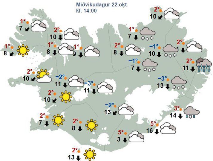 Á vef Veðurstofunnar segir að hiti verði á bilinu eitt til sex stig að deginum, en víða vægt frost í nótt. Spáð er éljum eða skafrenningi á Norður- og Austurlandi, en annars yfirleitt léttskýjað. Gular viðvaranir vegna hríðar eru í gild á Austurlandi og Austfjörðum og vegna vinds á Suðausturlandi. Fólk er hvatt til að sýna aðgát og fylgjast með veðurspám. Lægðin fjarlægist með kvöldinu og fer þá að draga úr vindi og úrkomu. „Á morgun, fimmtudag blæs áfram norðanátt með stöku éljum austanlands, en annars mun hægari vindur og bjart með köflum. Annað kvöld nálgast minniháttar úrkomusvæði úr vestri og gengur á land á Vestfjörðum. Hiti 1 til 6 stig að deginum, en víða vægt frost að næturlagi,“ segir í hugleiðingum veðurfræðings Spákort fyrir klukkan 14.Veður Veðurhorfur á landinu næstu daga Á fimmtudag: Norðlæg átt, 5-13 m/s, hvassast austast. Dálítil él á Norður- og Austurlanid, en annars víða léttskýjað. Vestlægari og dálítil slydda eða rigning á Vestfjörðum um kvöldið. Hiti 0 til 6 stig. Á föstudag: Norðvestlæg eða beytileg átt, 3-10 m/s dálítil slydda eða rigning vestantil og hiti 0 til 4 stig, en annars úrkomulítið og frost 0 til 5 stig. Á laugardag (fyrsti vetrardagur): Hægviðri og þykknar upp, en gengur í austan 8-15 m/s með snjókomu sunnan- og vestantil um kvöldið. Frost víða 0 til 5 stig. Á sunnudag og mánudag: Fremur hæg breytileg átt og dálítil slydda eða él á víð og dreif með hita nærri frostmarki. 'Á þriðjudag: Útlit fyrir norðanátt með snjókomu eða slyddu og kólnandi veðri.