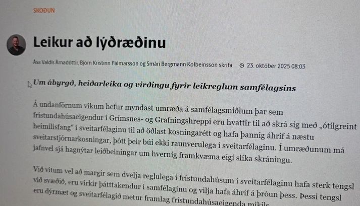 Grímsnes- og Grafningshreppur Mest lesið Nokkrar milljónir horfnar á örfáum vikum Innlent Rændur fyrir utan Costco um hábjartan dag Innlent Keypti stól í Góða hirðinum sem reyndist fágætur gripur Innlent Stúlka fannst á lífi í kassa í órafjarlægð frá heimili sínu Erlent Líta eigi á eignir landsbyggðafólks í Reykjavík sem sumarbústaði Innlent Sendi síðasta bréfið degi áður en fellibylurinn gekk yfir Innlent Óttast að námsbraut verði undir verði af frumvarpinu Innlent Segir hernum að undirbúa árás á Nígeríu Erlent Kúgaðist og öskurgrét yfir lýsingum sonarins Innlent Valhöll auglýst til sölu Innlent Fleiri fréttir Kosningahugur í eigendum frístundahúsa Keypti stól í Góða hirðinum sem reyndist fágætur gripur Getur gervigreindarsmjaður leitt til gervigreindargeðrofs? Söguleg óvissa á fasteignamarkaði og meðvirk gervigreind Óttast að námsbraut verði undir verði af frumvarpinu Kostnaður við stjórnsýslu borgarinnar mun hærri en landsmeðaltalið Tveir fá heilablóðfall á hverjum degi á Íslandi Breytingar sem litlu breyta og mokstursmenn þakka veðurguðunum Líta eigi á eignir landsbyggðafólks í Reykjavík sem sumarbústaði Sendi síðasta bréfið degi áður en fellibylurinn gekk yfir Borgin tekur út framkvæmdir við Vesturbæjarlaug Nokkrar milljónir horfnar á örfáum vikum Tilkynnt um bíl fullan af flugeldum Valhöll auglýst til sölu Rændur fyrir utan Costco um hábjartan dag Handtóku menn á tvítugsaldri vegna stórfelldrar fölsunar rafrænna skilríkja „Þetta er búið að ræna okkur innri ró“ Reiði meðal lögreglumanna Lögreglan vill ná tali af þessu fólki Lögreglustjóri situr sem fastast og spáin gerir krökkunum grikk Vonast til að geta bjargað föstum hnúfubak í fyrramálið Fagnar komu Dags um borð í evrubátinn Nær öllu innanlandsflugi aflýst Kúgaðist og öskurgrét yfir lýsingum sonarins Seðlabankinn rýmkar lánþegaskilyrði Mannekla hafi mikil áhrif á fangaverði Ástandið verði gjörbreytt í fyrramálið Íhugar ekki stöðu sína Þau sóttu um stöðu forstöðumanns Stafrænnar heilsu Hefði aldrei giskað á uppsagnir á hennar deild Sjá meira