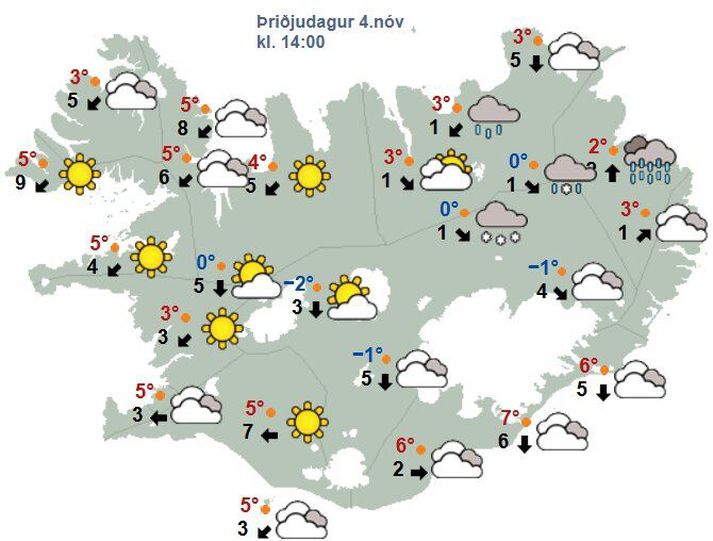 Norðlæg átt og lengst af þurrt suðvestantil Atli Ísleifsson skrifar 4. nóvember 2025 07:11 Hiti á landinu verður á bilinu núll til sex stig, mildast syðst. Vísir/Vilhelm Veðurstofan spáir norðlægri átt í dag, þremur til tíu metrum á sekúndu, en aðeins hvassari á Vestfjörðum í fyrstu. Á vef Veðurstofunnar segir að það verði dálítil slydda eða þokusuld norðan- og austantil og lítilsháttar væta sunnanlands, en lengst af þurrt á Suðvesturlandi. Hiti verður á bilinu núll til sex stig, mildast syðst. „Á morgun verður austlæg átt 3-10 m/s, en 10-15 við suðurströndina. Víða dálítil rigning eða súld, en bætir í úrkomu sunnantil eftir hádegi. Hiti breytist lítið. Á fimmtudag er útlit fyrir vaxandi austan- og norðaustanátt, 10-18 m/s um kvöldið. Dálítil rigning af og til, en lengst af þurrt fyrir norðan. Hiti 2 til 7 stig að deginum,“ segir í hugleiðingum veðurfræðings. Spákort fyrir klukkan 14 í dag.Veðurstofan Veðurhorfur á landinu næstu daga Á miðvikudag og fimmtudag: Austlæg átt 3-8 m/s, en 8-13 við suðurströndina. Skýjað með köflum og sums staðar lítilsháttar skúrir eða él, en lengst af þurrt norðvestanlands. Hiti 0 til 7 stig að deginum, mildast syðst. Á föstudag: Norðaustan 5-13, en heldur hvassari syðst. Snjókoma eða rigning með köflum sunnan- og austanlands, en þurrt að kalla norðan- og vestantil. Hiti breytist lítið. Á laugardag: Norðaustan 8-15. Rigning eða slydda, en snjókoma á heiðum. Styttir upp á Suðvestur- og Vesturlandi, en hvessir og fer að rigna þar um kvöldið. Hiti víða á bilinu 0 til 5 stig. Á sunnudag: Austan- og suðaustanátt og rigning eða slydda, einkum sunnan- og austanlands. Hiti 2 til 10 stig, mildast á Suðurlandi. Á mánudag: Austanátt með rigningu, en slydda eða snjókoma á heiðum. Dregur úr ofankomu norðanlands þegar líður á daginn. Hiti 4 til 9 stig. Veður Mest lesið Harpa Elín Haraldsdóttir er látin Innlent Lögreglan innsiglaði Flóka Innlent Snúin staða Sönnu og sameiginlegt framboð virðist ekki í kortunum Innlent Ítrekar hótanir sínar og hvetur íbúa til að kjósa Cuomo Erlent Ölvaður en ekki barnaníðingur Innlent Líklegast að Reykjavíkurleiðin taki breytingum eftir umsagnir Innlent Tveir reyndir lögreglumenn ákærðir fyrir brot í starfi Innlent Ætlar ekki að láta „óða“ Demókrata kúga sig Erlent Dick Cheney, einn arkítekta Íraksstríðsins, er látinn Erlent Með meðvitund fastur í rústunum en lést á leið á sjúkrahús Erlent Fleiri fréttir Norðlæg átt og lengst af þurrt suðvestantil Þykknar upp sunnan heiða undir kvöld Hvassast á Vestfjörðum Léttir til suðvestanlands Verður líklega mikið eftir af snjó og klaka Hvasst, hlýtt og von á asahláku eða glerhálku „Þetta verður allt saman stórvarasamt í fyrramálið“ Gular veðurviðvaranir víða um land Frostið náði næstum 20 stigum á Sandskeiði Djúp lægð nálgast landið úr suðri Nýtt snjódýptarmet í Reykjavík í október Hlýni á föstudag og snjórinn geti horfið í næstu viku Appelsínugular viðvaranir orðnar að gulum Miklar tafir hjá strætó og vagnar fastir Allur floti Vegagerðar úti að ryðja snjó Veðurvaktin: Allt á kafi í snjó á metdegi Mildari spá í kortunum Gular viðvaranir vegna snjókomunnar suðvestantil Um sautján stiga frost í Skagafirði í nótt Frost komst í fjórtán stig í nótt Norðanáttin gengur niður Klukkustunda bið eftir dekkjaskiptum í vetrarparadísinni Stormur eða hvassviðri suðaustantil Gul viðvörun á landinu sunnan- og austanverðu Svöl norðanátt og hálka á vegum Stefnir í fyrstu hálku haustsins á höfuðborgarsvæðinu Rigning eða slydda suðvestantil Kólnar í veðri næstu daga Hægviðri og þokusúld framan af degi Hæg breytileg átt og dálítil væta Sjá meira