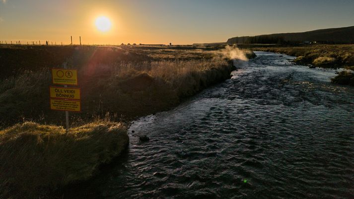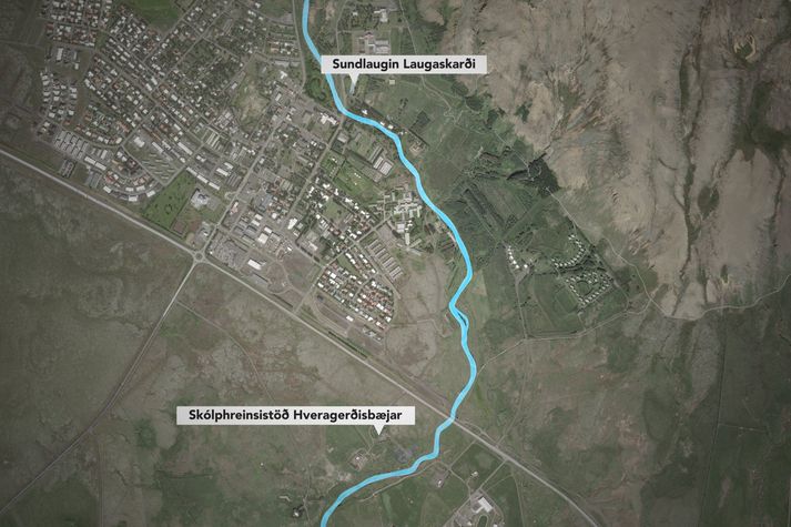 Affall frá meira en tveggja áratuga gamalli skólphreinsistöð Hveragerðisbæjar fer út í Varmá. Frá því að stöðin var tekin í notkun hefur Hvergerðingum fjölgað um 75 prósent og annar hún ekki lengur álaginu. Undanfarin ár hefur saurgerlamengun mælst langt yfir viðmiðunarmörkum í Varmá þar sem hún rennur í gegnum Ölfus. Af þessum sökum hefur veiði í ánni, sem er á náttúruminjaskrá Umhverfis- og orkustofnunar, verið bönnuð síðustu þrjú sumur. „Athugið, á þessum stað hafa mælst há gildi kólígerla. Varist snertingu við vatnið. Unnið er að úrbótum,“ segir á skilti sem bannar veiði í Varmá í Ölfusi.Vísir/Anton Brink Fyrir tveimur árum réði Heilbrigðiseftirlit Suðurlands fólki frá því að vera nærri ánni vegna mengunarinnar. Þá hafði magn saurgerla reynst allt að tuttugu og fimm sinnum meira en miðað er við í reglugerðum um ástand vatns þegar sýni voru tekin. Til að bæta gráu ofan á svart drap klór frá sundlauginni í Laugaskarði í Hveragerði fisk í Varmá í apríl. Bæjaryfirvöld gerðu yfirvöldum ekki viðvart um óhappið fyrr en daginn eftir að það átti sér stað. Þetta var annað klórslysið sem olli fiskadauða í ánni á tveimur áratugum. Óhapp við sundlaugina í Laugaskarði varð til þess að klór komst í Varmá og drap seiði og fiska. Enn meiri fiskadauði varð árið 2007 þegar rúmlega þúsund lítrar af óblönduðum klór frá sundlauginni lentu í ánni.Vísir/Anton Brink Um fjörutíu íbúar í nágrenni Varmár skrifuðu undir erindi sem var sent umhverfis- og skipulagsnefnd Ölfuss í haust með formlegum athugasemdum við ástandið. Þar kvörtuðu þeir meðal annars undan því að ekki væri búandi við að klóaklykt legði yfir heilu hverfin í stilltu veðri og norðannátt. „Þetta er eins og að vera með sameign í blokk þar sem sá sem býr efst veitir rusli niður. Það hefur áhrif á þá sem búa fyrir neðan,“ segir Zophonías Friðrik Gunnarsson, formaður Veiðifélags Varmár og Þorleifslækjar sem býr á Læk í Ölfusi. Varmá rennur í gegnum Hveragerði. Skólphreinsistöðin er fyrir neðan þjóðveg 1 en affall frá henni rennur í Varmá, íbúum og veiðimönnum til ama.Vísir/Sara Eins og að standa við rotþró Þegar skólphreinsistöðin var reist upp úr aldamótin var henni ætlað að leysa viðvarandi klóakmengun í Varmá. Ekki leið þó á löngu þar til að hún gerði vart við sig aftur. Björn Kjartansson á Grásteini í Ölfusi, sem er um fimm hundruð metra frá skólphreinsistöðinni, segir smá lykt hafa komið frá ánni í hægri norðanátt, sérstaklega á veturna, síðustu ár. Hann hafi ekki æst sig mikið yfir óþefnum þar sem bæjaryfirvöld í Hveragerði hafi talað á þeim nótum að aðgerðir væru að hefjast til að ráða bót á stöðunni. Skólpmengað vatn í Varmá nærri affalli skólphreinsistöðvar Hveragerðisbæjar. Myndin tók Björn Kjartansson á Grásteini í Ölfusi nú í byrjun hausts.Björn Kjartansson Þegar hann kom heim til sín eitt kvöld í byrjun september hafi síðan verið megnasta lykt á planinu. „Þetta var eins og þú stæðir við rotþró. Þá eiginlega fylltist hjá mér mælirinn,“ segir Björn. Nú sé svo komið að lyktin finnist alla daga. Björn, sem hefur búið beggja vegna sveitarfélagsmarkanna, fullyrðir að fólk veigri sér við að kaupa íbúðir í neðsta hverfi Hveragerðis vegna lyktarinnar frá ánni. Annar fiskadauðinn vegna klórmengunar á átján árum Klórslysið í vor átti sér stað þegar starfsmenn Hveragerðisbæjar endurnýjuðu klórgeymi við sundlaugina í Laugaskarði. Botn í gamla geyminum gaf sig þegar honum var lyft upp þannig að klór sem var eftir í honum rann út í læk neðan við geymsluna og þaðan út í Varmá. Áætlað var að um þrjátíu til fimmtíu lítrar af fimmtán prósent klórlausn hefðu farið í lækinn, að því er sagði í bréfi sem Heilbrigðiseftirlit Suðurlands sendi Hveragerðisbæ 8. apríl. Affall frá sundlauginni í Laugaskarði út í Varmá. Klór barst út í læk sem rennur í ána í apríl.Vísir/Anton Brink Engu að síður bliknaði slysið í apríl í samanburði við það sem átti sér stað í lok nóvember árið 2007. Þá er áætlað að rúmlega þúsund lítrar af óblönduðum klór hafi runnið frá sundlauginni í Laugaskarði út í ána. Seiði og stærri fiskar drápust á að minnsta kosti fjögurra til fimm kílómetra kafla í ánni vegna þess enda var styrkur klórsins nokkur þúsund sinnum meiri en þarf til að drepa flesta fiska á skömmum tíma. Áætlað er að þrjátíu til fimmtíu lítrar af klórlausn hafi farið út í Varmá þegar óhapp varð við sundlaugina í Laugaskarði 2. apríl.Vísir/Anton Brink Tilkynnt um leið og grunur vaknaði Það var þó ekki Hveragerðisbær sem tilkynnti um óhappið með klórinn í vor. Heilbrigðiseftirlitið komst ekki á snoðir um mengunina fyrr en því barst tilkynning frá veiðifélaginu um dauða fiska í Varmá daginn eftir að slysið átti sér stað. Friðrik frá veiðifélaginu segir það alvarlegt að það hafi verið hann sjálfur sem hafi þurft að tilkynna um klórslysið í vor. Bæjaryfirvöld hafi engu að síður virst hafa vitað af því. „Það er ansi ámælisvert,“ segir hann. Dauður fiskur í Varmá eftir klórslys í sundlauginni í Hveragerði í apríl 2025.Aðsend Pétur Markan, bæjarstjóri Hveragerðisbæjar, segir að óhappið hafi verið tilkynnt til allra viðeigandi stofnana um leið og grunur vaknaði um það daginn eftir. Slysið hafi reynst minniháttar en bæjaryfirvöld taki það engu að síður alvarlega. Bærinn hafi þegar skilað inn úrbótaáætlun til heilbrigðiseftirlitsins til þess að fyrirbyggja að slys af þessu tagi endurtaki sig. Heilbrigðiseftirlitið krafðist þess að bærinn ré