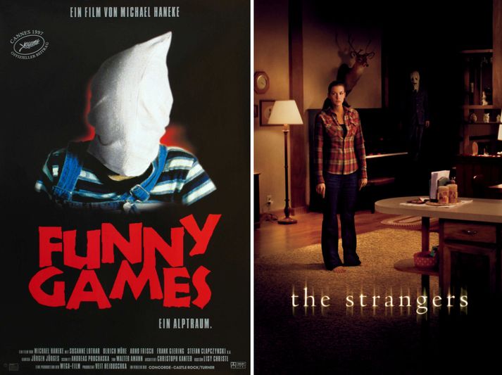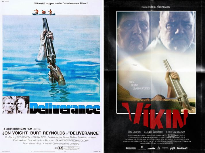 Bragi Þór er ekki aðeins leikstjóri Víkurinnar heldur einnig handritshöfundur, framleiðandi og klippari. Á tuttugu ára ferli hefur Bragi gert fjölda mynda, þó aðallega barna- og grínmyndir, þar á meðal fjórar myndir um Algjöran Sveppa, grínmyndina Harry & Heimir: Morð eru til alls fyrst (2014), Víti í Vestmannaeyjum (2018) og Birtu (2021). Leikhópurinn er í smærri kantinum; Örn Árnason, Margrét Ákadóttir og Leifur Sigurðarson skipa aðalhlutverkin þrjú meðan Ellert Ingimundarson er í aukahlutverki. Hjónin Björn (Örn) og Áslaug (Margrét) fljúga vestur á Hornstrandir í afskekktan bústað sinn. Hjónin eru svo gott sem ein í víkinni ef frá er talinn Gunnar (Ellert) sem býr á hinum enda hennar og stöku ferðamenn sem ganga þangað. Eitt kvöldið bankar einn slíkur upp á, Bandaríkjamaðurinn Jack (Leifur) sem færir óvæntar fréttir. Myndin var tekin upp að mestu á Fljótavík í Hornströndum en einnig lítillega á Suðurlandi. Tökur voru kláraðar á tæpri viku en flýta þurfti heimför vegna stormviðvörunar svo tökuliðið var í keppni við tímann. Sumarbústaðartryllir og óboðlegur skjár Fyrir áhorfið hafði maður fengið ágætis hugmynd um innihald Víkurinnar. Haglabyssan á plakati myndarinnar er greinileg vísun í plakat öræfatryllisins Deliverance (1973) sem fjallar um kanóferðalag fjögurra manna niður Cahulawassee-á sem breytist í baráttu upp á líf og dauða við íbúa svæðisins og grimma náttúruna. Plakat Víkurinnar er greinilega vísun í Deliverance. Stikla Víkurinnar minnti mig síðan á tvo aðra sálfræðitrylla. Annars vegar Funny Games (1997) eftir Michael Haneke þar sem tveir hvítklæddir ungir menn hrella austurríska fjölskyldu í sumarbústaðarfríi og hins vegar The Strangers (2008) þar sem par í bústað er áreitt af þremur ókunnugum manneskjum. Ég var því reiðubúinn fyrir íslenskan sumarbústaðartrylli en stillti sömuleiðis væntingum í hóf við að sjá greinileg fjárhagsleg takmörk myndarinnar. Tveir frægir innbrotstryllar sem gerast í sumarbústað. Síðastliðinn mánudag dró ég vin minn, hagfræðing sem elskar íslenskt efni, með mér í hið dauðadæmda bíóhús í Álfabakka sem stendur til að loka á nýju ári eftir 43 ára starfsemi. Það var eitthvað táknrænt við það að skjárinn í litlum bíósalnum var óboðlegur áhorfs vegna skemmda. Sirka níu dauðir bláir blettir, sem minntu helst á Karlsvagninn, dreifðu sér um hann allan og fylgdu áhorfendum gegnum myndina. „Ekki skrítið að Álfabakki sé að fara á hausinn,“ hugsaði ég með mér. Samt sættu sex sálir sig við þennan aðbúnað, þar með talið við vinirnir tveir. Aftur að myndinni sjálfri, hér á eftir verður komið inn á veigamikil atriði í söguþræði Víkurinnar þannig þeir sem vilja ekki láta spilla fyrir sér ættu að hoppa beint í niðurstöðurnar. Kómískt upphaf, kvartsár kona og refaklór Myndin hefst á flottu atriði úr lofti þar sem áhorfendur horfa út um glugga lítillar rellu sem Björn flýgur inn í víkina á Hornströndum. Þau hjónin ætla að reyna að njóta kyrrðarinnar í afskekktum bústaðnum en fríið fer brösuglega af stað. Flugvélin setur ágætis tón í byrjun. Björn lendir flugvélinni of harkalega þannig annað dekkið skaddast, vínflöskur þeirra hjóna brotna við höggið, refur klórar Áslaugu í framan, Björn sker á sér fingurinn á vélsög og þau ná hvorki net- né símasambandi. Þessar senur eru forboði um martraðardvöl hjónanna í bústaðnum og eiga að auka á óþægindatilfinningu áhorfenda og einangrunina. Á sama tíma eru senurnar frekar kómískar þó ekki sé ljóst hvort það sé með vilja gert. Þegar Björn sker á sér fingurinn er það sýnt hægt með undarlegri raftónlist undir og gervilegt blóðið skvettist eins og síróp á viðinn. Refurinn sem stekkur á Áslaugu og klórar hana virkar ansi gervilegur áður en klippt er á alvöru ref. Björn og Áslaug virðast ekki sérlega hamingjusöm. Ég hafði samt gaman af þessum atriðum og velti fyrir mér hvort myndin stefndi í átt að kómískri hrollvekju. Ódýr framleiðslan og furðulegar aðstæðurnar hefðu virkað vel til að ýta undir það. Bragi Þór hefur reynslu af léttari sögum þar sem ódýr framleiðslan virkar sem hluti af heildarmyndinni. Eftir því sem leið á var þó ljóst að tónninn átti að vera alvarlegur sem er helst komið til skila með drungalegri tónlistinni. Áhorfendur fá takmarkaðar upplýsingar um þau hjón í byrjun, Áslaug hefur verið hjá lækni og Björn stendur í einhverju lóðabraski, og innsýn inn í hjónabandið. Áslaug kvartar og kveinar yfir aðgerðarleysi eiginmannsins í ýmsum málum og hann eyðir stöðugt tali hennar – sígilt hrollvekjuminni. Hinum íbúa víkurinnar, Gunnar, bregður aðeins stuttlega fyrir þegar Björn slasar sig. Áhorfendur fá síðan að vita að hann er á leið til Ísafjarðar á sinni rellu og mun því skilja hjónin ein eftir í víkinni. Endurtekið efni, einangrun rofin og óskýr ógn Fyrsta kvöldið birtist bandaríski ferðamaðurinn Jack á palli hjónanna og segist týndur. Þau bjóða honum inn og hann ljóstrar þá upp um hina raunverulegu ástæðu fyrir veru sinni á Hornströndum: Hann telur Björn vera föður sinn og vill að hann gangist undir DNA-próf. Björn segir Kananum að snauta en í staðinn tekur Jack þau í gíslingu. Næsta klukkutímann fylgjast áhorfendur með endurteknum tilraunum þeirra hjóna til að losna úr haldi Jacks. Myndin verður fyrir vikið mjög endurtekningasöm, aftur og aftur reyna þau hjón að flýja úr bústaðnum eða grípa til vopna án árangurs. Senurnar eru keimlíkar og þeim fylgja engar raunverulegar vendingar, afleiðingar eða breytingar á stöðu mála. Spennutryllar þar sem fólk er tekið í gíslingu eru n
