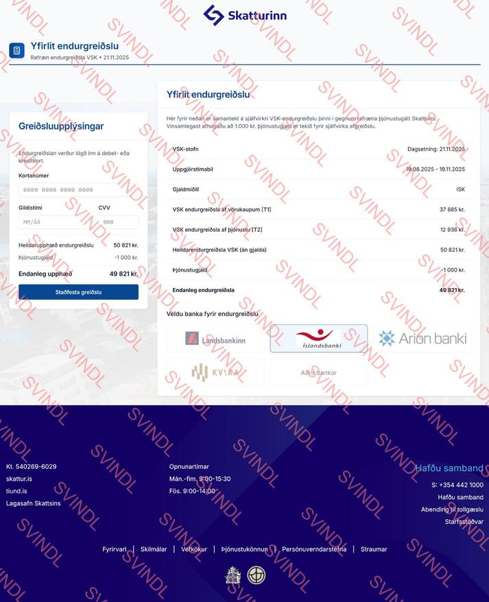 Vara við netsvikum í nafni Skattsins Oddur Ævar Gunnarsson skrifar 21. nóvember 2025 14:17 Um svik er að ræða. Lögreglan á höfuðbogarsvæðinu varar við svokölluðum vefveiðum í nafni Skattsins. Embættinu hafa borist tilkynningar vegna málsins, að því er fram kemur í tilkynningu. Þar segir að svindlið fari fram með þeim hætti að viðtakandi fær tölvupóst. Þar er viðtakanda tilkynnt að það liggi fyrir ógreidd krafa sem eigi að greiða samdægurs. Í tölvupóstinum er einnig hlekkur á www.island.is/greida, en á bakvið þennan hlekk er vefsíða sem er ekki tengd island.is heldur er hún tengd við greiðslugátt netsvikaranna. Fréttastofu hefur borist ábendingar um að tölvupósturinn sem um ræðir og vefsíðan sem hún vísar til séu mjög raunveruleg í útliti. Á vefsíðunni er svo óskað eftir kennitölu, símanúmeri og vali á viðskiptabanka áður en notandinn er fluttur yfir á greiðslusíða. Svikasíðan stelur kennitölu, símanúmeri og kreditkortaupplýsingum þeirra sem fylla út þessar upplýsingar. Svikin sem um ræðir geta virst mjög raunveruleg. Opinberar stofnanir biðji aldrei um bankaupplýsingar Lögregla hvetur almenning til þess að vera á varðbergi gagnvart slíkum fjársvikum og minnir fólk á að skoða vel og vandlega slóðina á greiðslusíðum. Oft séu vefveiðivefsíður á .app, .top, .xyz lénum en alls ekki er hægt að útiloka að .is lén séu notuð við vefveiðarnar. Minnt er á að opinber vefur Skattsins er skatturinn.is. Opinberar stofnanir biðji aldrei um banka- eða kreditkortaupplýsingar í tölvupósti. Þá er fólk beðið um að smella ekki á hlekki sem þau fá í grunsamlegum tölvupóstum. Sé fólk í vafa geti það haft beint samband við Skattinn í síma 442-1000. Hafi fólk smellt á slíkan svikahlekk eða orðið fyrir fjársvikum biður lögregla það um að hafa strax samband við bankann, hafa samband við lögreglu í síma 444-1000 og er fólk beðið um að safna upplýsingum um atvikið og senda á cybercrime@lrh.is. Lögreglumál Mest lesið Skipulagðir glæpahópar farnir að útvista ofbeldi Innlent Svona lítur friðaráætlun Bandaríkjamanna og Rússa út Erlent Stöðvar framkvæmdir við nýja Kaffistofu Samhjálpar Innlent Gjörunnin matvæli skaðleg öllum líffærum: „Það er fólk í skurðstofubúningum að búa matinn til“ Innlent Aðgerðir í þágu jafnréttis munu jafngilda mannréttindabrotum Erlent Sjálfa kom í bakið á þrautreyndum dópsala Innlent Skildi vegabréfið eftir Innlent Grunaðir um að hafa komið til landsins til þess eins að stela Innlent Pras úr Fugees dæmdur í fjórtán ára fangelsi Erlent Margir skorað á Ingibjörgu í formanninn Innlent Fleiri fréttir Stöðvar framkvæmdir við nýja Kaffistofu Samhjálpar Öryrkjar fá nú síður gjafsókn Fjörðurinn orðinn tvöfalt stærri Sveinn Óskar leiðir listann áfram Foreldrar eigi líka að leggja símann frá sér Samgönguáætlun ekki afgreidd á haustþingi Spáir enn desembergosi Ný fjármögnunarleið að ryðja sér til rúms og friðaráætlun í Úkraínu gagnrýnd Margir skorað á Ingibjörgu í formanninn Játaði líkamsárás en sleppur í bili vegna tölvubréfs dómara Bílvelta og árekstur í hálkunni Vísbendingar um að færri unglingar drekki áfengi Ráðin bæjarritari í Hveragerði Vilja tryggja stöðu ungs fólks í prófkjöri Samfylkingarinnar Kanna hug Grindvíkinga til framtíðar í Grindavík Skipulagðir glæpahópar farnir að útvista ofbeldi Grunaðir um að hafa komið til landsins til þess eins að stela Sjálfa kom í bakið á þrautreyndum dópsala Í gæsluvarðhaldi grunuð um þjófnaði víða í Reykjavík Gerir kröfu um að fjármagn fylgi barni í vímuefnavanda Gjörunnin matvæli skaðleg öllum líffærum: „Það er fólk í skurðstofubúningum að búa matinn til“ Skildi vegabréfið eftir „Ég hélt það væri skotárás í gangi“ Ísland útsöluvara í norrænum samanburði Krefjast þess að hætt verði að mismuna börnum sem missa foreldri Miðflokkur skákar Sjálfstæðisflokknum: „Stórmerkileg niðurstaða“ „Stórmerkileg niðurstaða“ í nýrri könnun Hilda Jana fer ekki aftur fram fyrir Samfylkingu á Akureyri Kjaradeilu flugumferðarstjóra og Isavia vísað til gerðardóms Sex ára dómur yfir Jóni Inga höfuðpaur stendur Sjá meira