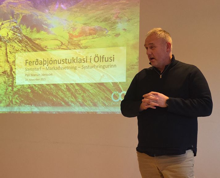 Nýjungar og mörg tækifæri í ferðaþjónustu í Ölfusi Magnús Hlynur Hreiðarsson skrifar 22. nóvember 2025 14:04 Páll Marvin Jónsson, sem stýrir Ölfus Cluster verkefninu og við heyrðum líka í Ástu Kristínu Sigurjónsdóttur, framkvæmdastjóri Íslenska ferðaklasans, sem skrifuðu undir samstarfssamning á fundinum í Þorlákshöfn. Magnús Hlynur Hreiðarsson Mikill hugur er í íbúum í Ölfusi að styrkja enn frekar ferðaþjónustu í sveitarfélaginu með margvíslegum hætti og er ein hugmyndin að búa til svokallaðan „Eldhring“ svipað og Gullna hringinn svonefnda. Fjölmennur fundur þar sem forsvarsfólk ferðaþjónustu í Sveitarfélaginu Ölfusi og fleiri góðir gestir var haldin í Ráðhúsi Ölfus í Þorlákshöfn á fimmtudaginn þar sem farið var yfir stöðu ferðaþjónustu í sveitarfélaginu og horft til framtíðar. Á fundinum var meðal annars skrifað undir samstarfssamning á milli Ölfus Cluster við Íslenska ferðaklasans. Páll Marvin Jónsson fer fyrir Ölfus Cluster og Ásta Kristín Sigurjónsdóttir er framkvæmdastjóri íslenska ferðaklasans. „Þetta hljómar mjög spennandi og þvílíkt tækifæri í þessu sveitarfélagi hér og í rauninni kannski ekkert allir, sem gera sér grein fyrir því hvað það er víðfeðmt og hvað það er rosaleg fjölbreytni í atvinnulífinu og þar á ferðaþjónustan svo mikið inni,” segir Ásta Kristín. „Við höfum svo mikið land, þetta er svo stórt landsvæði og fallegt og oft er fegurðin í einfaldleikanum eins og hérna þar sem engir skógar byrgja sýn og er oft svo fallegt en þá er útsýnið svo mikið og fallegt og auðvitað heitu svæðin,” segir Páll Marvin. Páll Marvin Jónsson, sem fer fyrir Ölfus Cluster stýrði fundinum af röggsemi.Magnús Hlynur Hreiðarsson Páll Marvin og Ásta Kristín er nú að skipuleggja nýja og spennandi leið fyrir ferðamenn en vinnuheiti hans er “Eldhringurinn” Ein af glærum fundarins.Magnús Hlynur Hreiðarsson „Hugmyndin er að búa til tengingu hérna á milli, Reykjanesi og Ölfus og jafnvel inn á Suðurlandið með svona eins konar systurhring Gullhringsins og Eldfjallaleiðarinnar. Þannig að þetta eru bara tækifæri til að efla samstarfið innan þessara svæða,” sagði Páll Marvin. Heimasíða Ölfus Cluster Ölfus Ferðalög Ferðaþjónusta Mest lesið Kvígurnar kvaddar eftir meinta kúvendingu Landsvirkjunar Innlent Björk og Rosalía í hart við íslenska ríkið Innlent Íbúar grátandi og í miklu uppnámi yfir flutningi Kaffistofunnar Innlent Ungur drengur fékk púður úr flugeldi í augað Innlent „Fasistinn“ og „kommúnistinn“ grófu stríðsöxina Erlent Ósætti um frysta sjóði Rússa: „Witkoff þarf á geðlækni að halda“ Erlent Staðsetning flugeldanna endurskoðuð vegna drengsins Innlent Þrír læknar hafa sagt upp á Akureyri vegna álags Innlent Hættir á þingi vegna deilna við Trump Erlent Pútín tekur vel í „friðaráætlun Trumps“ Erlent Fleiri fréttir Staðsetning flugeldanna endurskoðuð vegna drengsins Björk og Rosalía í hart við íslenska ríkið Þrír læknar hafa sagt upp á Akureyri vegna álags Læknaskortur á Akureyri og Björk og Rosalía í hart við ríkið Endaði á ljósastaur eftir flótta undan lögreglu Kvígurnar kvaddar eftir meinta kúvendingu Landsvirkjunar Ungt fólk glími við offitu eftir einangrun í kjölfar Covid Ungur drengur fékk púður úr flugeldi í augað Íbúar grátandi og í miklu uppnámi yfir flutningi Kaffistofunnar Viðreisn hafi tekið upp málflutning Miðflokksins Hernaðarstuðningur hækkar ekki og Rutte kunnugt um „íslenska öryggismódelið“ 80% nemenda á Laugarvatni eru í kór menntaskólans Ráðherra hvatti börn til þess að mótmæla bókstafakerfi Flestir vilja að störf sérstaks saksóknara verði rannsökuð Meira í varnarmál og heitar umræður í beinni Erlendum vasaþjófum vísað úr landi Stöðvuðu stækkun Sigöldustöðvar Kanna fýsileika landeldis á Bakka Hyggjast reisa fjörutíu íbúðir í raðhúsum í Breiðholti Vara við netsvikum í nafni Skattsins Tæp tvö ár fyrir smygl á tæpum tveimur kílóum af kókaíni Hafa áhyggjur af fjármögnun loftslagsaðgerða stjórnvalda Stöðvar framkvæmdir við nýja Kaffistofu Samhjálpar Öryrkjar fá nú síður gjafsókn Fjörðurinn orðinn tvöfalt stærri Sveinn Óskar leiðir listann áfram Foreldrar eigi líka að leggja símann frá sér Samgönguáætlun ekki afgreidd á haustþingi Spáir enn desembergosi Ný fjármögnunarleið að ryðja sér til rúms og friðaráætlun í Úkraínu gagnrýnd Sjá meira