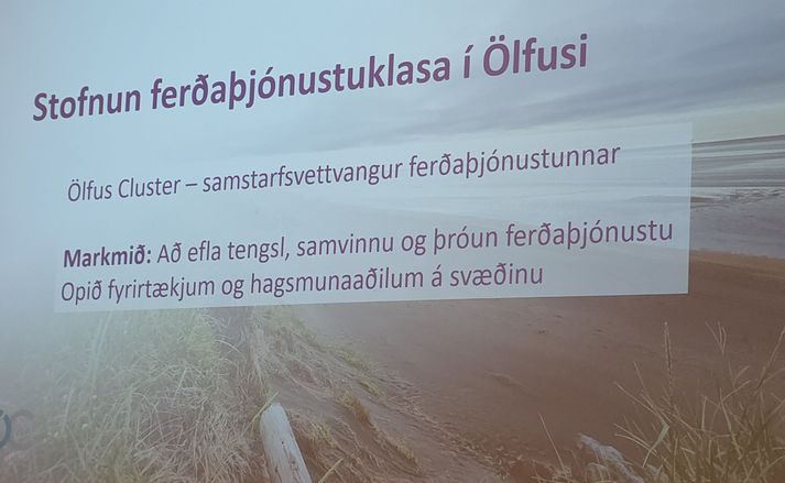 Fjölmennur fundur þar sem forsvarsfólk ferðaþjónustu í Sveitarfélaginu Ölfusi og fleiri góðir gestir var haldin í Ráðhúsi Ölfus í Þorlákshöfn á fimmtudaginn þar sem farið var yfir stöðu ferðaþjónustu í sveitarfélaginu og horft til framtíðar. Á fundinum var meðal annars skrifað undir samstarfssamning á milli Ölfus Cluster við Íslenska ferðaklasans. Páll Marvin Jónsson fer fyrir Ölfus Cluster og Ásta Kristín Sigurjónsdóttir er framkvæmdastjóri íslenska ferðaklasans. „Þetta hljómar mjög spennandi og þvílíkt tækifæri í þessu sveitarfélagi hér og í rauninni kannski ekkert allir, sem gera sér grein fyrir því hvað það er víðfeðmt og hvað það er rosaleg fjölbreytni í atvinnulífinu og þar á ferðaþjónustan svo mikið inni,” segir Ásta Kristín. „Við höfum svo mikið land, þetta er svo stórt landsvæði og fallegt og oft er fegurðin í einfaldleikanum eins og hérna þar sem engir skógar byrgja sýn og er oft svo fallegt en þá er útsýnið svo mikið og fallegt og auðvitað heitu svæðin,” segir Páll Marvin. Páll Marvin Jónsson, sem fer fyrir Ölfus Cluster stýrði fundinum af röggsemi.Magnús Hlynur Hreiðarsson Páll Marvin og Ásta Kristín er nú að skipuleggja nýja og spennandi leið fyrir ferðamenn en vinnuheiti hans er “Eldhringurinn” Ein af glærum fundarins.Magnús Hlynur Hreiðarsson „Hugmyndin er að búa til tengingu hérna á milli, Reykjanesi og Ölfus og jafnvel inn á Suðurlandið með svona eins konar systurhring Gullhringsins og Eldfjallaleiðarinnar. Þannig að þetta eru bara tækifæri til að efla samstarfið innan þessara svæða,” sagði Páll Marvin. Heimasíða Ölfus Cluster