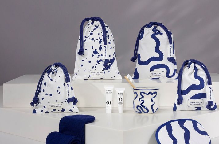 Ferðasettið samanstendur af fjölnota bómullarpokum og farþegar fá að velja þær vörur sem þeir vilja hafa í pokanum. Markmiðið er að stuðla að minni sóun og betri nýtingu, en innihald pokans nýtist bæði í fluginu og eftir ferðalagið. Settin eru í boði fyrir alla Saga Premium Flex og Saga Premium farþega, í flugum milli Íslands og Norður-Ameríku. „Þetta ferðasett er gjöf til farþega okkar og gerir flugið ánægjulegra, auk þess sem það verður minning um ferðalagið,“ segir um verkefnið á vefsíðu Icelandair. Hlaut verðlaun DanadrottningarInga Elín hóf feril sinn sem listakona aðeins tólf ára gömul og hefur frá unga aldri tileinkað lífi sínu listinni, með sérstakri ástríðu fyrir keramík. Hún lauk námi við Myndlistaskóla Reykjavíkur og hélt síðar til Danmerkur þar sem hún stundaði nám við Denmark Design (áður Skolen for Brugskunst). Þá hlaut hún verðlaun Danadrottningar fyrir lokaverkefni sitt, sem samanstóð af keramík og glerglösum.Náttúran er einkennandi í verkum hennar og fanga þau náttúruleg íslensk mótíf eins og vindinn, vatnið og flæðið. Þessi mótíf njóta sín best í þekktustu hönnun Ingu Elínar, Veltibollanum. Í gegnum árin hefur hún þróað og búið til yfir 200 mynstur sem prýða bollana.Fjölbreyttir valmöguleikarÁhafnameðlimir setja vörur í pokana eftir vali hvers og eins farþega. Þetta gerir ferðina persónulegri og stuðlar jafnframt að minni sóun.Eftirfarandi valmöguleikar eru í boði:Svefngrímur sem passa við pokahönnuninaTannburstasett í pappírspokaEyrnatappar í pappírspokaSokkarVarasalvi og handáburður frá sænska húðvörumerkinu Verso SkincareFarþegar geta valið hvað þeir vilja fá í sinn poka.Icelandair