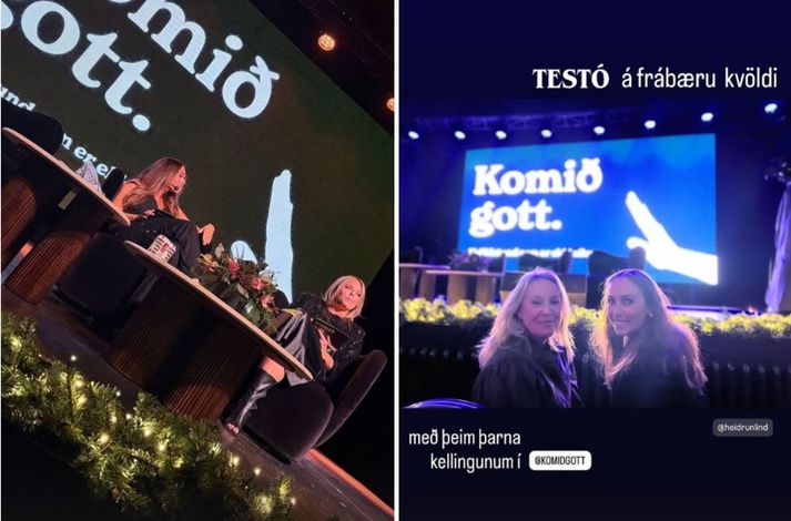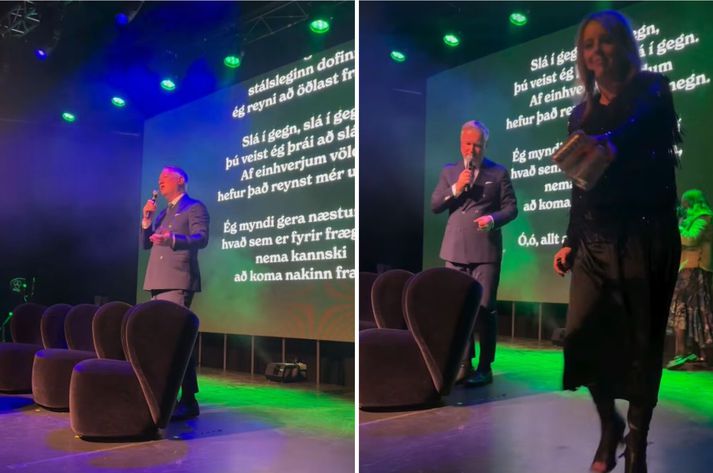 Kristín og Ólöf héldu sams konar viðburð fyrir ári síðan fyrir fullu húsi í Iðnó en nú varð Austurbæjarbíói fyrir valinu sem tekur töluvert fleiri gesti. Það gilti einu, uppselt varð á viðburðinn á tveimur mínútum þegar hann fór í sölu í nóvember. Venjulegur miði kostaði 8.900 krónur en einnig voru í boði „auðmannaborð“ fyrir fimm manns á 89.000 krónur. Heiðrún Lind og Sigríður Andersen létu sig ekki vanta. Fréttastofa var með fulltrúa á vettvangi í gær sem sagði Austurbæinn hafa verið kjaftfullan. Þá hafi góð tilboð verið á barnum sem skiluðu sér í ótæpilegri drykkju og æðisgenginni stemmingu. Hver gestur fékk gjafapoka sem innihélt ýmsa glaðninga og var mikið lagt í framleiðsluna með tveimur stórum skjáum. Meðal gesta í gær voru Marta María Winkel á Smartlandi, athafnakonan Lilja Pálmadóttir, fjölmiðlamaðurinn Stefán Einar Stefánsson, Heiðrún Lind Marteinsdóttir hjá SFS, Gerður Arinbjarnardóttir í Blush og fleiri góðir. Dansatriði, gestir grillaðir og Jens sló í gegn Viðburðurinn hófst á stóru og metnaðarfullu dansatriði þar sem Kristín og Ólöf dönsuðu við „Daddy Cool“ með Boney M ásamt góðum hópi fólks. Þar stigu á svið Magnús Ragnarsson, stórvinur stúlknanna; Snorri Másson, varaformaður Miðflokksins; Sigurður Ingi Jóhannsson, formaður Framsóknar; Hildur Björnsdóttir, oddviti Sjálfstæðisflokksins í Reykjavík; Sigríður Andersen, þingmaður Miðflokksins; Hildur Sverrisdóttir, þingmaður Sjálfstæðisflokksins, Einar Þorsteinsson, oddviti Framsóknar í Reykjavík og Sigríður Margrét Oddsdóttir, framkvæmdastjóri Samtaka Atvinnulífsins. Dansararnir glöddu gesti. Sigurður Ingi, Snorri Másson og Jens Garðar ræddu málin baksviðs. Eftir það tók við hlaðvarpshlutinn þar sem Ólöf og Kristín spjölluðu saman, baunuðu á hinn og þennan og fengu síðan góða gesti upp á svið til að grilla. Meðal þeirra sem fóru upp á svið voru Sólveig Anna Jónsdóttir, formaður Eflingar og Sigríður Andersen. Síðan var Jens Garðar Helgason, varaformaður Sjálfstæðisflokksins, dreginn upp á svið til að taka „Slá í gegn“ með Stuðmönnum og söng þá allur salurinn með. Ólöf Skaftadóttir réttir gestum Gull Lite meðan Jens Garðar syngur „Slá í gegn“.