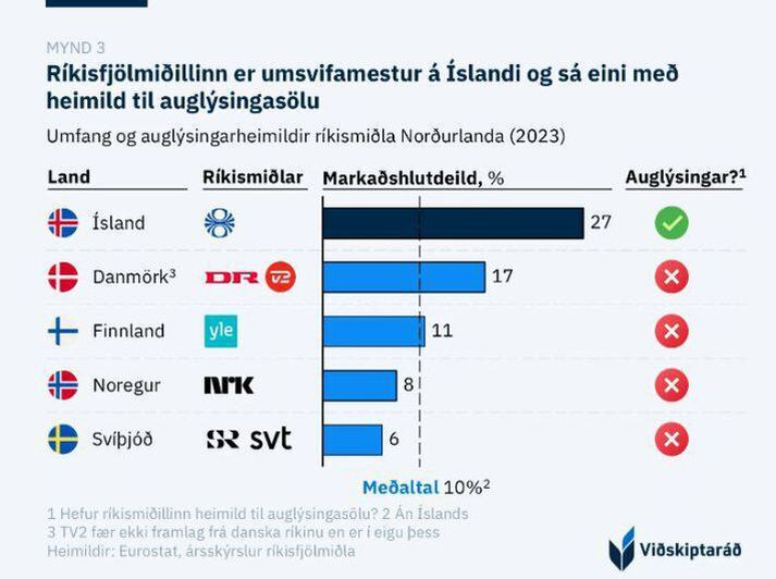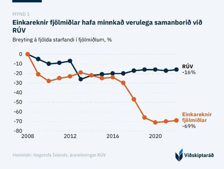 Logi Einarsson, menningar-, nýsköpunar- og háskólaráðherra, kynnti tillögur að aðgerðum í málefnum fjölmiðla á ríkisstjórnarfundi í morgun. Stefnt er að því að tillögurnar fari í almenna kynningu í þessum mánuði en um er að ræða tuttugu tillögur sem ætlað er styrkja stöðu íslenskra fjölmiðla. Breyttir tímar kalli á nýja nálgun að sögn ráðherra. Fjöldi starfsfólks á fjölmiðlum á Íslandi frá árinu 2008. Úr skýrslu Viðskiptaráðs. Fyrir viku síðan sagði Logi að hann myndi kynna pakka um aðgerðir á fjölmiðlamarkaði þegar hann var inntur eftir viðbrögðum við ákvörðun Sýnar um að hætta að flytja kvöldfréttir í sjónvarpi um helgar og á rauðum dögum. Lesa má úr dagskrá ríkisstjórnarfundarins sem var í dag, um þennan dagskrárlið, að breyttir tímar kalli á „nýja nálgun.“ Tillögurnar á vef ráðuneytisins byggja „á fjölþættum úrræðum sem vinna saman að því að styrkja íslenskan fjölmiðlamarkað í heild sinni og efla samkeppnishæfni hans gagnvart alþjóðlegum tæknirisum“. Vill leiðrétta rangfærslur Herdís Dröfn Fjeldsted, forstjóri Sýnar, segir í aðsendri grein á Vísi í dag að nauðsynlegt sé að leiðrétta rangfærslur um fjármögnun Ríkisútvarpsins og horfa raunsætt á skekkju á markaðnum. Á heimasíðu RÚV sé því haldið fram að þjónustutekjur stofnunarinnar hafi lækkað mikið að raunvirði og að „útvarpsgjaldið“ sé með því lægsta sem þekkist. „Þessar fullyrðingar standast ekki skoðun þegar gögnin eru rýnd. Eftir breytingar á lögum um opinber fjármál árið 2015 var mörkun tekna afnumin. Hið svokallaða útvarpsgjald rennur nú beint í ríkissjóð, líkt og aðrir skattar, en rekstrarframlag RÚV er ákvarðað á fjárlögum hverju sinni.“ Staðreyndin sé sú að rekstrarframlag ríkisins til RÚV hafi hækkað verulega. „Árið 2016 var framlagið 3,6 milljarðar króna, en í fjárlögum fyrir árið 2025 er gert ráð fyrir 6,45 milljörðum króna. Þegar tölurnar eru uppreiknaðar til verðlags í desember 2024 nemur raunhækkun rekstrarframlagsins rúmlega 23% frá árinu 2016. Á sama tíma hefur framlagið á hvern landsmann fylgt mannfjöldaþróun. Tal um fjársvelti á því ekki við rök að styðjast.“ RÚV skeri sig úr á Norðurlöndunum Samanburður við Norðurlöndin sýni að Ísland skeri sig úr þegar komi að umsvifum ríkisfjölmiðils. Herdís vísar til samanburðar sem Viðskiptaráð gerði á árinu þar sem fram kemur að RÚV sé með 27 prósenta markaðshlutdeild á meðan meðaltalið á Norðurlöndunum fimm sé tíu prósent. RÚV sé eini miðillinn sem njóti bæði opinberra framlaga og sé í virkri samkeppni um auglýsingar við einkarekna miðla. Úr skýrslu Viðskiptaráðs. „Þessi staða brenglar samkeppnisskilyrði verulega, þar sem ríkisrisinn nýtur bæði opinberrar meðgjafar og forskots á markaði.“ Þrjár tillögur að breytingum Herdís leggur til þrjár leiðir til að taka á rót vandans. Þar dugi engir plástrar. Takmarka þurfi fyrirverð RÚV á auglýsingamarkaði, horfa til Noregs eftir heilbrigðara fyrirkomulagi þar sem ríkið sé með samning við sjónvarpsstöðina TV2. „Sá samningur felur í sér hámarksgreiðslu frá ríkinu (150 milljónir NOK á ári) gegn því að TV2 sinni skilgreindum hlutverkum, svo sem fréttaþjónustu og barnaefni,“ segir Herdís. Að öðru leyti afli TV2 sinna tekna á markaði án beinna ríkisstyrkja. „Hér á landi fær RÚV hins vegar það besta úr báðum sviðsmyndum; ríkisstyrki sem eru tólffalt hærri en allir styrkir til einkarekinna fjölmiðla til samans, og fulla hlutdeild á auglýsingamarkaði. Einkareknum miðlum er svo skammtað úr hnefa.“ Þá þurfi jafnræði í regluverki með því að afnema óþarfa takmarkanir á innlenda miðla, sem erlendar efnisveitur og samfélagsmiðlar þurfi ekki að hlíta. „Markmiðið er ekki að veikja Ríkisútvarpið heldur að tryggja að hér geti þrifist heilbrigður fjölmiðlamarkaður þar sem samkeppni fer fram á jafnréttisgrundvelli. Núverandi kerfi, þar sem ríkisstyrktur aðili tekur til sín stóran hluta auglýsingamarkaðarins, gengur einfaldlega ekki upp.“ Vísir er í eigu Sýnar.