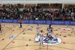 Sjáðu böngsunum rigna í Síkinu í kvöld Óskar Ófeigur Jónsson skrifar 5. desember 2025 20:21 Leikmenn Tindastóls fagna körfunni sem fékk allt Síkið til að henda böngsum inn á völlinn. Sýn Sport Körfuknattleiksdeild Tindastóls bauð á svokallaðan bangsaleik í kvöld þegar karlalið félagsins mætti ÍA í Bónus-deild karla í körfubolta. Leikurinn var styrktarleikur fyrir Einstök börn. Allir sem mættu með bangsa eða keyptu bangsa á staðnum fengu frítt á leikinn. Þegar Tindastóll skoraði sína fyrstu þriggja stiga körfu í kvöld var öllum böngsum kastað inn á völlinn, líkt og þekkist erlendis og í öðrum íþróttagreinum. Dedrick Basile setti niður þennan þrist eftir rúma mínútu í leiknum í kvöld. Hér fyrir neðan má sjá bangsunum rigna í Síkinu í kvöld Leikmenn Tindastóls munu svo gefa einstökum börnum á Norðurlandi bangsana í Síkinu eftir leik, og svo á Akureyri á laugardaginn. Klippa: Böngsunum rigndi í Síkinu Bónus-deild karla Tindastóll ÍA Mest lesið Trump fékk Friðarverðlaunin og setti verðlaunapeninginn strax um hálsinn Fótbolti Svona eru riðlarnir á HM í fótbolta 2026 Fótbolti „Sagði bara við hann: Djöfulsins fíflið þitt“ Íslenski boltinn Valur dregur sig úr Bose-bikarnum Íslenski boltinn Yngir upp í allt of gamalli deild Íslenski boltinn 19 ára og 1.300 leikja hrina Lebrons á enda Körfubolti „Ég er alveg jafn ringlaður og í áfalli og þið, og allur heimurinn“ Körfubolti Sjáðu böngsunum rigna í Síkinu í kvöld Körfubolti Krefst þess að lög kærustu hans verði ekki spiluð á leikjum Chiefs Sport „Aldrei séð svona ógnandi hegðun dómara til leikmanns“ Sport Fleiri fréttir Leik lokið: Tindastóll-ÍA 102-87 | Stólarnir unnu bangsaleikinn Uppgjörið: Valur - Njarðvík 94-86 | Valur átti síðasta áhlaupið og tryggði sér sigurinn Leik lokið: ÍR-Álftanes 97-86 | Skoruðu tíu fleiri þrista Sjáðu böngsunum rigna í Síkinu í kvöld Keflavík - KR | Gestirnir verið í veseni Frumsýna skemmtilegan gæðaleikmann í Breiðholti Spenna í Dalnum fyrir nýjum Kana 19 ára og 1.300 leikja hrina Lebrons á enda „Ég er alveg jafn ringlaður og í áfalli og þið, og allur heimurinn“ Hilmar með fínan leik í bikarsigri Uppgjörið: Njarðvík - Stjarnan 95-74| Aldrei í hættu hjá Njarðvíkingum Botnlið Hamars/Þórs nálægt sigri í Grindavík Böngsum mun rigna á Króknum á föstudaginn Losa sig við goðsögn: „Var að frétta að ég verð sendur heim“ Keishana: Allir sigrar eru yfirlýsing KR með yfirburði í nýliðaslag og Haukar rétt sluppu á Króknum Uppgjör: Valur - Keflavík 92-95 | Keflavík vann toppslaginn á Hlíðarenda Valur fær manninn sem tryggði Tindastóli titilinn á Hlíðarenda Litli bróðir Stephen Curry til Golden State „Tapaðir boltar kostuðu okkur leikinn“ Ítalir hleyptu D-riðlinum upp í loft Uppgjörið: Ísland - Bretland 84-90 | Þungt tap í Höllinni „Verðum að mæta tilbúnir“ Smellti kossi á mömmu sína sem birtist óvænt fyrir leik Doncic skoraði 35 stig gegn Dallas „Eini hópurinn sem hjálpaði mér að vera ég sjálfur“ Uppgjörið: Grindavík-Keflavík 95-103 | Keflavíkurkonur sýndu styrk sinn í Grindavík Stólarnir með annan sigurinn í röð Sjáðu kraftaverkið í riðli Íslands „Við sýndum mikinn töffaraskap í lokin“ Sjá meira