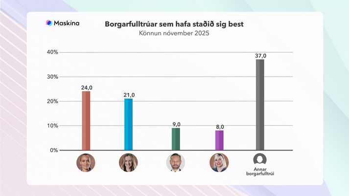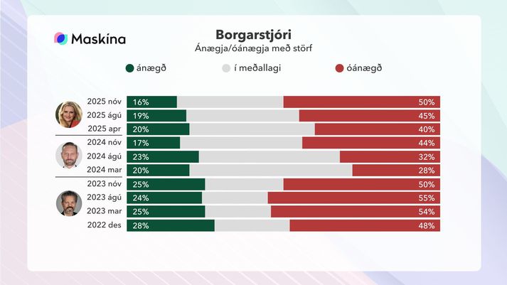 Ánægja borgarbúa með störf borgarstjóra hefur ekki verið minni í þrjú ár en óánægjan með störf Dags B. Eggertssonar náði meiri hæðum árið 2023, þegar hún mældist á bilinu 50 til 55 prósent frá mars fram í nóvember. Ánægja með störf Dags var hins vegar á sama tíma um 25 prósent. Helmingur borgarbúa er óánægður með störf borgarstjóra.Vísir/Hjalti Óánægja með störf meirihlutans er svipuð, um 51 prósent og ánægjan um 18 prósent. Ellefu prósent segjast ánægð með störf minnihlutans og 47 prósent segjast óánægð. Þetta er mjög svipað og í síðustu könnunum. Vinsældir Sönnu Magdalenu Mörtudóttur, borgarfulltrúa Sósíalista, eru enn mestar. 24 prósent borgarbúa segja hana hafa staðið sig best borgarfulltrúa á yfirstandandi kjörtímabili. Sanna Magdalena er enn vinsælust borgarfultrúa.Vísir/Hjalti Á eftir henni kemur Hildur Björnsdóttir, oddviti Sjálfstæðisflokksins, sem eykur vinsældir sínar frá síðustu könnun. Tuttugu og eitt prósent íbúa segir hana hafa staðið sig best á kjörtímabilinu en 17% voru þeirrar skoðunar í ágúst síðastliðnum. Þar á eftir kemur Einar Þorsteinsson fyrir Framsókn, en níu prósent telja hann hafa staðið sig best, og loks Dóra Björg Guðjónsdóttir Pírati sem sögð er standa sig best af átta prósent svarenda.