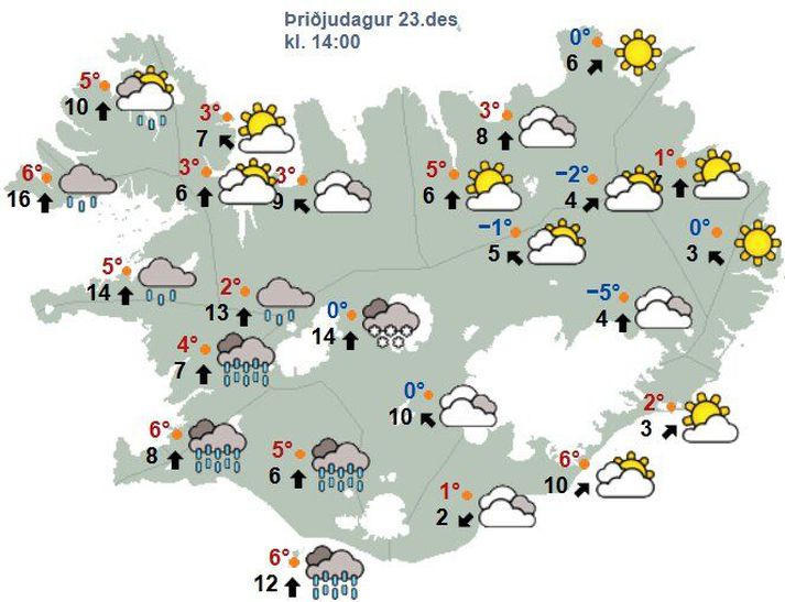 Þetta segir á vef Veðurstofunnar. Þar kemur fram að hvassasti kaflinn í þessu veðri verði væntanlega fyrripartinn á aðfangadag á Vestfjörðum, Norðurlandi vestra og Norðurlandi eystra. Þar megi búast við stormi eða roki á þessum slóðum og hviðurnar geta farið yfir 40 metrar á sekúndu. „Því hefur þessi kafli á þessum svæðum verið rammaður inn með appelsínugulri viðvörun. Þegar vindstyrkur er orðinn þetta mikill eru ekki bara lausir munir sem geta fokið, heldur geta byggingar á stöku stað skemmst, t.d. losnað þakplötur. Þessu sunnan veðri fylgir talsverð eða mikil rigning á sunnan- og vestanverðu landinu frá því síðdegis í dag og allan aðfangadag, gular viðvaranir vegna rigningar hafa því verið gefnar út. Útlit er fyrir minni úrkomu á jóladag, en einhver væta þó. Sunnanáttin færir einnig mjög hlýjan (og rakan) loftmassa yfir landið, ættaðan langt sunnan úr höfum. Hiti getur náð sér vel á strik við þessar aðstæður í hnjúkaþey á Norður- og Austurlandi. Það kæmi ekki á óvart að sjá 17-18 stig á einhverri mælistöð í þessum landshlutum áður en veðrinu lýkur, t.d. á aðfangadagskvöld eða að morgni jóladags. Þess má geta að hæsti hiti sem mælst hefur í desembermánuði á Íslandi eru 19.7 stig á Kvískerjum 2. desember 2019. Þá var sunnanátt á landinu, ekki ósvipuð þeirri sem nú er í kortunum. Því er ekki hægt að útiloka þann möguleika að desemberhitametið fallin nú um jólin, því hnjúkaþeyrinn getur verið brellinn og brögðóttur,“ segir í hugleiðingum veðurfræðings. Spákort fyrir klukkan 14 í dag.Veðurstofan Veðurhorfur á landinu næstu daga Á miðvikudag (aðfangadagur jóla): Sunnan 20-28 m/s, hvassast í vindstrengjum á norðanverðu landinu, en 13-20 sunnanlands. Dregur heldur úr vindi seinnipartinn. Talsverð rigning um landið sunnan- og vestanvert, en þurrt norðaustantil. Hiti 7 til 16 stig, hlýjast í hnjúkaþey á Norður- og Austurlandi. Á fimmtudag (jóladagur): Minnkandi sunnanátt, 13-20 síðdegis. Súld eða rigning með köflum, en yfirleitt þurrt á Norður- og Austurlandi. Áfram hlýtt í veðri. Hægari vestast á landinu um kvöldið og bætir í úrkomu. Á föstudag (annar í jólum): Suðvestan 8-13, en 13-18 á norðanverðu landinu fram á kvöld. Dálítil él eða slydduél, en styttir upp á austanverðu landinu. Hiti 0 til 5 stig. Á laugardag: Sunnanátt og dálítil væta sunnan- og vestanlands, annars þurrt. Hiti um eða undir frostmarki, en allt að 6 stigum á vestanverðu landinu. Á sunnudag: Fremur hæg suðvestlæg átt með stöku skúrum á Suður- og Vesturlandi, en bjart fyrir norðan og austan. Hiti breytist lítið. Á mánudag: Útlit fyrir suðvestlæga átt. Dálitlar skúrir og hiti 0 til 5 stig vestanlands en bjart og kalt fyrir austan.