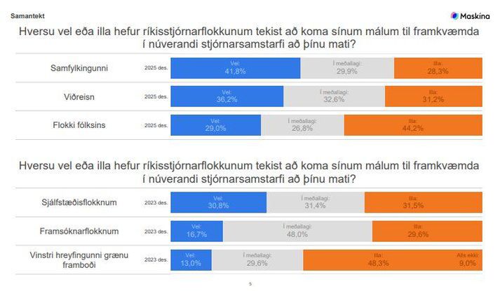 Niðurstöðurnar eru svipaðar og í fyrra þegar sama spurning var lögð fyrir þátttakendur Maskínukönnunar í desember. Þá sögðust 55 prósent bjartsýn fyrir árinu 2025 en færri sögðust svartsýnir fyrir því en nú, eða slétt tíu prósent. Þátttakendur voru spurðir hversu vel eða illa þeim þætti ríkisstjórnarflokkunum hafa tekist að koma málum sínum til framkvæmda í núverandi stjórnarsamstarfi. Samfylkingunni tókst að mati flestra vel til, eða tæpum 42 prósentum. Rúm 36 prósent töldu Viðreisn hafa tekist vel að koma málum sínum til framkvæmda en 29 prósent töldu Flokk fólksins hafa tekist það vel. Tæplega þriðjungur kjósenda taldi flokkunum hafa í meðallagi tekist að koma málum sínum til framkvæmda. Rúm 28 prósent telja Samfylkingunni hafa tekist það illa og 31 prósent telja Viðreisn hafa tekist illa til. Þá telja 44 prósent þátttakenda Flokki fólksins hafa tekist illa að koma málum sínum til framkvæmda. Niðurstöður sömu könnunar síðan í desember 2023 fylgja til samanburðar.Maskína Könnunin fór fram dagana 11. til 17. desember 2025 og voru svarendur 2.032 talsins.