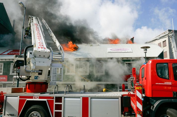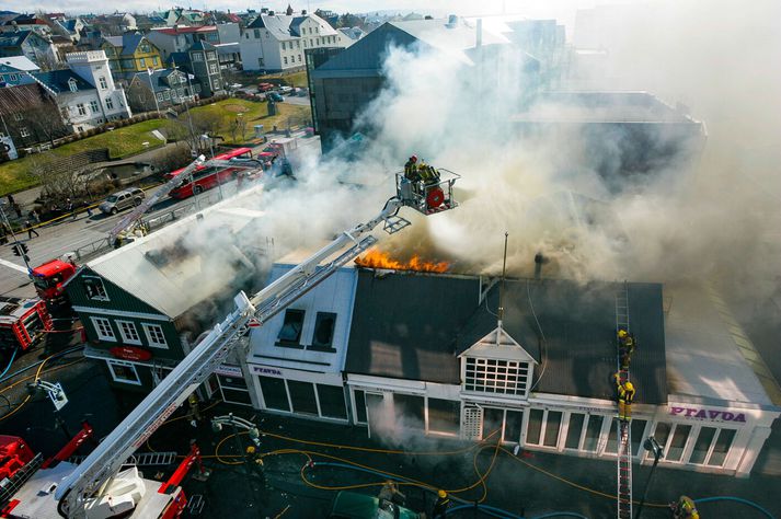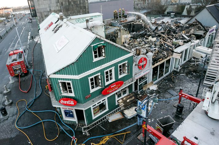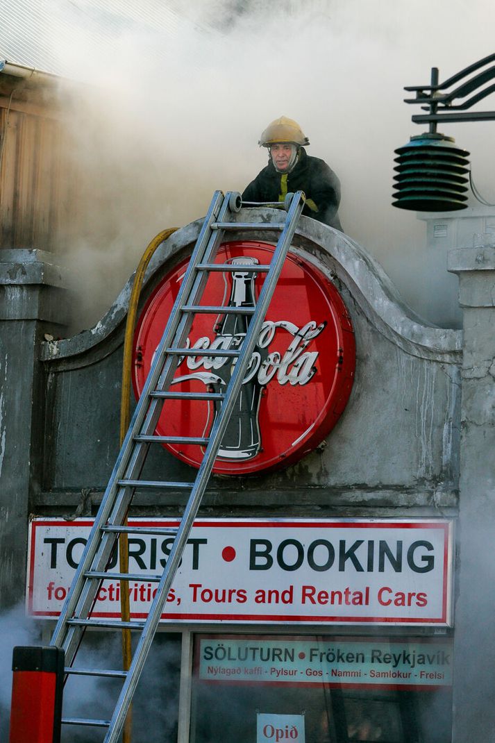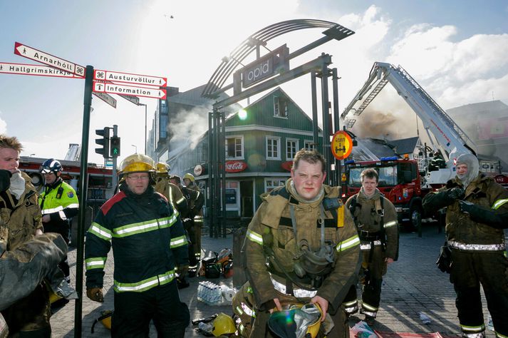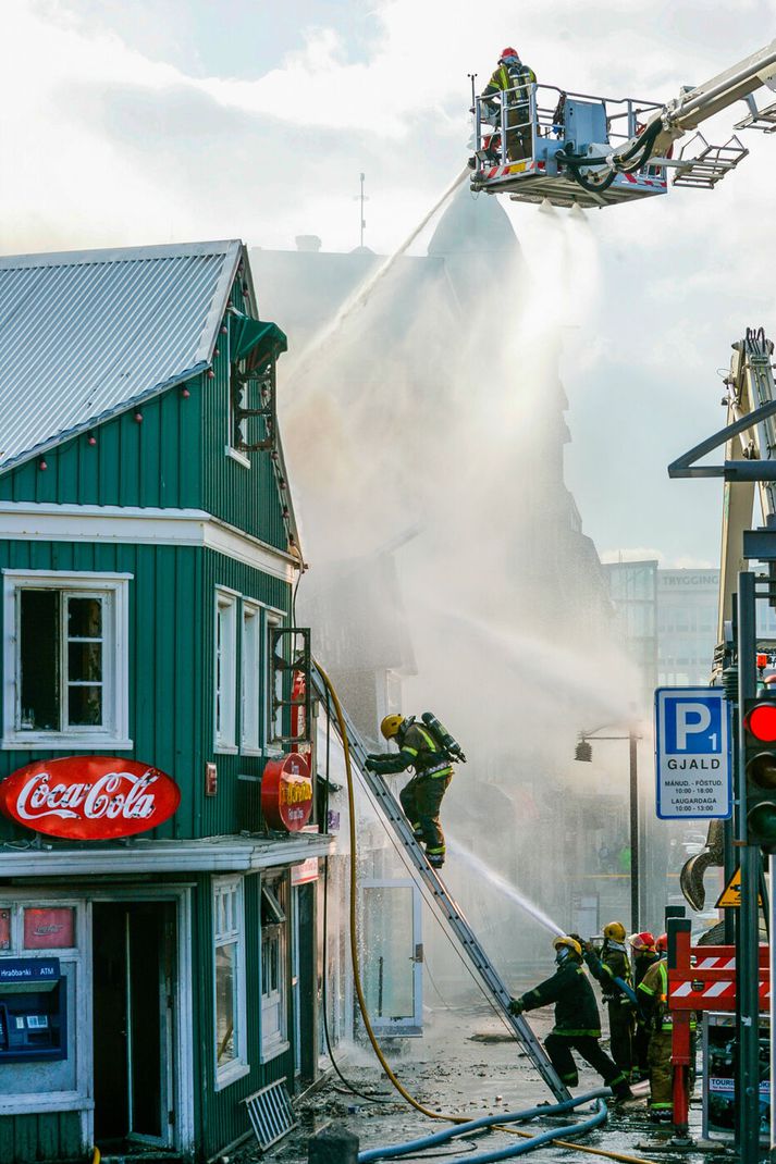 Vilhelm Gunnarsson, ljósmyndari Vísis var í miðborginni þennan örlagaríka dag og festi atburðina á filmu en myndirnar tók hann meðal annars þar sem hann stóð á þaki Héraðsdóms Reykjavíkur. Samkvæmt fyrstu upplýsingum kviknaði eldurinn í verslunarhúsnæði og náði fljótt tökum á fleiri húsum. Reykur og logar breiddust hratt út, þakið á Austurstræti 22 féll inn og húsin fylltust af þykkum, svörtum reyk. Fjöldi íbúa og gesta í miðbænum var fluttur á brott, meðal annars af nærliggjandi hótelum, þar sem reykskynjarar og brunavarnarkerfi fóru í gang.Vísir/Vilhelm Slökkvilið höfuðborgarsvæðisins kallaði strax til mikinn mannskap og naut aðstoðar frá öðrum slökkviliðsdeildum. Slökkvistarfið reyndist bæði erfitt og hættulegt.Vísir/Vilhelm Reykarmökkur lá yfir miðborginni. Reykurinn frá brunanum barst alla leið að Stúdentagörðum Háskóla Íslands í Skerjafirði og lögreglan bað íbúa í nágrenni við brunann um að loka gluggum og gera aðrar ráðstafanir eins og að kynda íbúðir sínar vel upp.Vísir/Vilhelm Slökkviliðsmenn unnu við afar krefjandi aðstæður, meðal annars inni í brennandi húsum þar sem hrunið var yfirvofandi.Vísir/Vilhelm Slökkvistarf stóð langt fram undir næsta morgun, þar sem markmiðið var ekki aðeins að ráða niðurlögum eldsins, heldur einnig að koma í veg fyrir að hann breiddist enn frekar út í þéttan byggðarkjarnann.Vísir/Vilhelm Mannfjöldinn safnaðist saman og fylgdist með störfum slökkviliðsins.Vísir/Vilhelm Þrátt fyrir umfang brunans urðu engin manntjón. Vísir/Vilhelm Reykurinn var svo mikill að hann sást víða úr borginni, þó hann hefði ekki áhrif á flugumferð frá Reykjavíkurflugvelli.Vísir/Vilhelm Eldurinn breiddist um húsin á horninu við Lækjargötu, Lækjargötu 2 þar sem Kebabhúsið var meðal annars til húsa, og Austurstræti 22 þar sem skemmtistaðurinn Pravda var til húsa og húsið þar á milli sem hýsti upplýsingamiðstöð fyrir ferðamenn og þar áður söluturninn Fröken Reykjavík.Vísir/Vilhelm Lögregla og slökkvilið fengu lof fyrir fumleysi og fagmennsku við rýmingu, umferðastjórnun og samhæfingu aðgerða.Vísir/Vilhelm Hornhúsið við Lækjargötu 2 sem skemmdist mikið var reist árið 1852. Þar voru meðal annars veitingastaðurinn Café Ópera, ölstofan Café Rósenberg og skyndibitastaðurinn Kebabhúsið.Vísir/Vilhelm Að loknum aðgerðum slökkviliðsins blasti sorgleg sjón við í miðbænum. Fjöldi húsa var annaðhvort stórskemmdur eða ónýtur, og spurningar vöknuðu strax um framtíð götunnar og enduruppbyggingu. Jón Viðar Matthíasson slökkviliðsstjóri, Vilhjálmur Þ. Vilhjálmsson þáverandi borgarstjóri og Stefán Eiríkisson þáverandi lögreglustjóri ræða málin.Vísir/Vilhelm Lækjargata 2 brann að hluta en húsið að Austurstræti 22 brann til kaldra kola. Bæði þessi hús eiga stóran sess í sögu Reykjavíkur.Vísir/Vilhelm Ljóst var að mikið menningarlegt og sögulegt tap hafði orðið, þar sem bruninn lagðist þungt á elsta húsakost Reykjavíkur. Stórbruninn í apríl 2007 markaði tímamót í umræðu um brunavarnir, varðveislu gamalla húsa og mikilvægi miðborgarinnar sem lifandi sögusviðs.Vísir/Vilhelm Atburðurinn situr enn í minni borgarbúa sem áminning um viðkvæmni byggðarinnar, og samstöðu samfélagsins þegar á reynir.