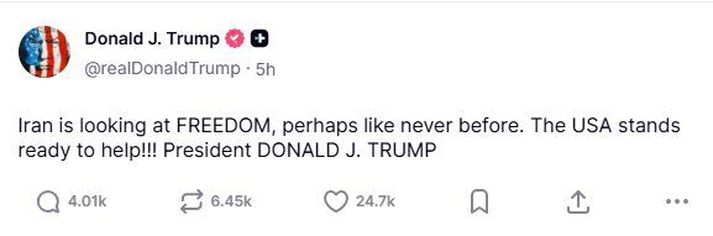 Samkvæmt umfjöllun BBC hefur verið haft eftir heilbrigðisstofnunum í landinu að ungt fólk hafi víða verið skotið í höfuðið eða hjartað. Aðalspítalinn í Teheran væri á neyðarstigi. Upplýsingar um fjölda látinna og slasaðra liggur ekki fyrir á þessu stigi máls en talið er að hundruð hafi látið lífið. Donald Trump Bandaríkjaforseti sagði á föstudeginum að ef mótmælendur yrðu drepnir, væru Bandaríkjamenn reiðubúnir að stíga inn í átökin. Á laugardeginum sagði hann að Íran væri að horfa fram á FRELSI, og Bandaríkin væru tilbúin að hjálpa þeim. Færsla Trumps. Yfirvöld í Íran hafa sakað Bandaríkjamenn um að standa á bak við mótmælin. Bandaríkin bæru ábyrgð á því að hafa gert friðsæl mótmæli að allsherjar óeirðum. Æðstiklerkurinn í Íran Khamenei, birti færslu á X með óræðum skilaboðum um von í hjörtum Írana. انشاءالله به زودیِ زود، خداوند احساس پیروزی را در دلهای همهی مردم ایران رواج بدهد. pic.twitter.com/KOrccvC9mh— KHAMENEI.IR | فارسی (@Khamenei_fa) January 10, 2026 Myndband þar sem gríðarlega stór hópur kvenna í höfuðborginni Teheran brennir Hijab slæður sínar hefur farið eins og eldur í sinu um samfélagsmiðla, en samkvæmt gildandi lögum í Íran er skylda fyrir konur að hylja hár sitt með slíkri slæðu og brot gegn þeim lögum varðar fimmtán ára fangelsi. Iranian women burning their hijabs in Tehran tonight. Protesters are also torching property linked to Islamic regime forces, including vehicles, mosques, and even their residences. This is a message not only to the regime, but for the whole world to see. pic.twitter.com/P1ve8el4u6— Dr. Maalouf (@realMaalouf) January 10, 2026 Íranskar konur hafa verið að birta myndir og myndbönd af sér á samfélagsmiðlum þar sem þær kveikja í útprentaðri mynd af æðstaklerkinum og kveikja í sígarettu með myndinni. Athæfið hefur orðið að hálfgerðri tískubylgju, og hafa konur víða um heim tekið upp á því að gera slíkt hið sama til að sýna þeim samstöðu. Þessi mótmælir í Teheran.X Nokkrar írönsku kvennanna sem taka þátt í mótmælunum.X Þessi kona er frönsk, en hefur ákveðið að sýna mótmælendum stuðning með því að kveikja í einum Khamenei.X