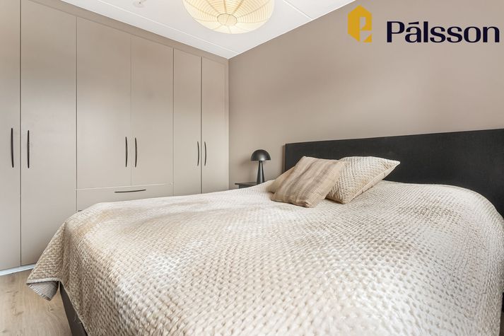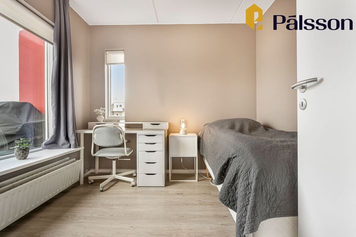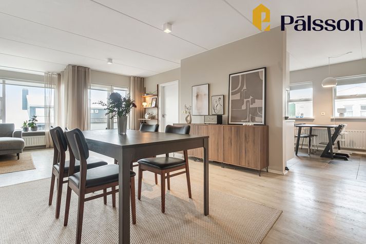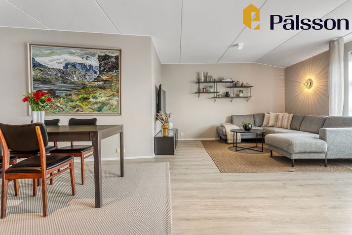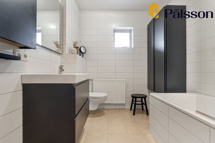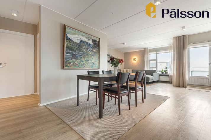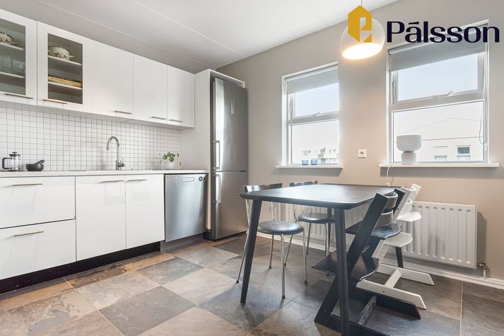 Ásett verð íbúðarinnar er 108 milljónir króna en um er að ræða efri hæð í tvíbýli sem var byggt árið 1996. Íbúðin er parketlögð og skiptist forstofu, eldhús, opið alrými með samliggjandi stofu og borðstofu þar sem útgengt er á rúmgóðar vestursvalir, þrjú svefnherbergi og baðherbergi. Sameiginleg köld geymsla er utan íbúðar. Íbúðin er vel staðsett, alveg við mörk Seltjarnarnesbæjar og Reykjavíkurborgar, og er stutt í þjónustu, skóla og útivist. Nánar má lesa um íbúðina á Fasteignavef Vísis. Maður kemur inn í hol og svo tekur við alrými með borðstofu og stofu. Handan við borstofuna er eldhúsið. Eldhúsið er flísalagt. Stofan er björt. Hjónasvefnherbergið. Krúttlegt lítið barnaherbergi. Eitt af svefnherbergjunum þremur. Inni á baði er baðkar.