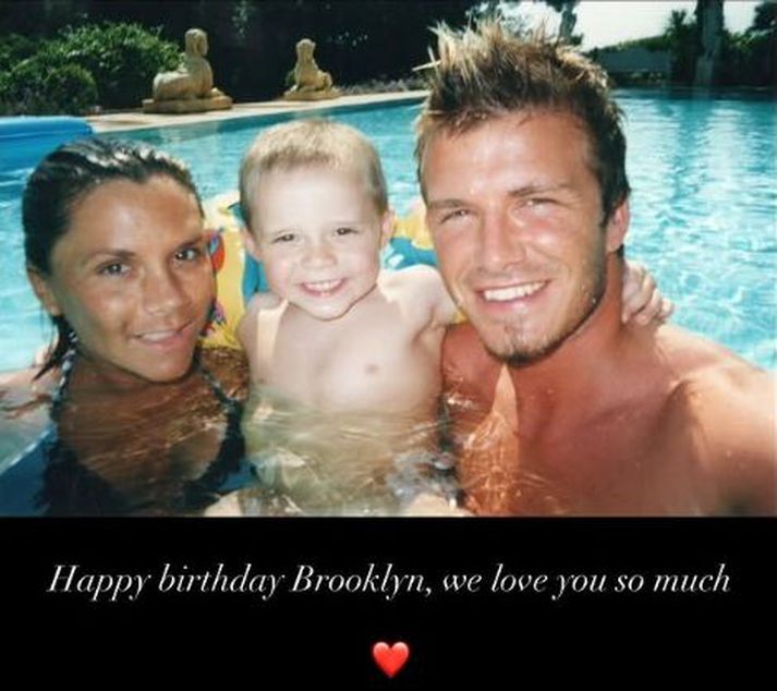 Brooklyn tjáði sig um deilur fjölskyldunnar í sex síðna færslu á Instagram 19. janúar síðastliðinn þar sem hann bar David og Victoriu þungum sökum og sakaði um lygar og pretti til þess að viðhalda fullkominni ímynd fjölskyldunnar. Erjurnar virðist mega rekja til brúðkaups Brooklyns og Nicolu Peltz þar sem sonurinn sagði móður sína hafa hagað sér ósæmilega. Deilt hefur verið um sannleiksgildi frásagnarinnar, plötusnúðurinn DJ Fat Tony, sem þeytti skífum í brúðkaupinu, virtist staðfesta frásögn Brooklyn meðan söngvarinn Marc Anthony, sem tróð þar upp, sagði atburðina hafa verið ýkta úr öllu hófi. Sjá einnig: Brúðurin hljóp grátandi út áður en Victoria dansaði við Brooklyn Hvorki David né Victoria hafa tjáð sig beint um yfirlýsingar Brooklyns. David fór þó í viðtal í janúar þar sem hann ræddi um samfélagsmiðlanotkun barna og sagði að börn mættu gera mistök. Þótti fólki hann vera þar að tala um Brooklyn. Fylgir foreldrunum ekki á miðlunum Foreldrarnir óskuðu Brooklyn síðan bæði til hamingju á Instagram-hringrásum sínum í dag en hann á 27 ára afmæli. Bæði birtu þau gamla sundlaugarmynd af sér með barnungum Brooklyn og skrifuðu við hana: „Tuttugu og sjö í dag 🥹. Til hamingju með daginn Bust, við elskum þig“ og „Til hamingju með daginn Brooklyn, við elskum þig svo mikið“. Lafði Victoria birti líka gamla mynd af mæðginunum saman með kveðjunni: „Til hamingju með 27 ára afmælið Brooklyn, ég elska þig svo mikið“. David birti sams konar mynd af feðgunum saman með kveðjunni: „Til hamingju með daginn Bust. Elska þig X.“ Myndin sem foreldrarnir deildu af syninum. Buster og Bust eru viðurnefni Davids fyrir elsta son sinn sem hann hefur jafnframt látið flúra á háls sinn. „Ég hef alltaf kallað Brooklyn Buster frá deginum sem hann fæddist,“ hefur David áður sagt. Brooklyn fylgir hvorki móður sinni né föður á Instagram þannig kveðjurnar munu sennilega ekki berast nema gegnum þriðja aðila.